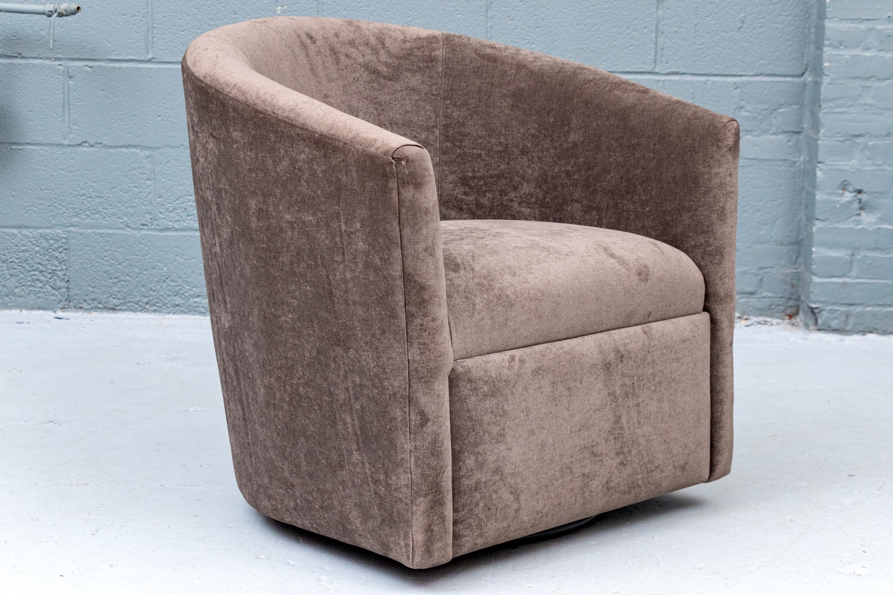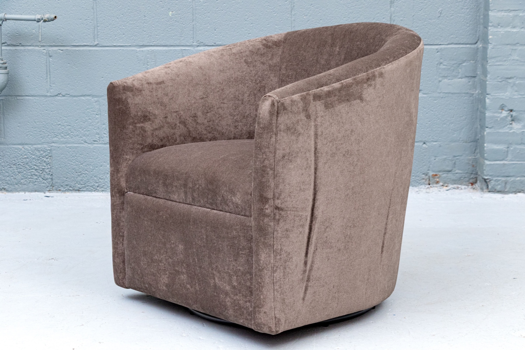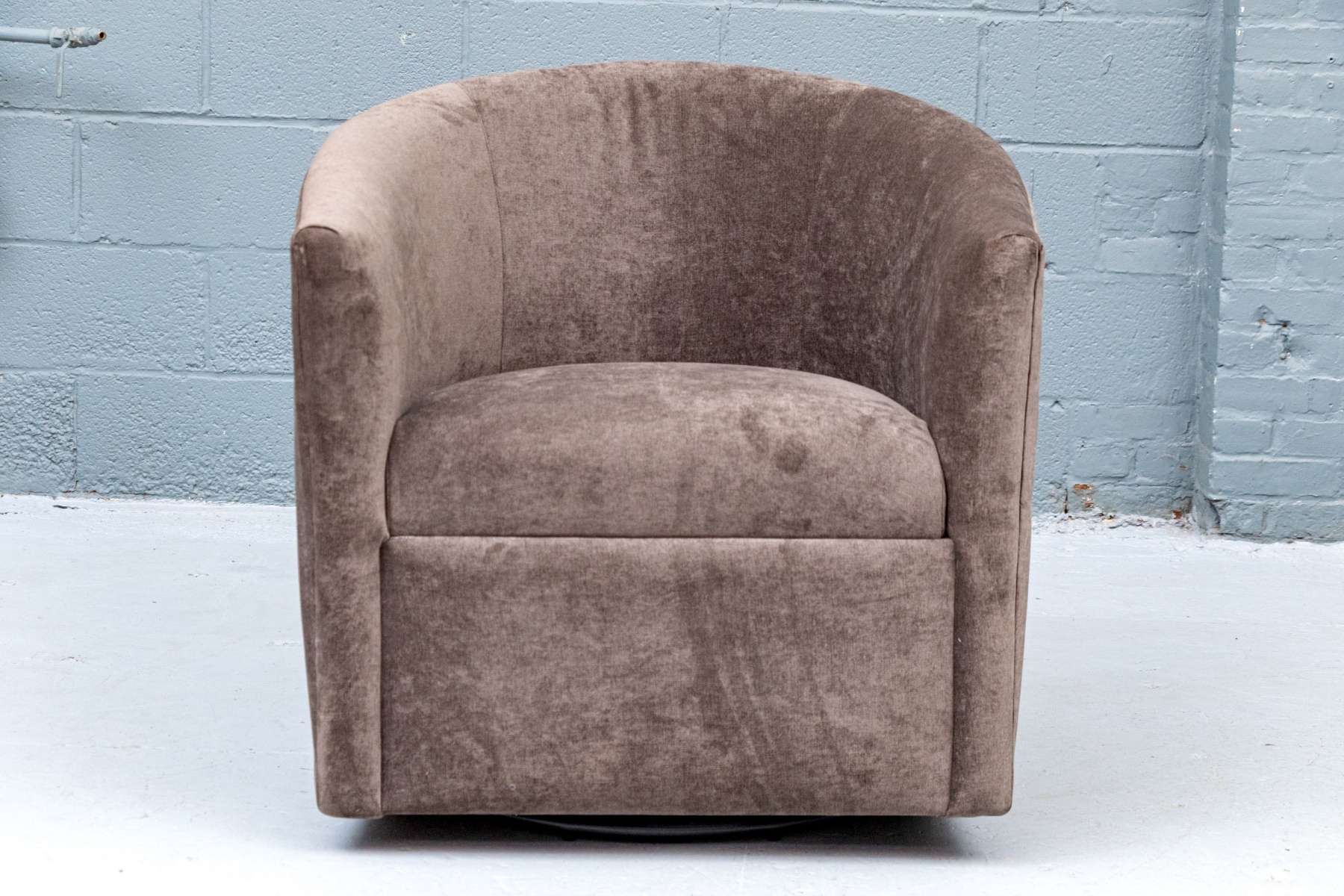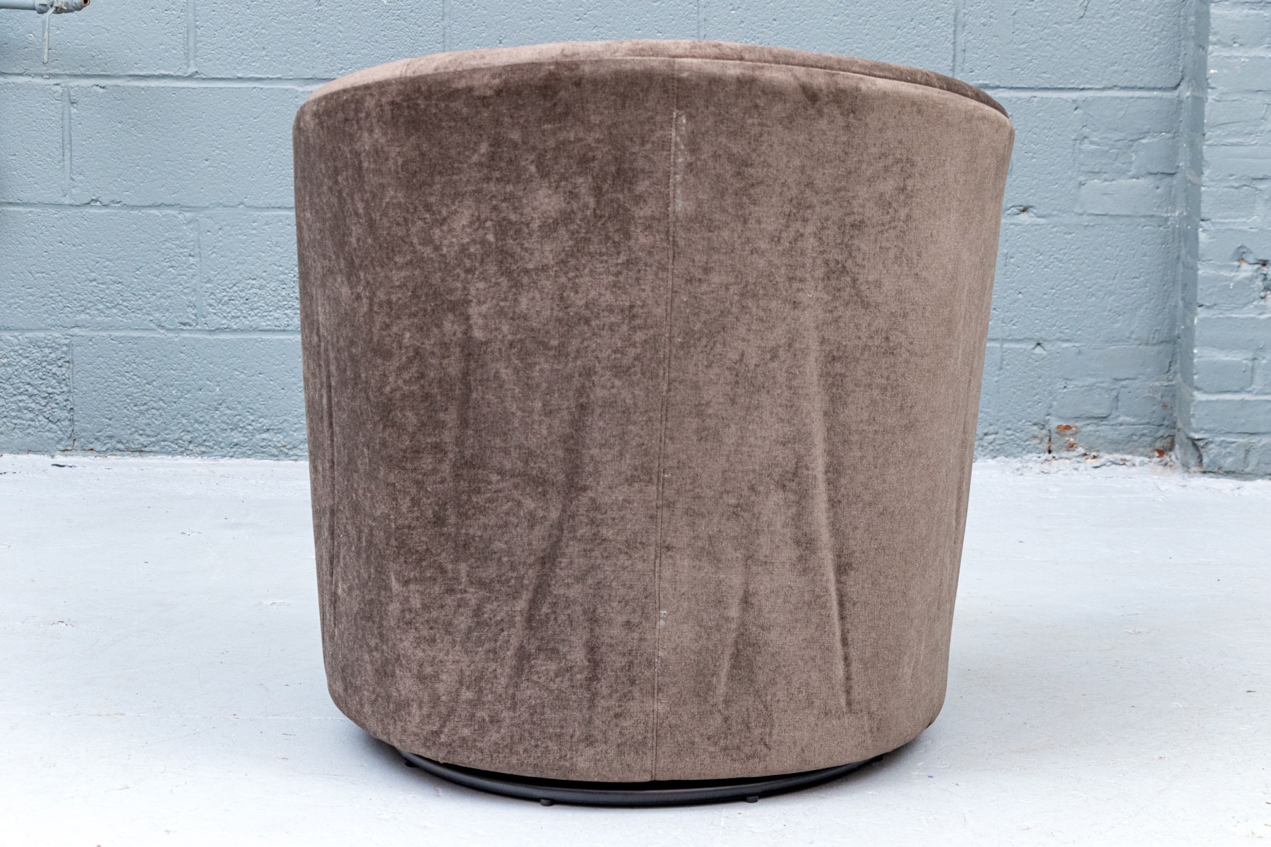 Upholstered frame with affixed seat cushion on swivel base.