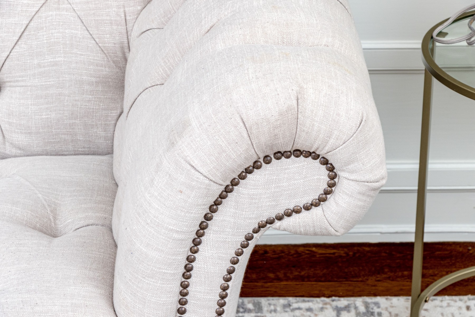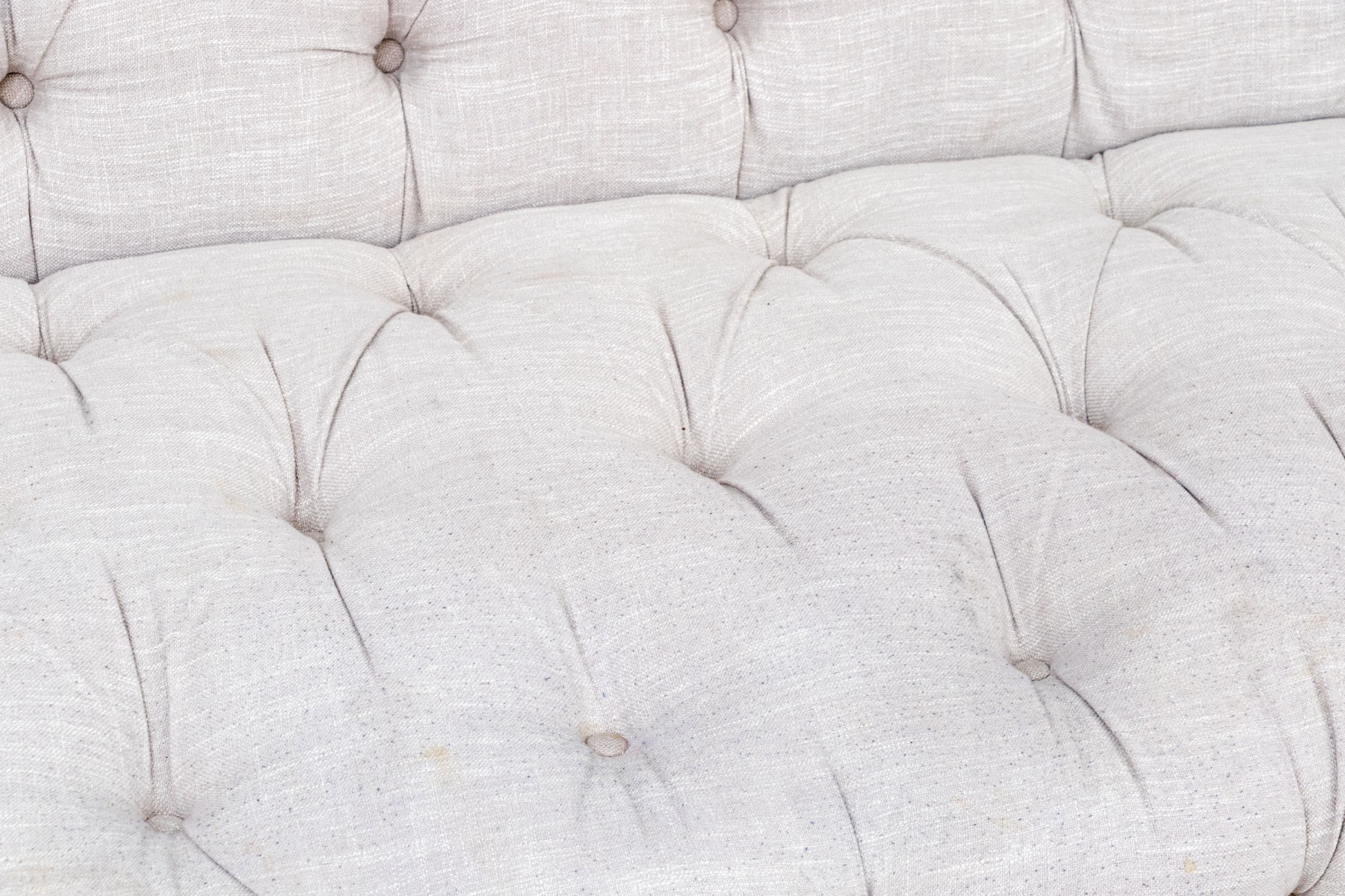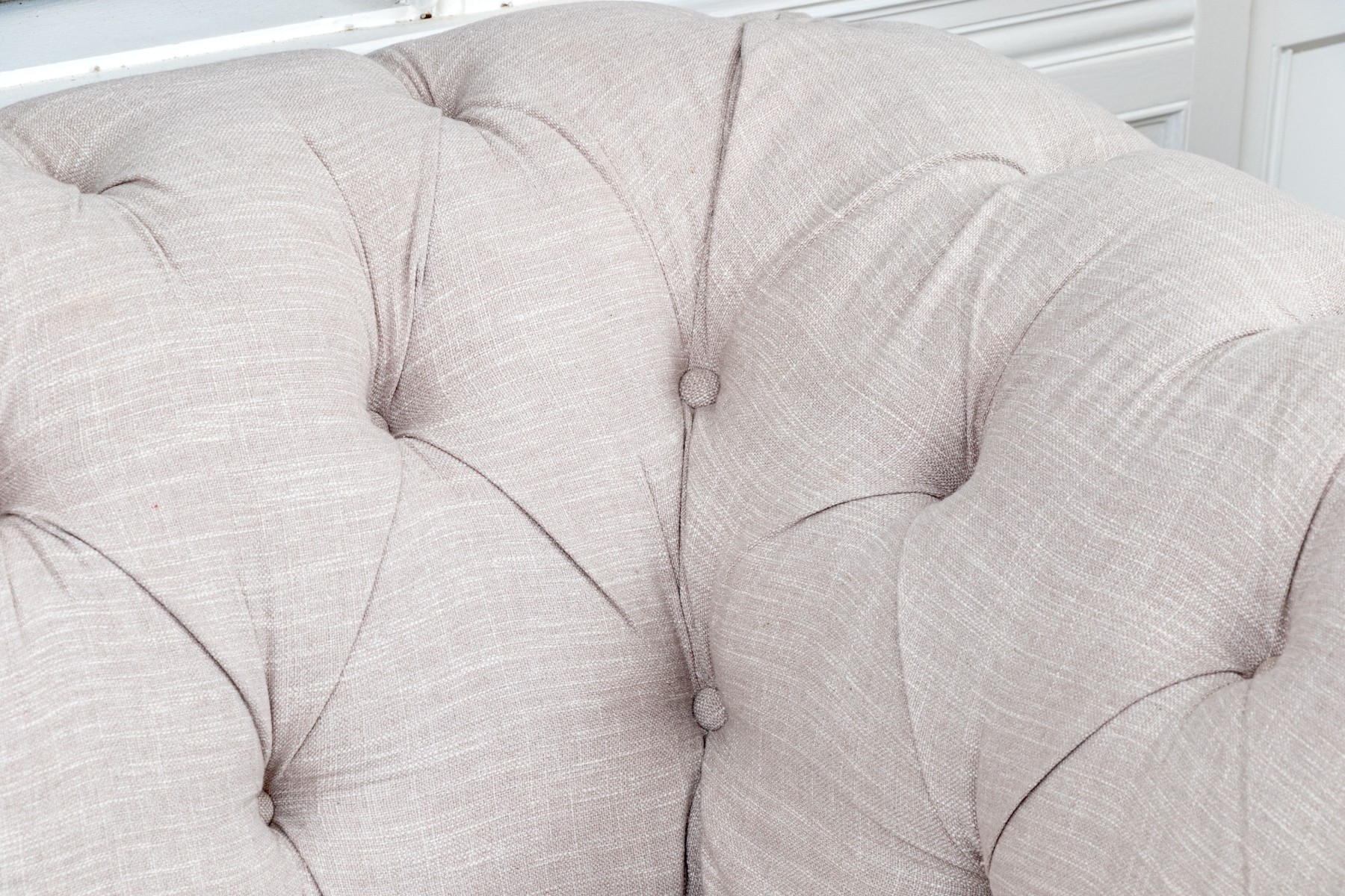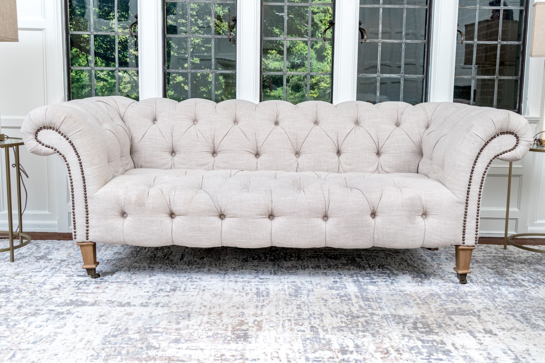 A gorgeous sofa blending Chesterfield elegance with approachable, contemporary charm. The sofa features a flush height back with rolled arms, beautifully button tufted throughout and upholstered in refreshing light flaxen beige fabric. Trimmed with nailhead borders down the arm fronts and raised over honeyed brown tapered legs on front casters.
