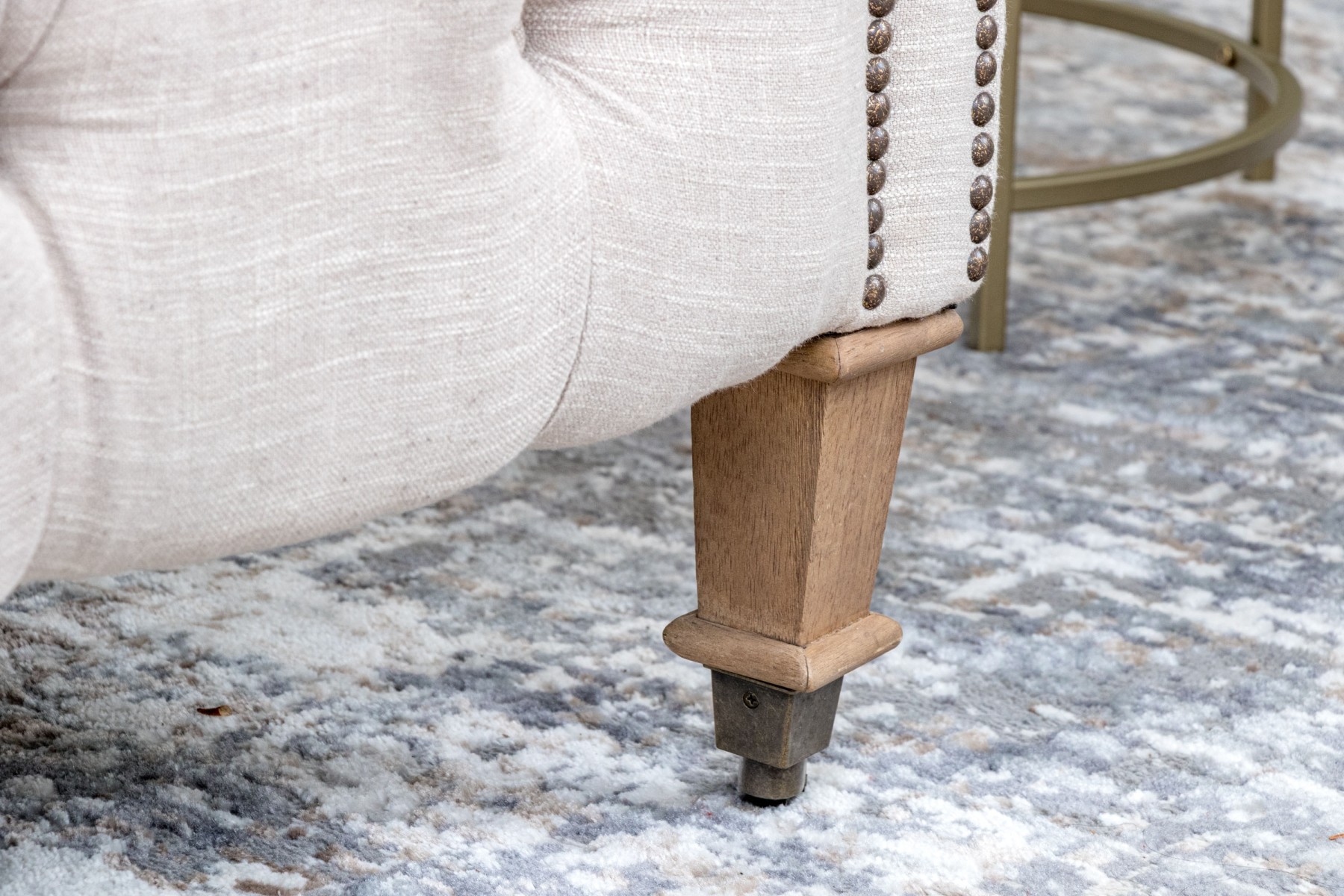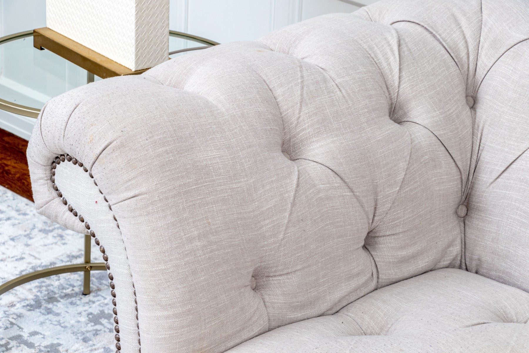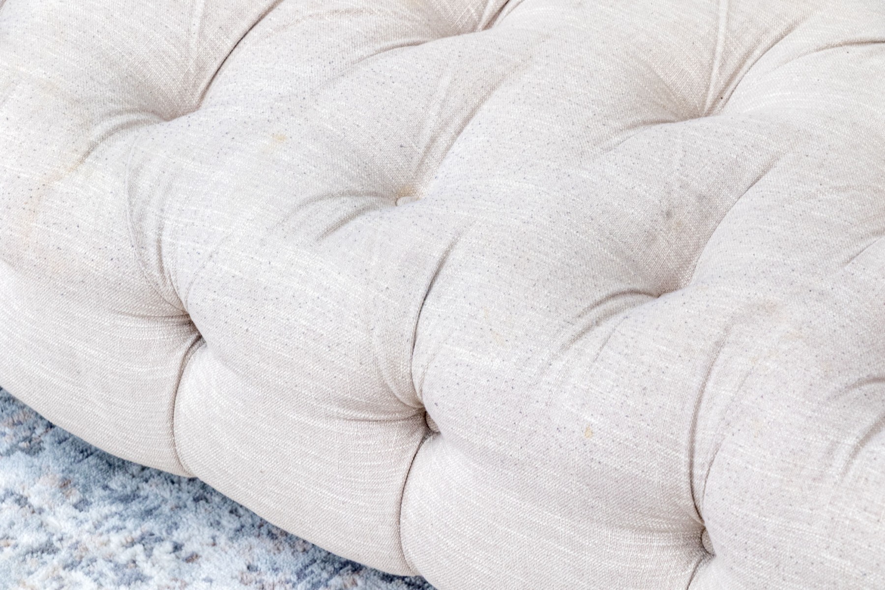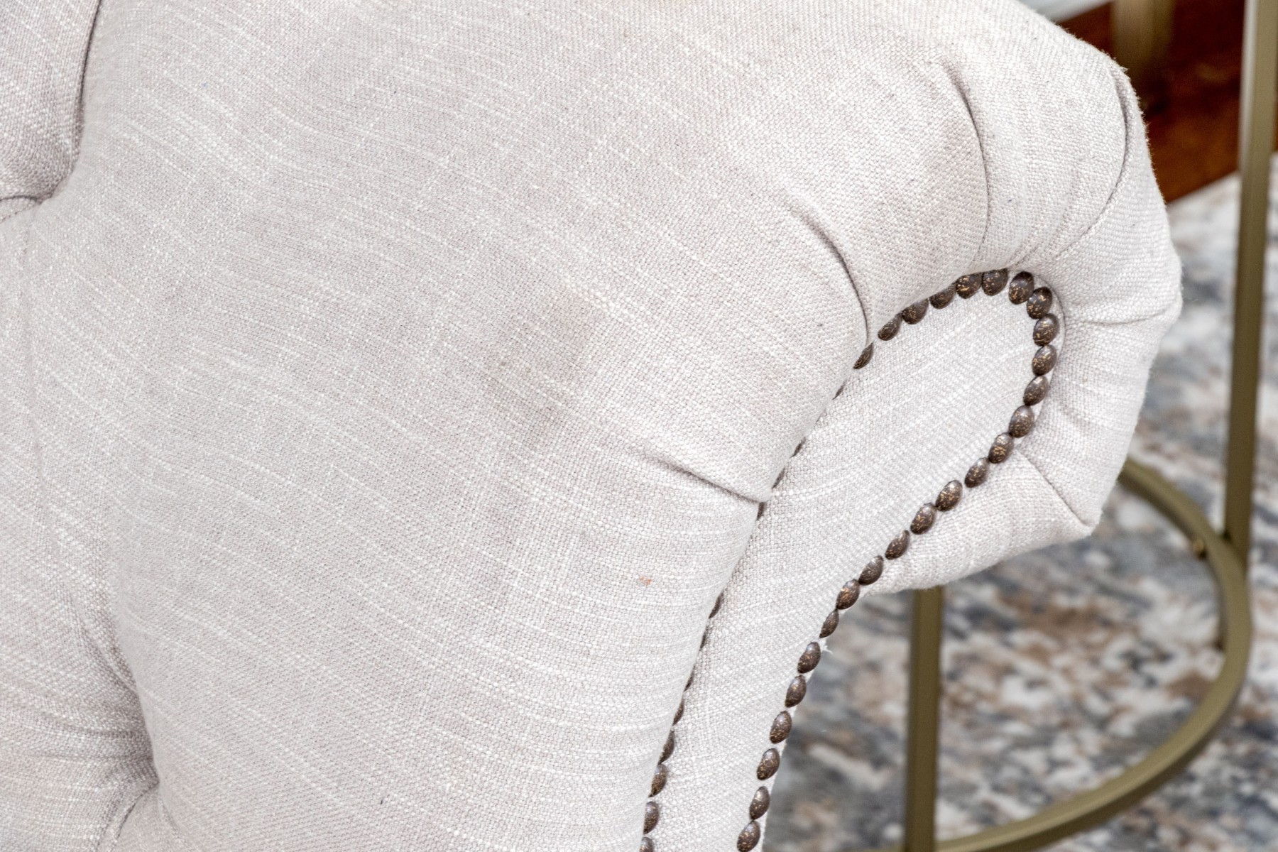 A gorgeous sofa blending Chesterfield elegance with approachable, contemporary charm. The sofa features a flush height back with rolled arms, beautifully button tufted throughout and upholstered in refreshing light flaxen beige fabric. Trimmed with nailhead borders down the arm fronts and raised over honeyed brown tapered legs on front casters.