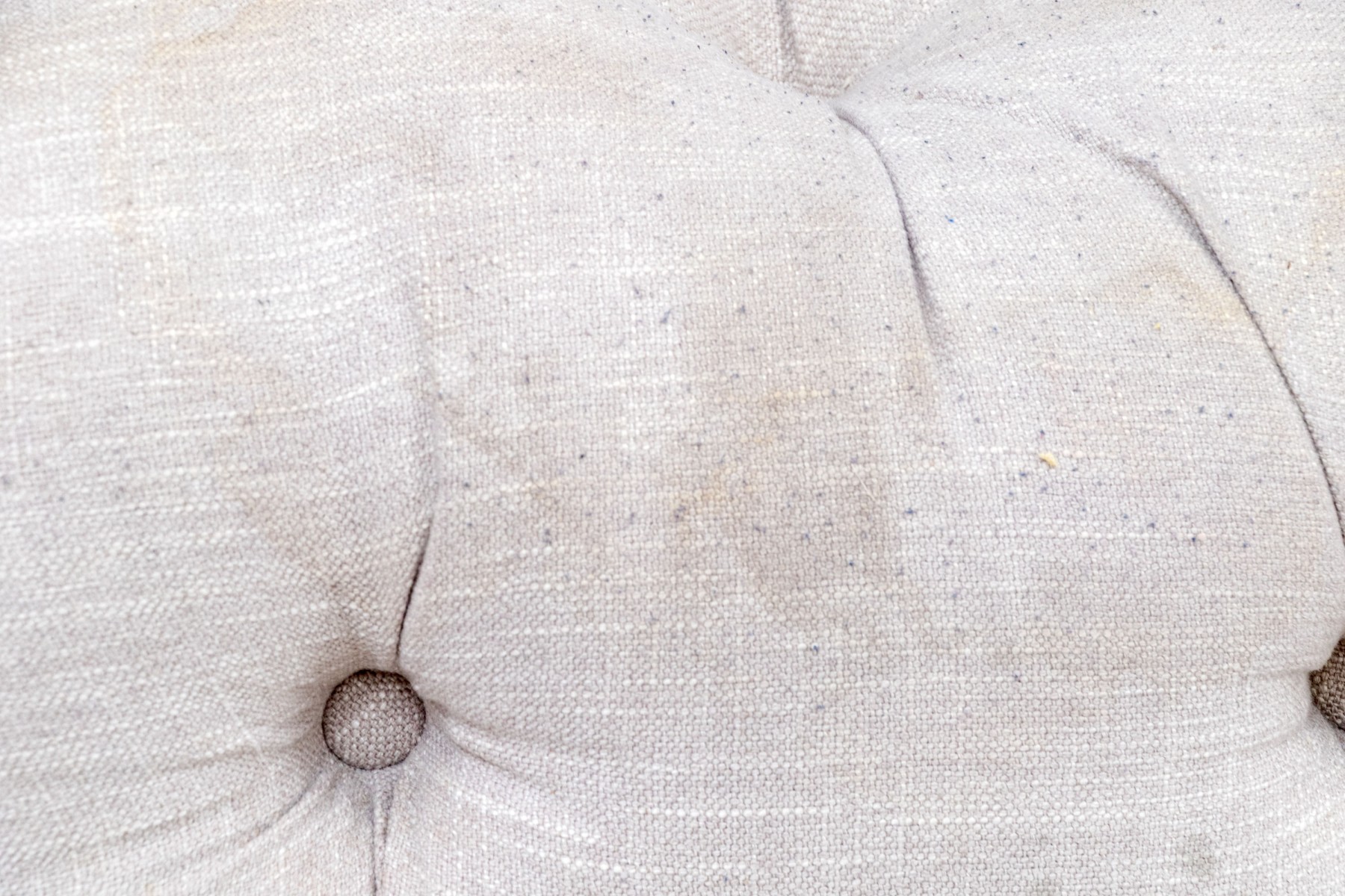 Repaired back leg. Stain spots to upholstery and scuffs and spots but overall presents well.