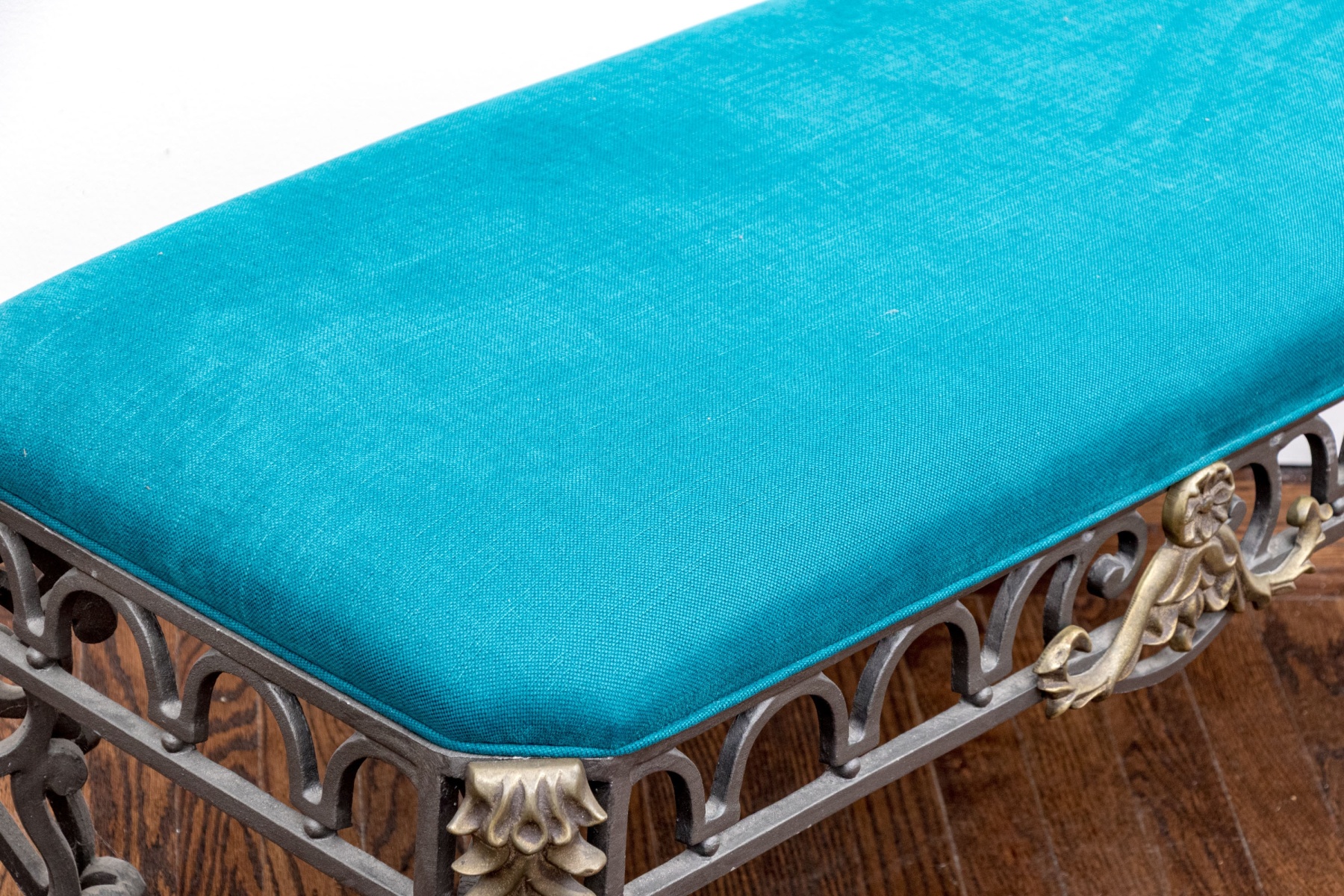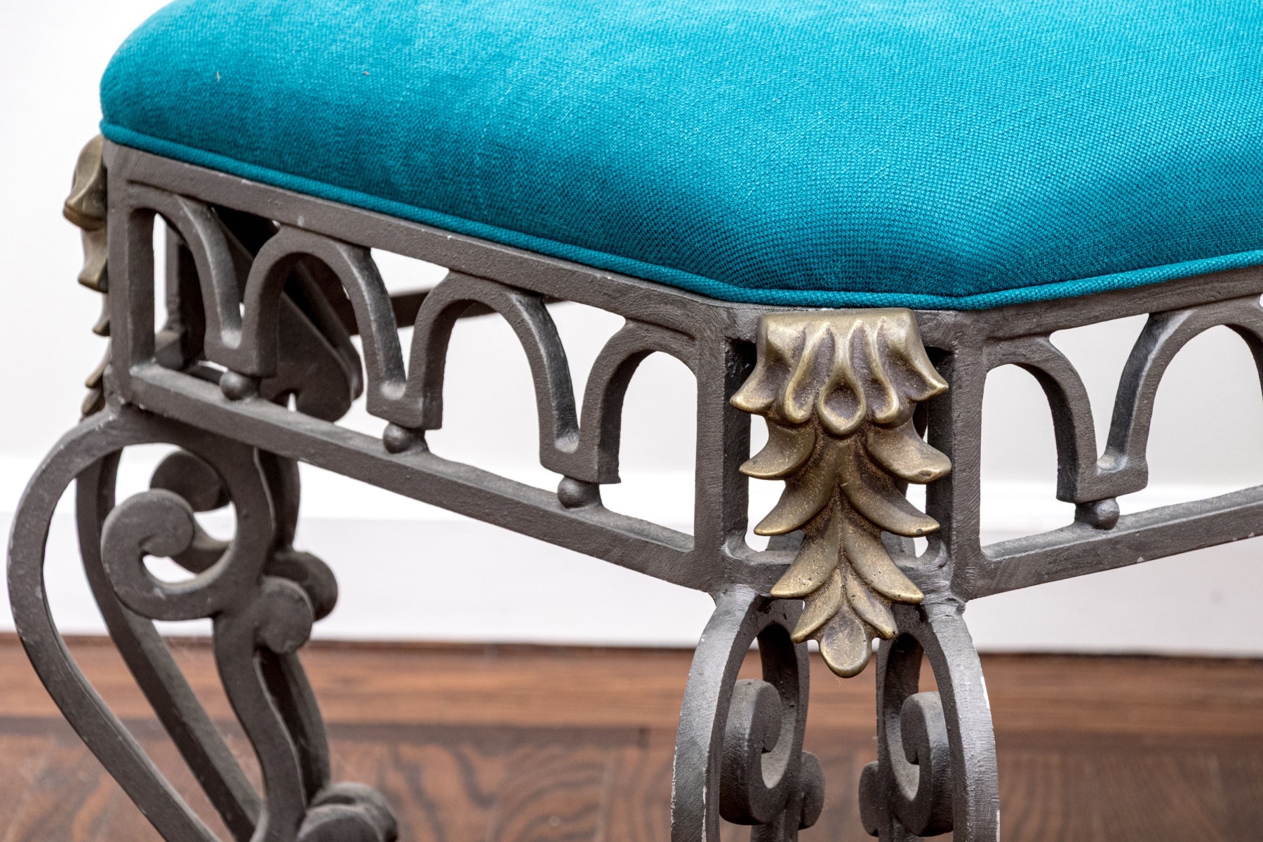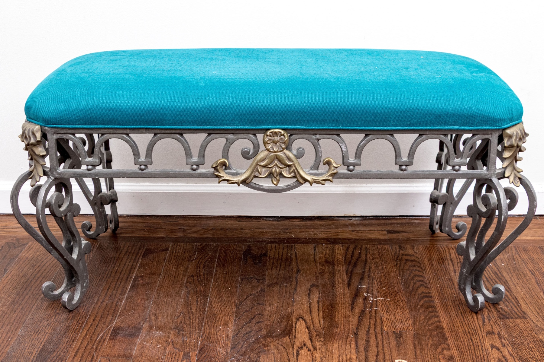 A gorgeous French style bench with great neoclassical and art nouveau appeal, detailed with a custom upholstered cushion in striking cerulean blue adding a pop of color. Supported by a gray iron frame with gilt foliate appliques around cut corners and crests at the apron center front, further detailed with tessellated U-form motifs over small sphere motifs. The bench finishes with stately double-winged cabriole legs with scrolled accents at the knees and feet.