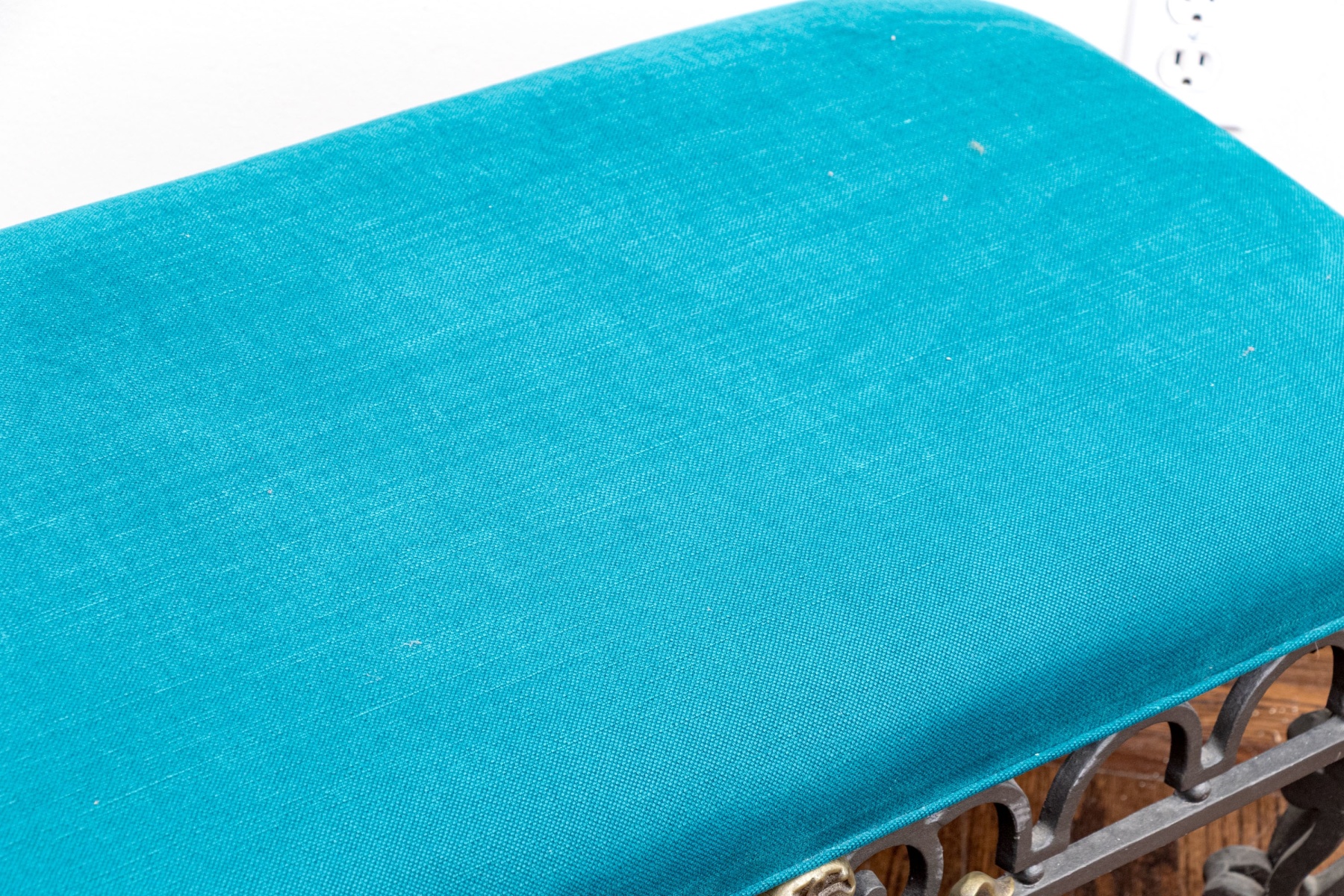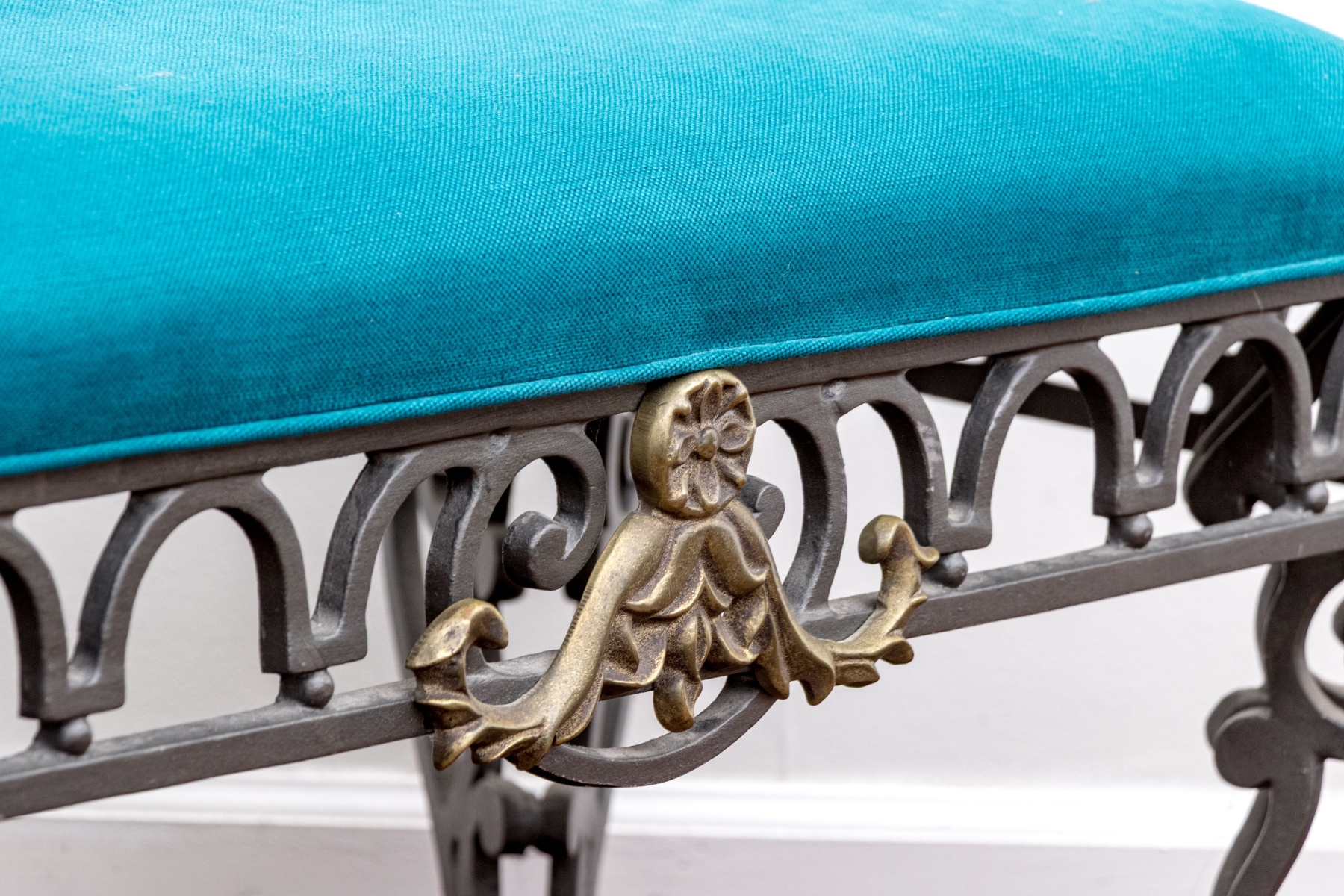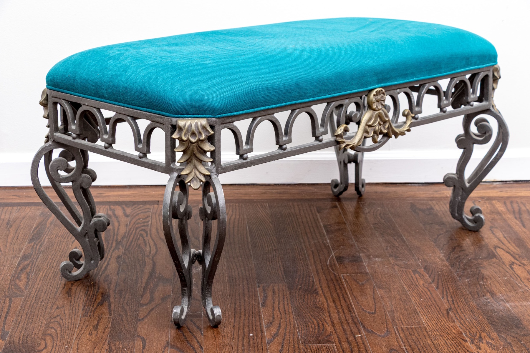 A gorgeous French style bench with great neoclassical and art nouveau appeal, detailed with a custom upholstered cushion in striking cerulean blue adding a pop of color. Supported by a gray iron frame with gilt foliate appliques around cut corners and crests at the apron center front, further detailed with tessellated U-form motifs over small sphere motifs. The bench finishes with stately double-winged cabriole legs with scrolled accents at the knees and feet.