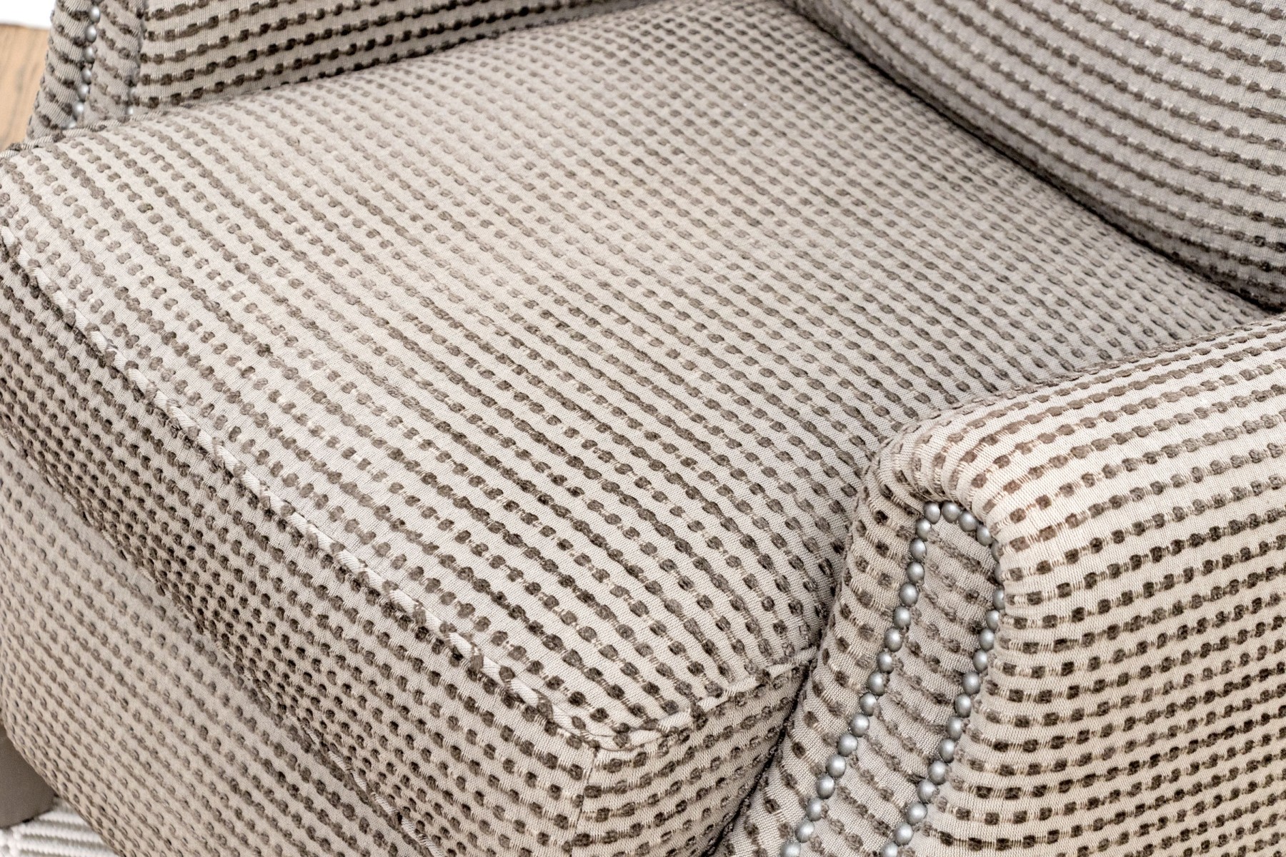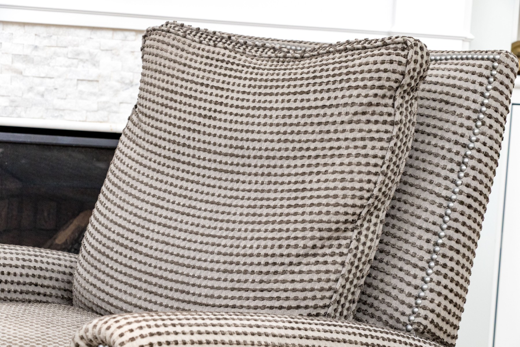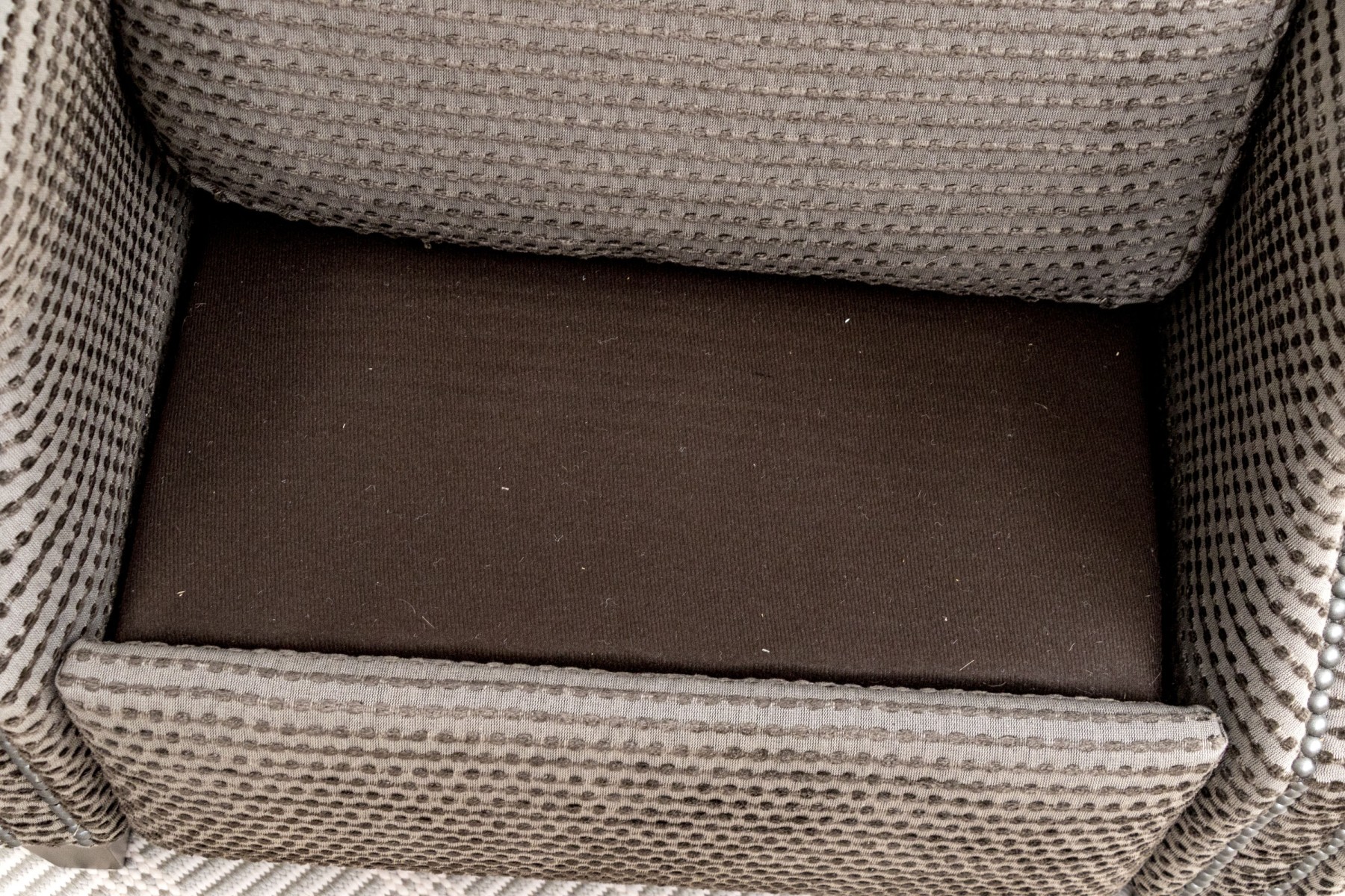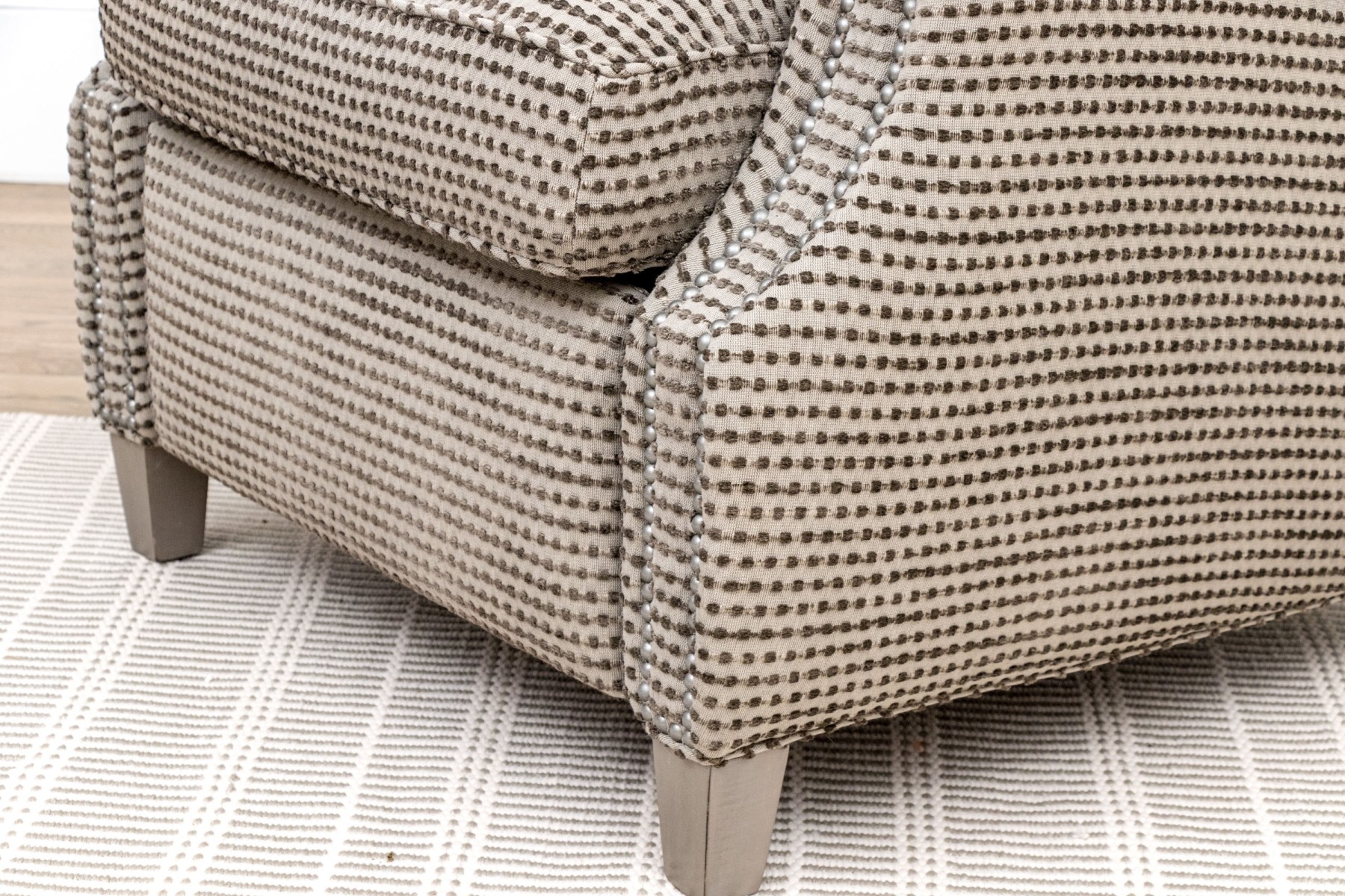 On four feet with upholstered frame and loose upholstered seat cushion with piped trim, together with a loose upholstered seat back cushion. If sit back, legs lift.