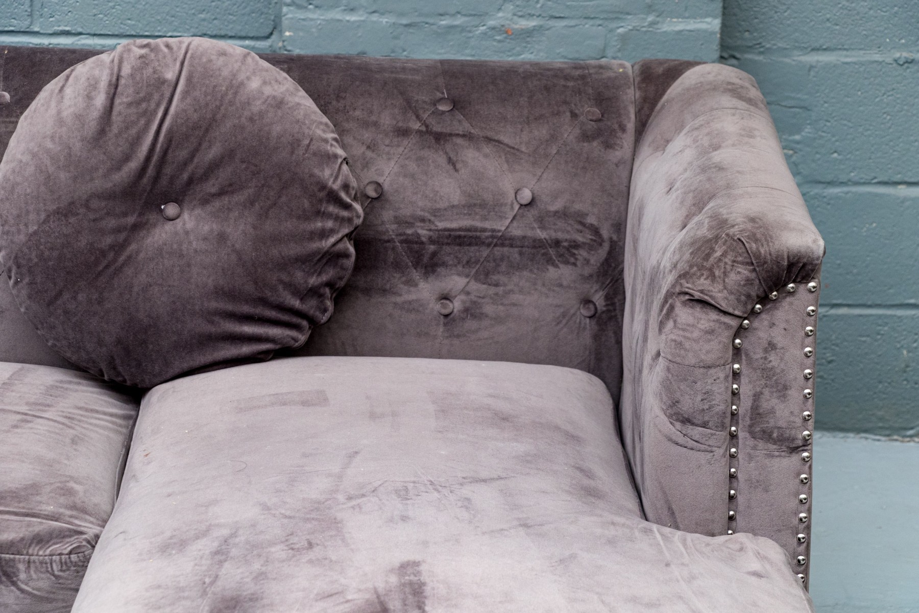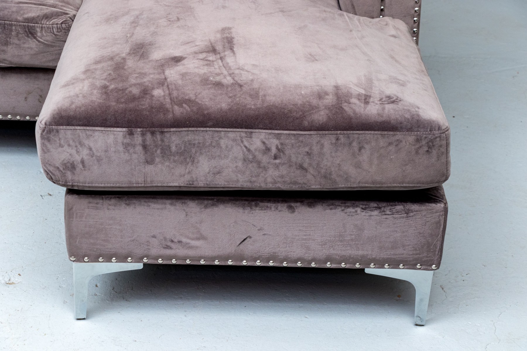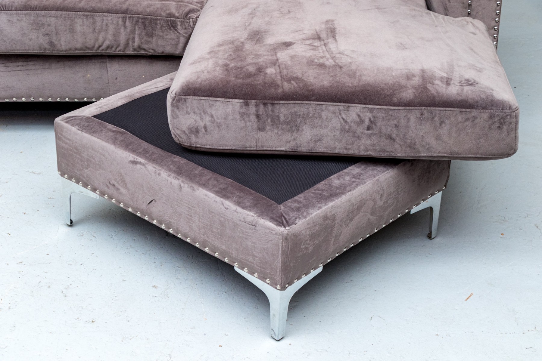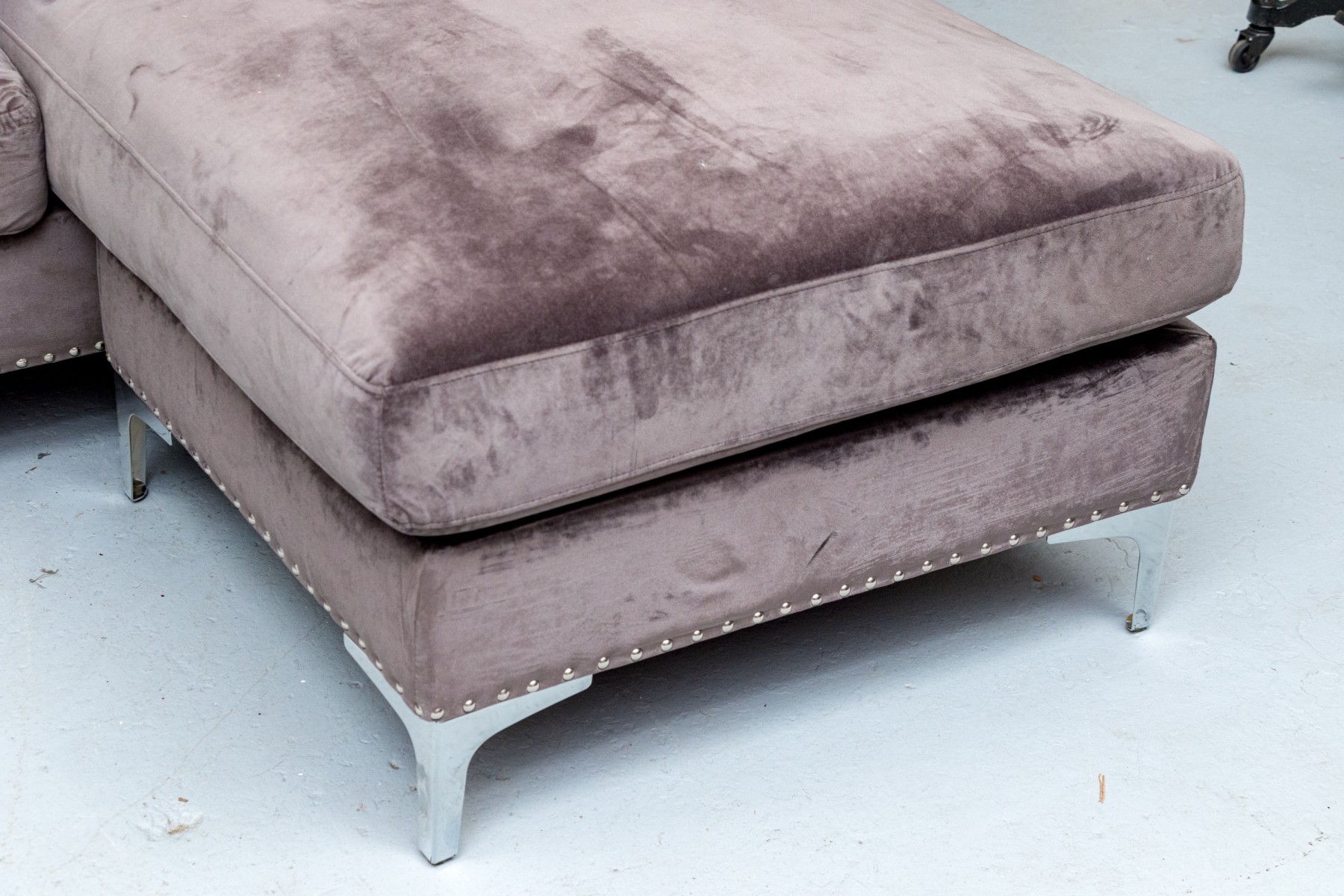 With an ottoman that has chaise upholstered cushion that is to the seat and extends to the ottoman. With tack nailhead trim.