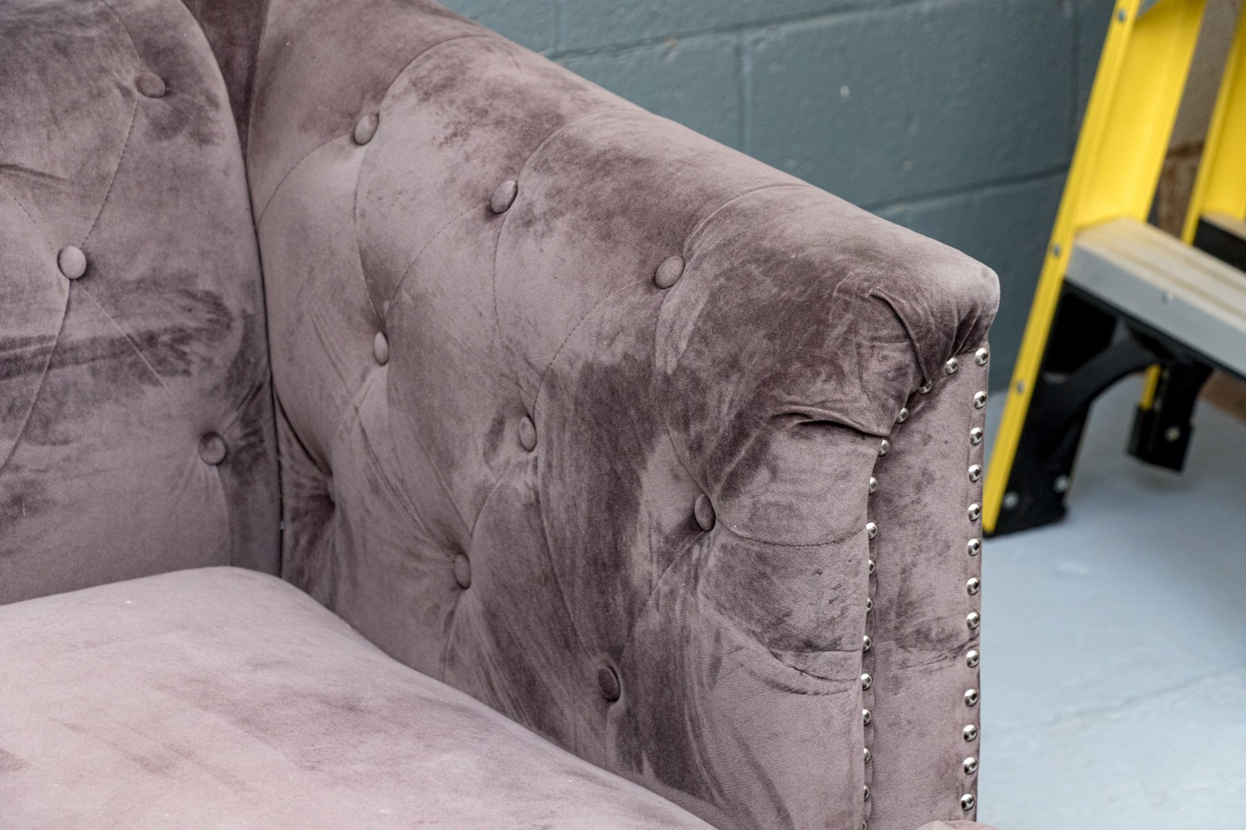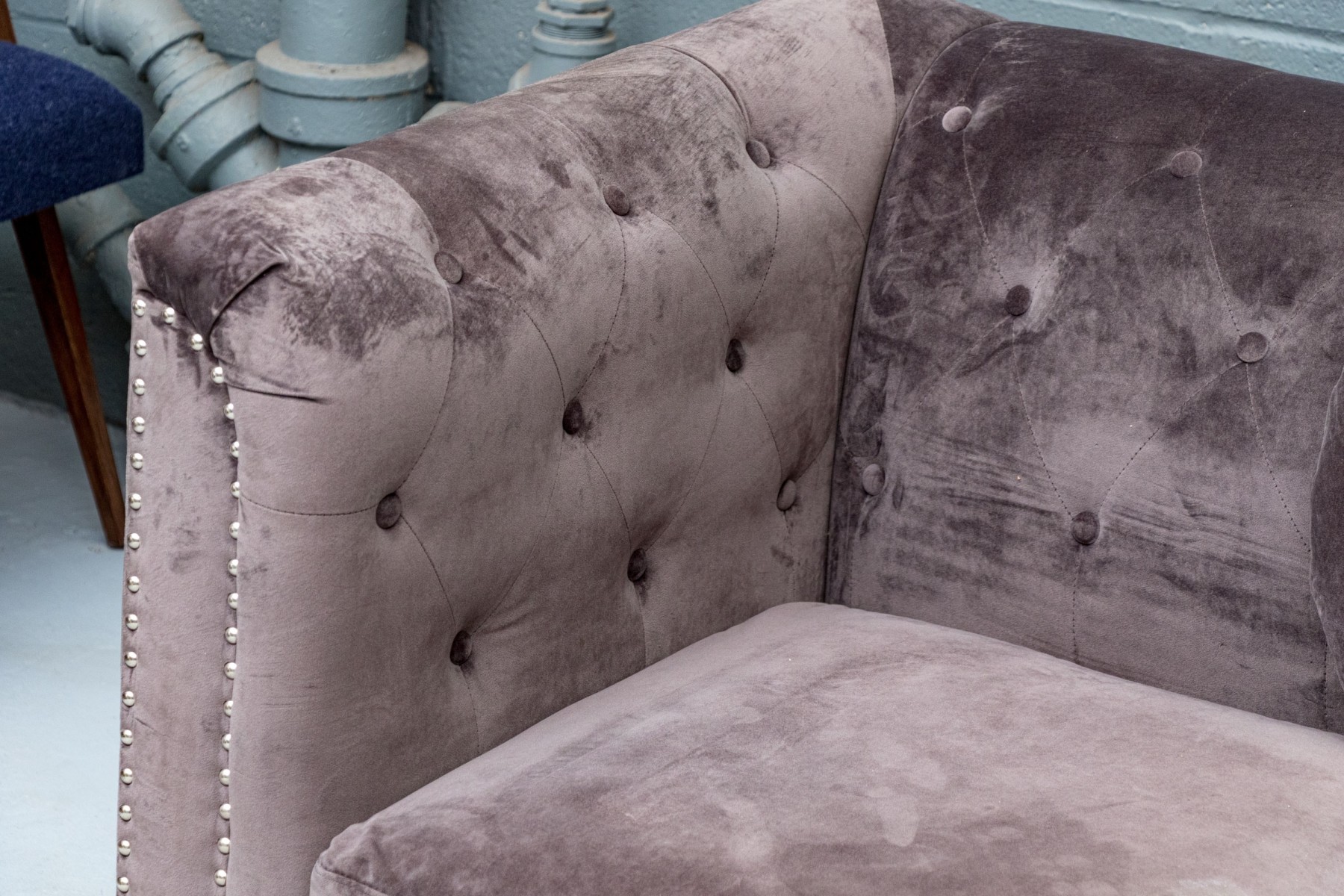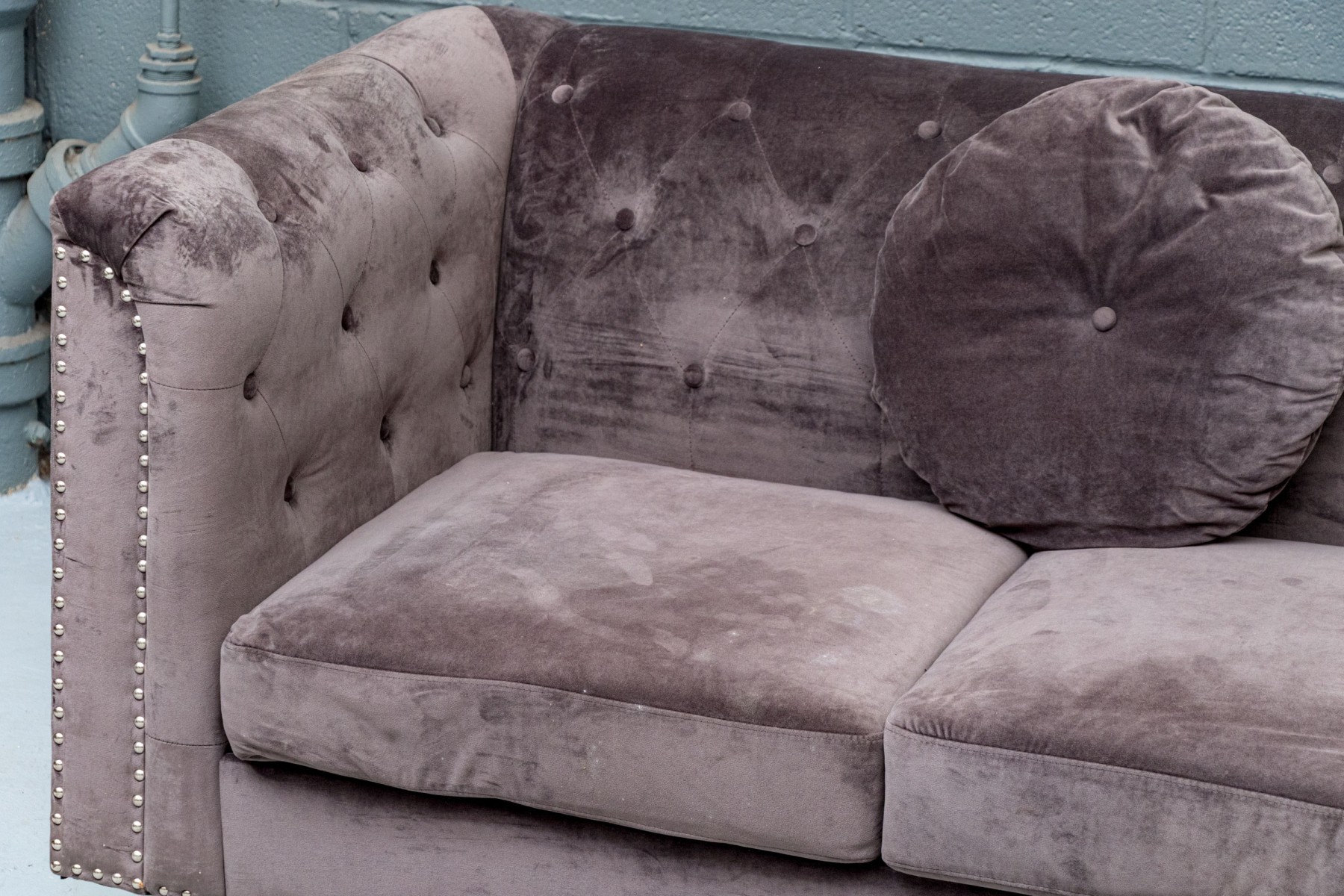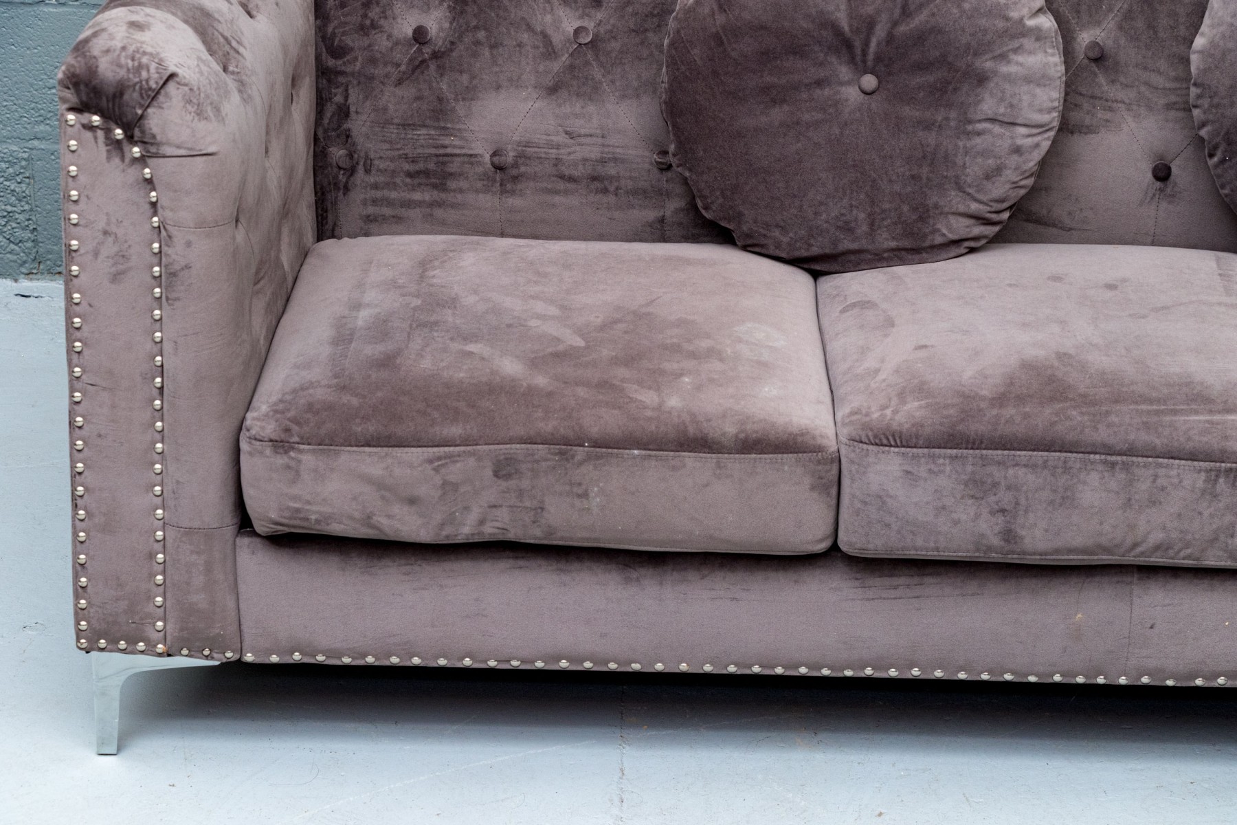 With an ottoman that has chaise upholstered cushion that is to the seat and extends to the ottoman. With tack nailhead trim.