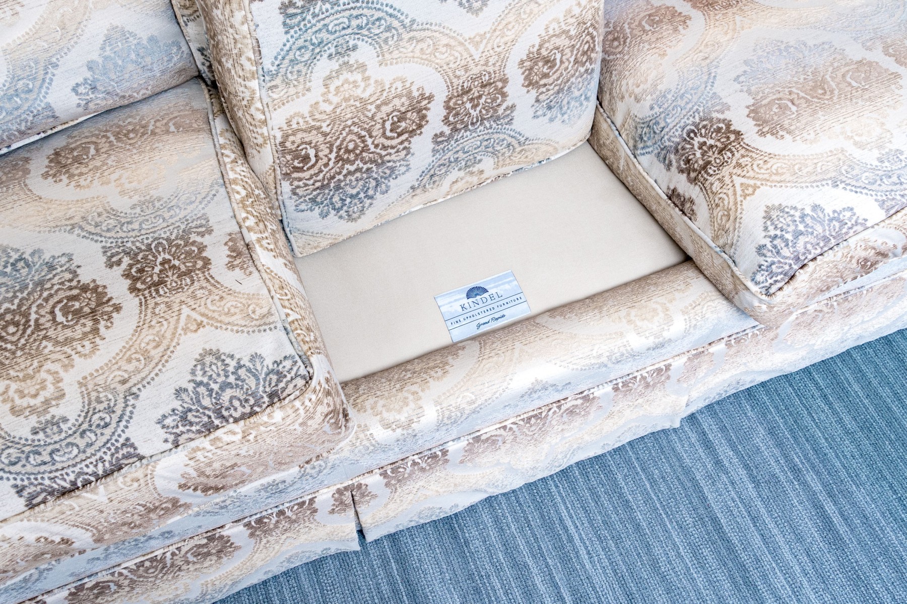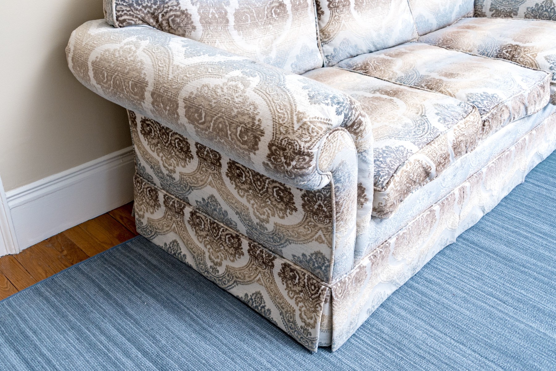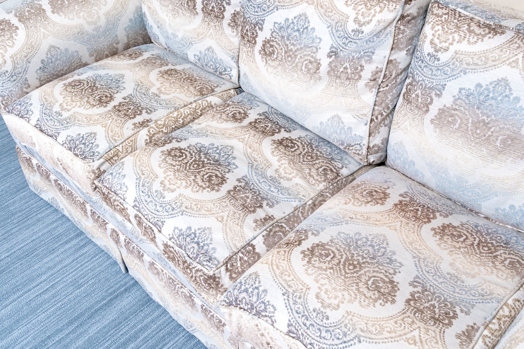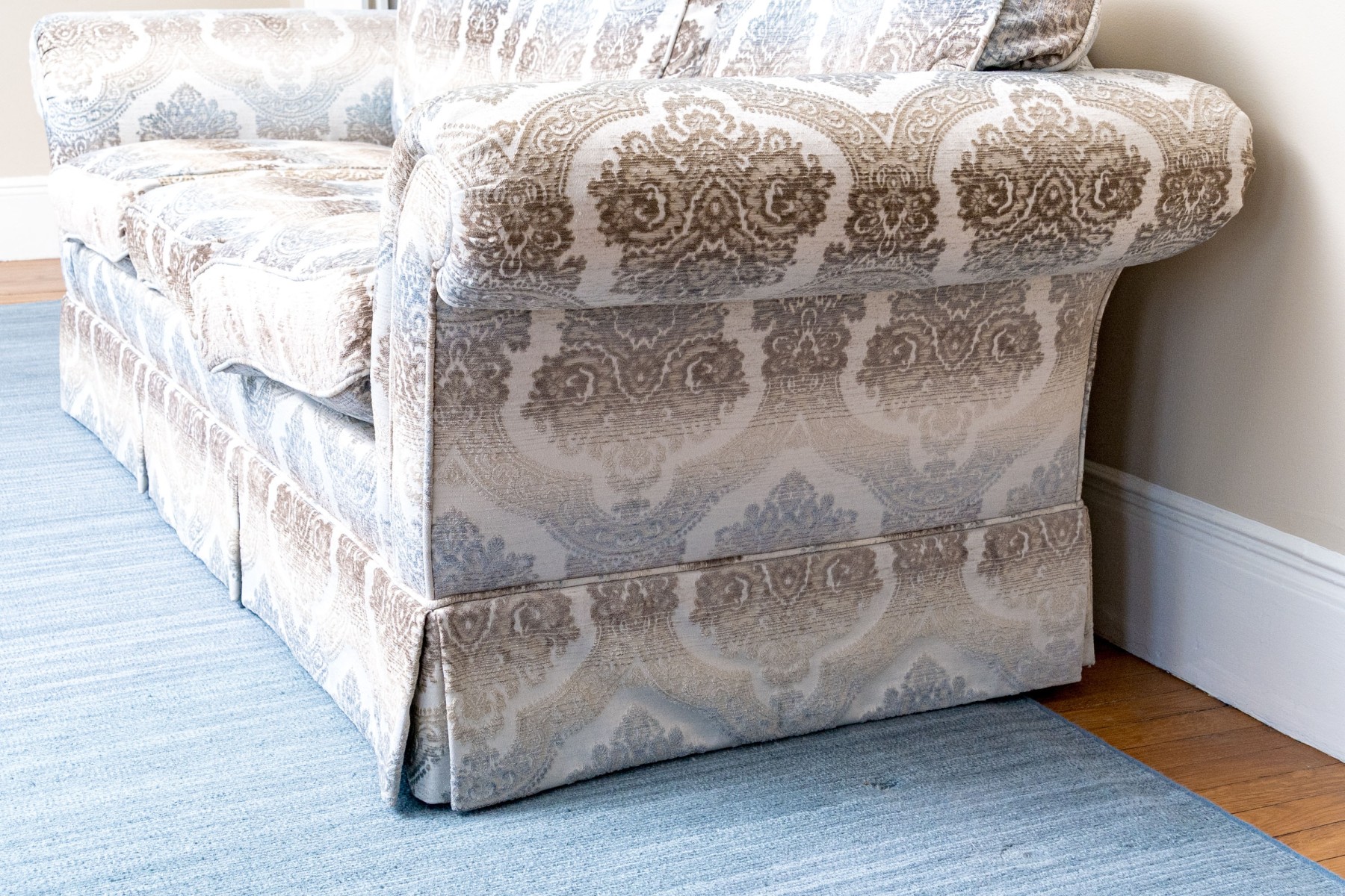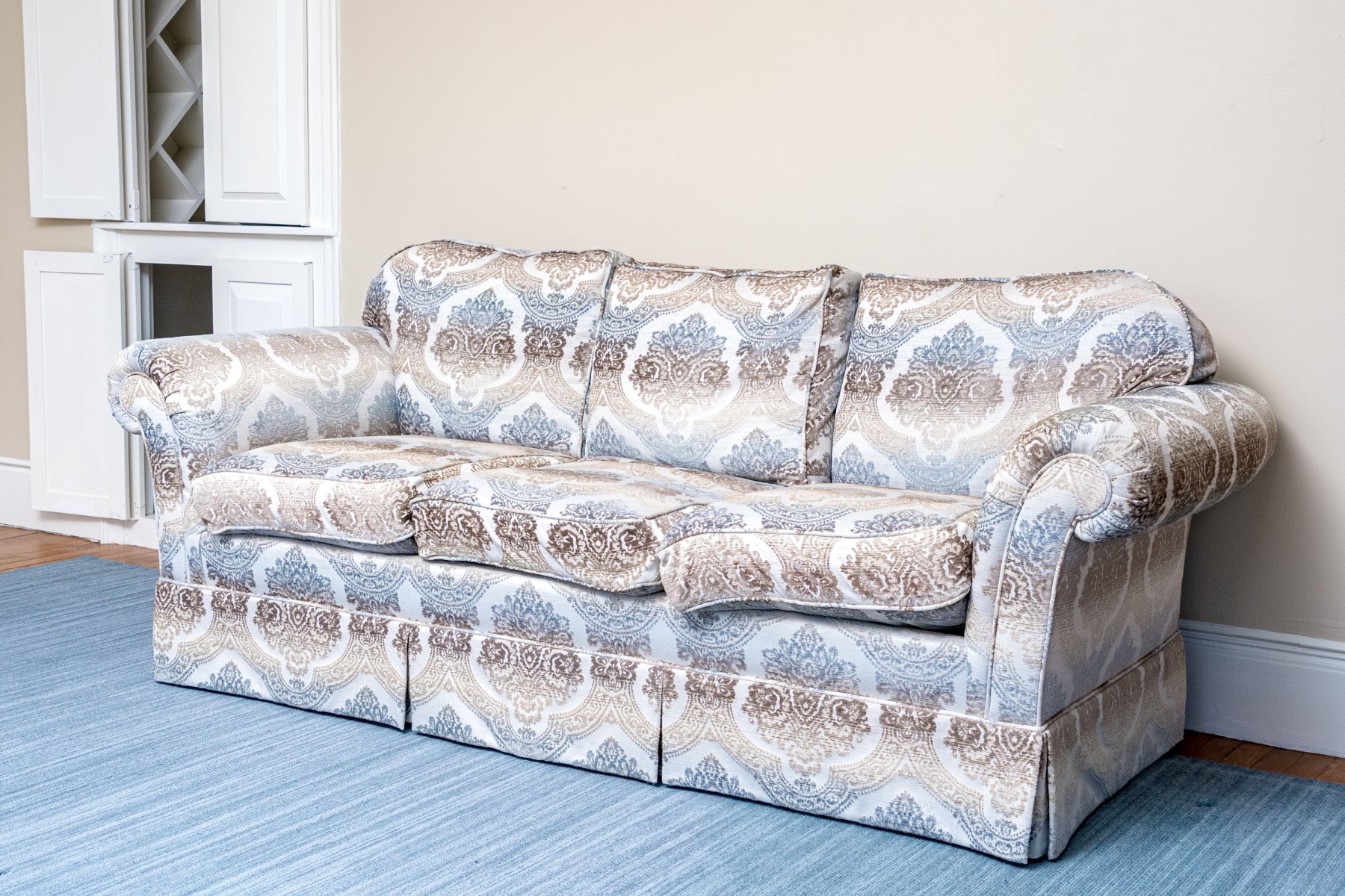 The sofa has wonderfully rolled arms with a decorative and aesthetically pleasing upholstered pattern. Designed with a skirt to conceal the underneath, three loose upholstered seat cushions and three loose upholstered seat back cushions, all with piped trims.