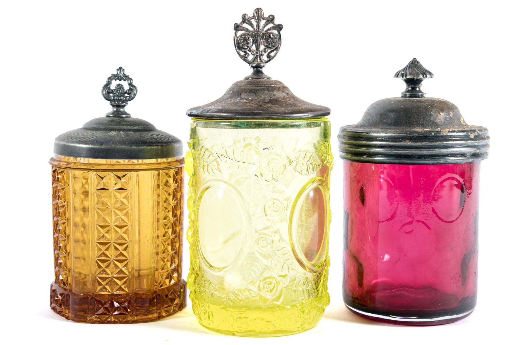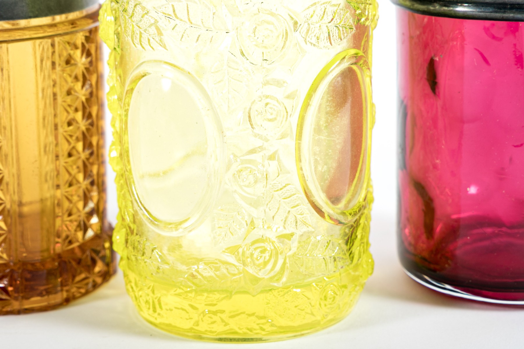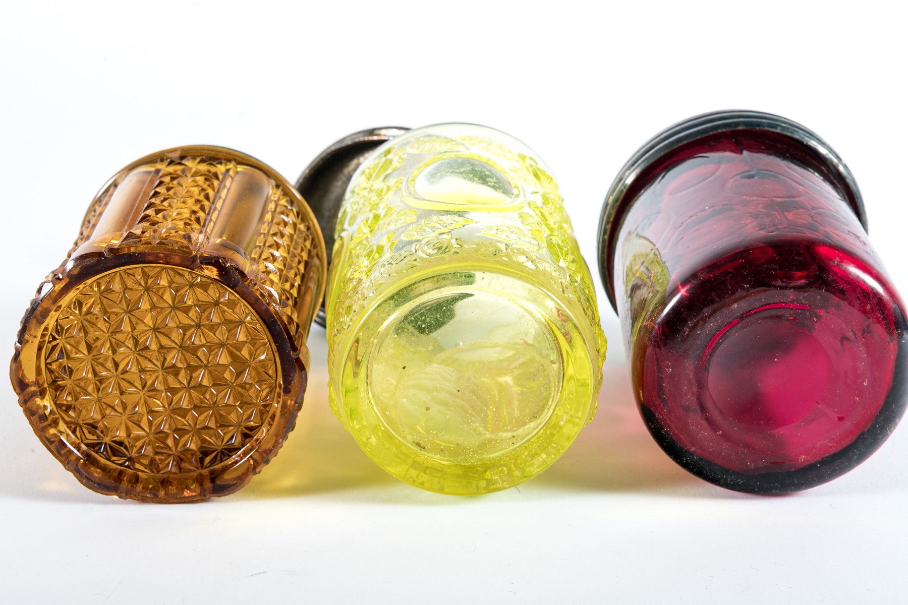 A lovely trio of depression glass pickle castors in graduating sizes. The largest is a uranium castor with pretty rose and leaf relief around oval medallions. The next is a dark purple-cranberry castor with a subtle thumbprint design. The smallest is an amber glass castor with striped relief.