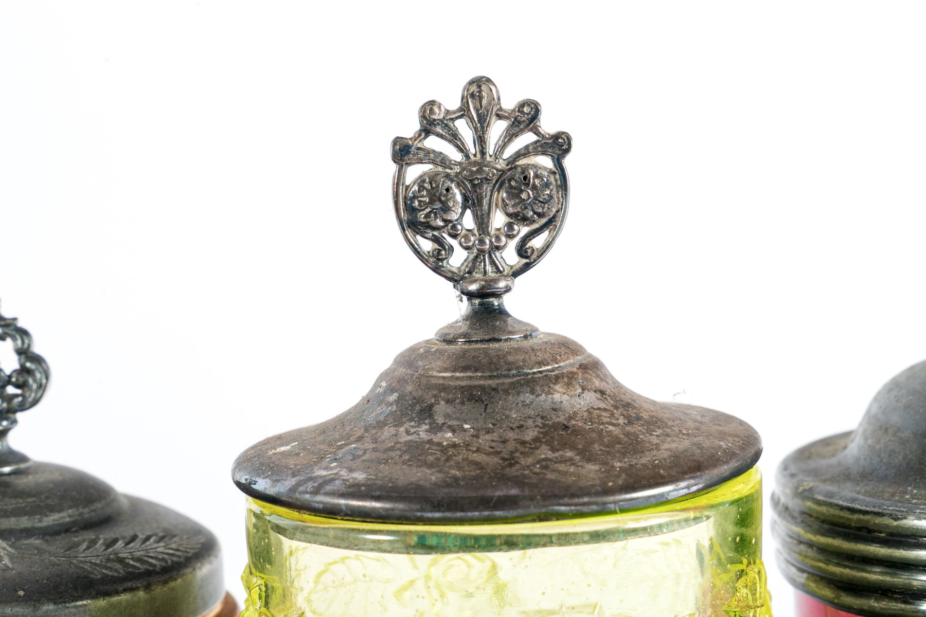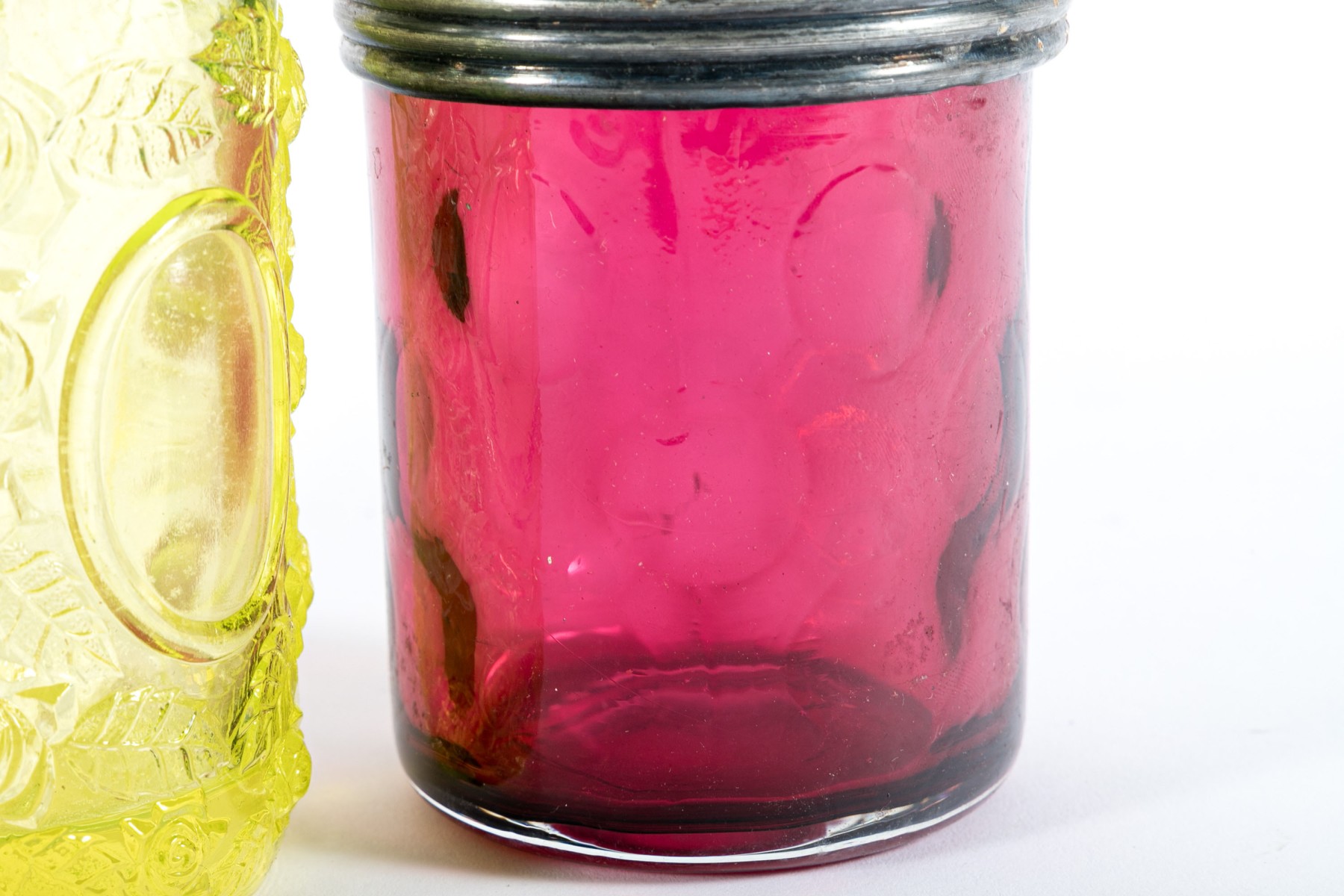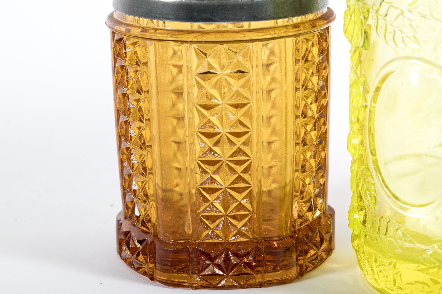 A lovely trio of depression glass pickle castors in graduating sizes. The largest is a uranium castor with pretty rose and leaf relief around oval medallions. The next is a dark purple-cranberry castor with a subtle thumbprint design. The smallest is an amber glass castor with striped relief.