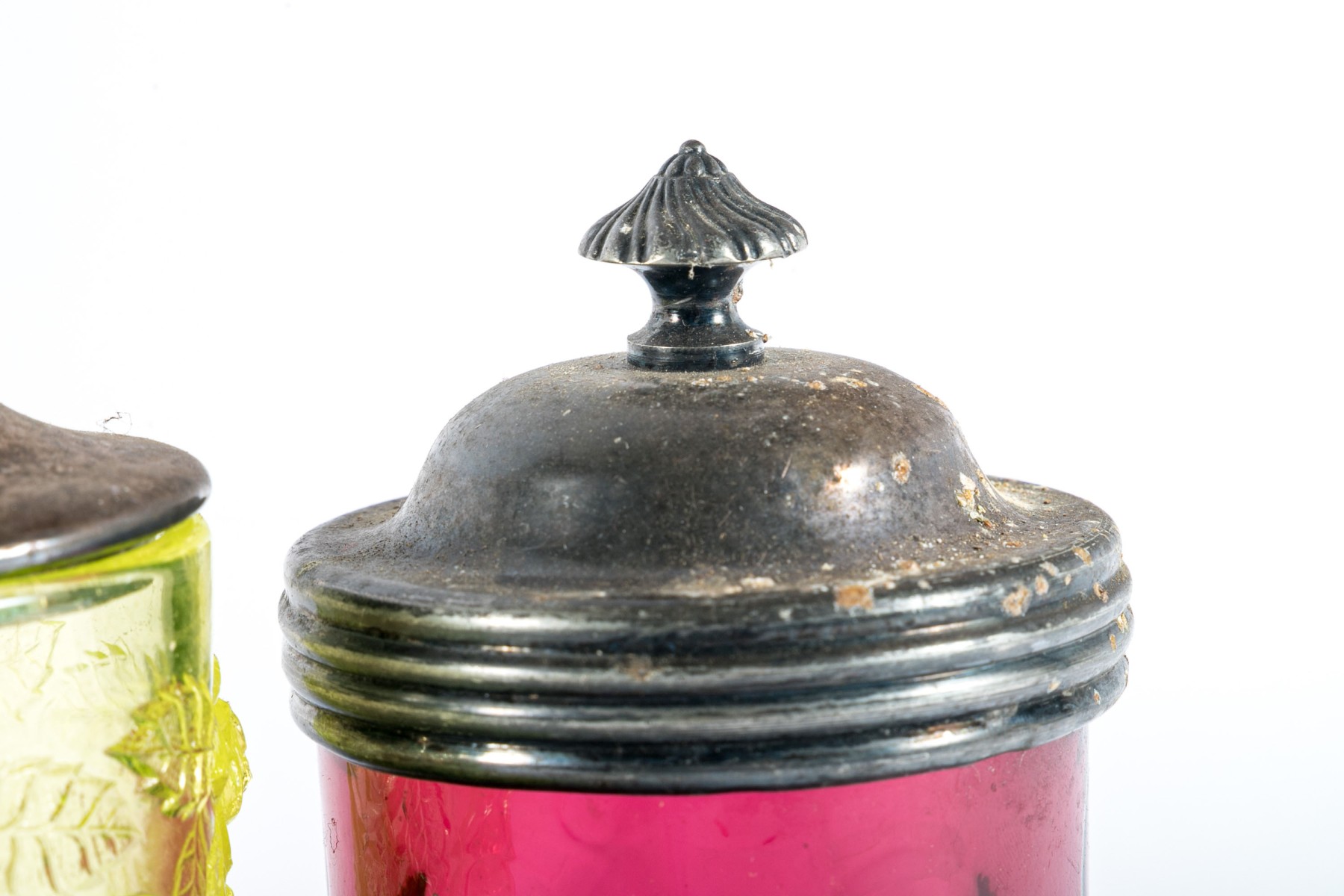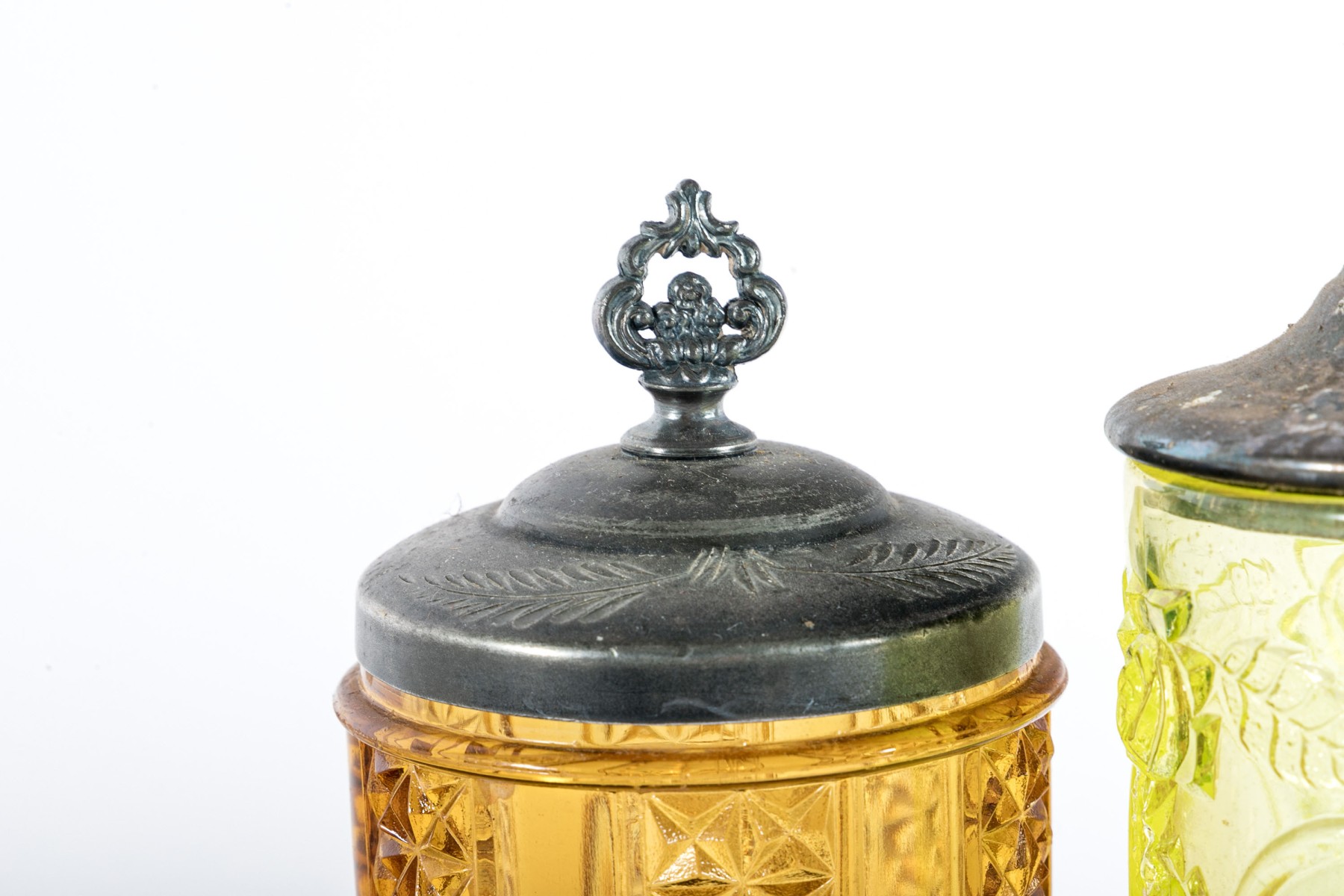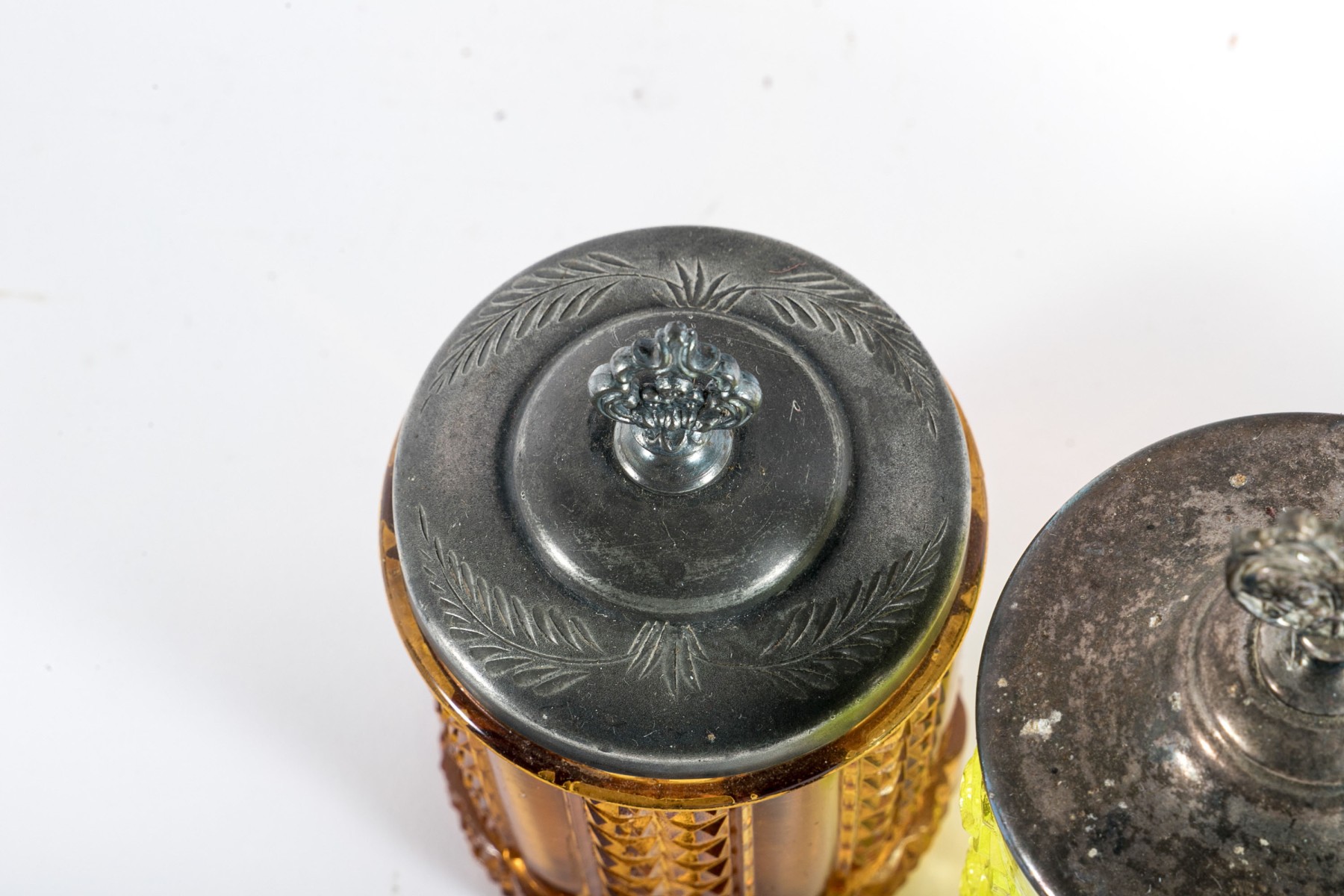Displays well with scattered tarnishing and some residue to the lids. The amber castor has a chip to the foot that does not detract from the overall appearance.