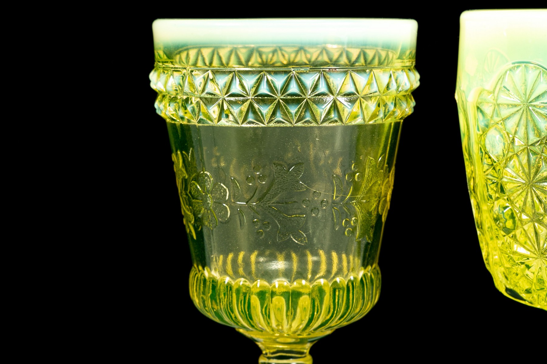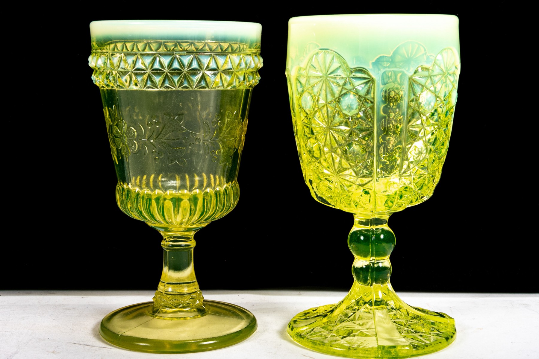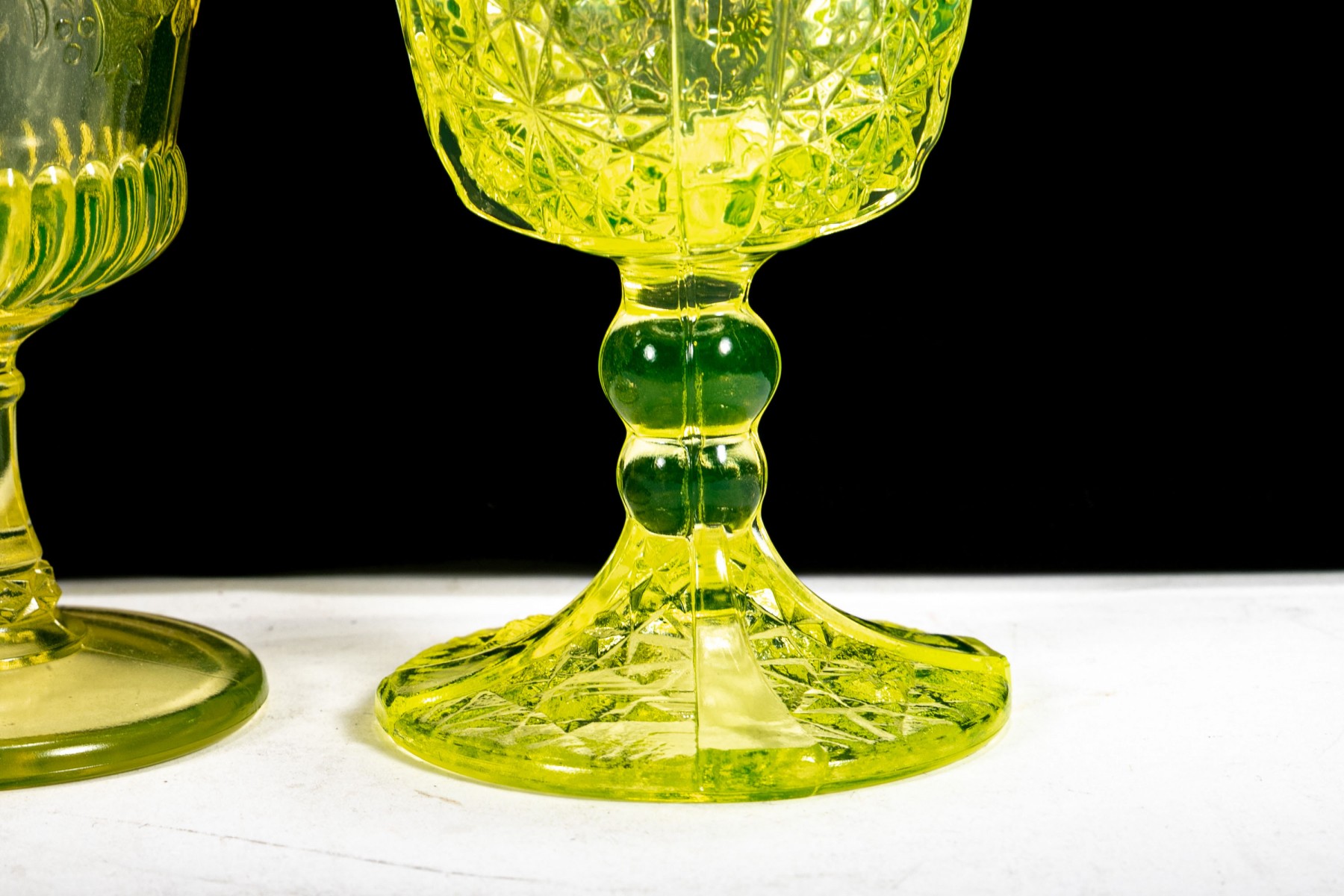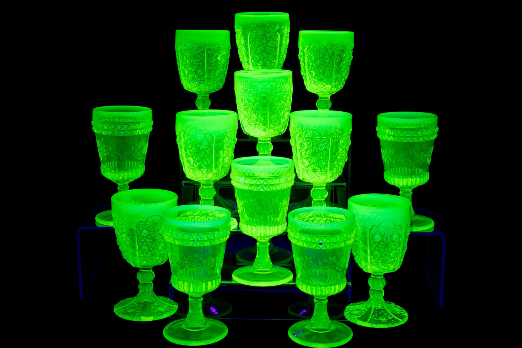 Great collection of uranium glass goblets in compatible patterns. Eight glasses display in L. Wright Daisy and Button pattern, featuring rounded bowl bottoms decorated with large and small starbursts. Five glasses display in Adams & Co. Wildflower pattern, with bands of cut triangles and low relief florals on a tapering cylindrical form, reaching a gadrooned bowl bottom. The glasses feature light ombres around the rims and high points.