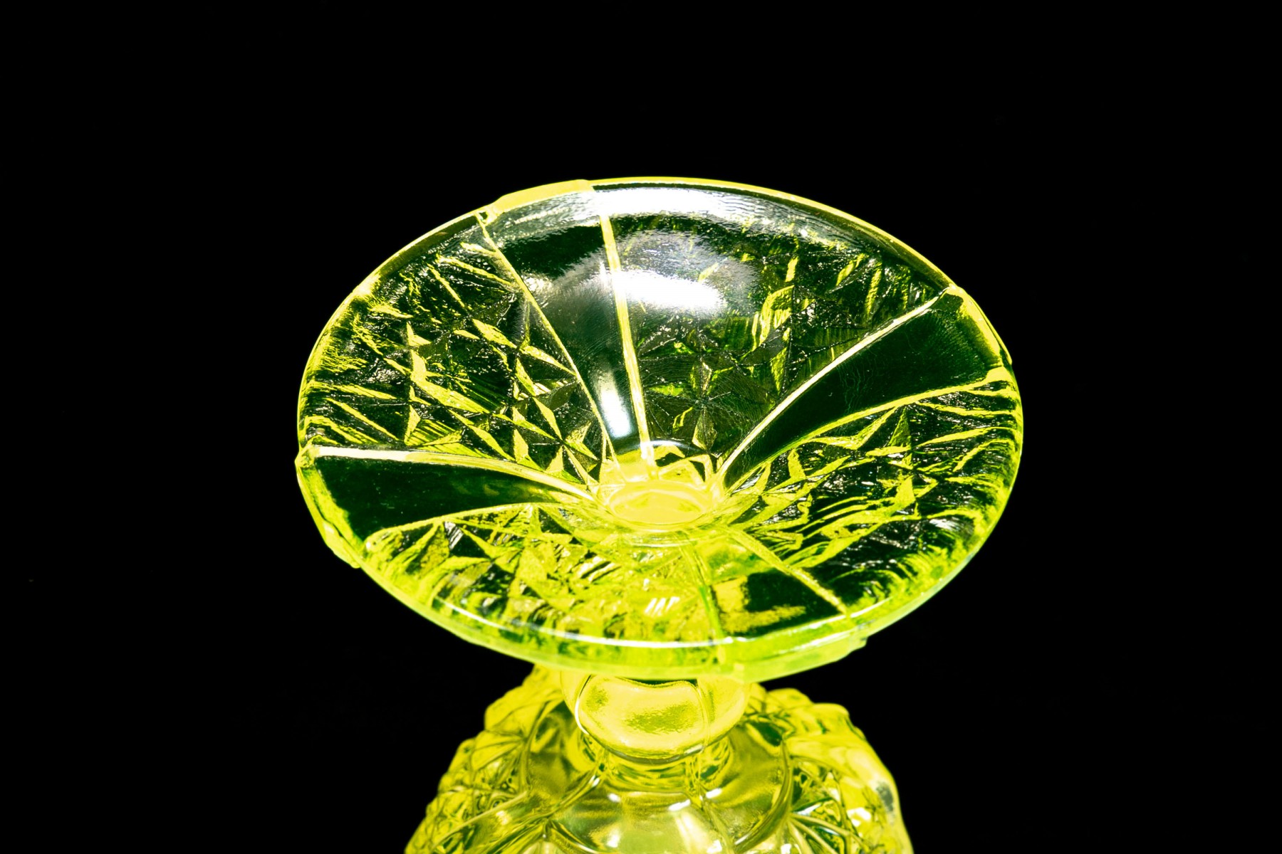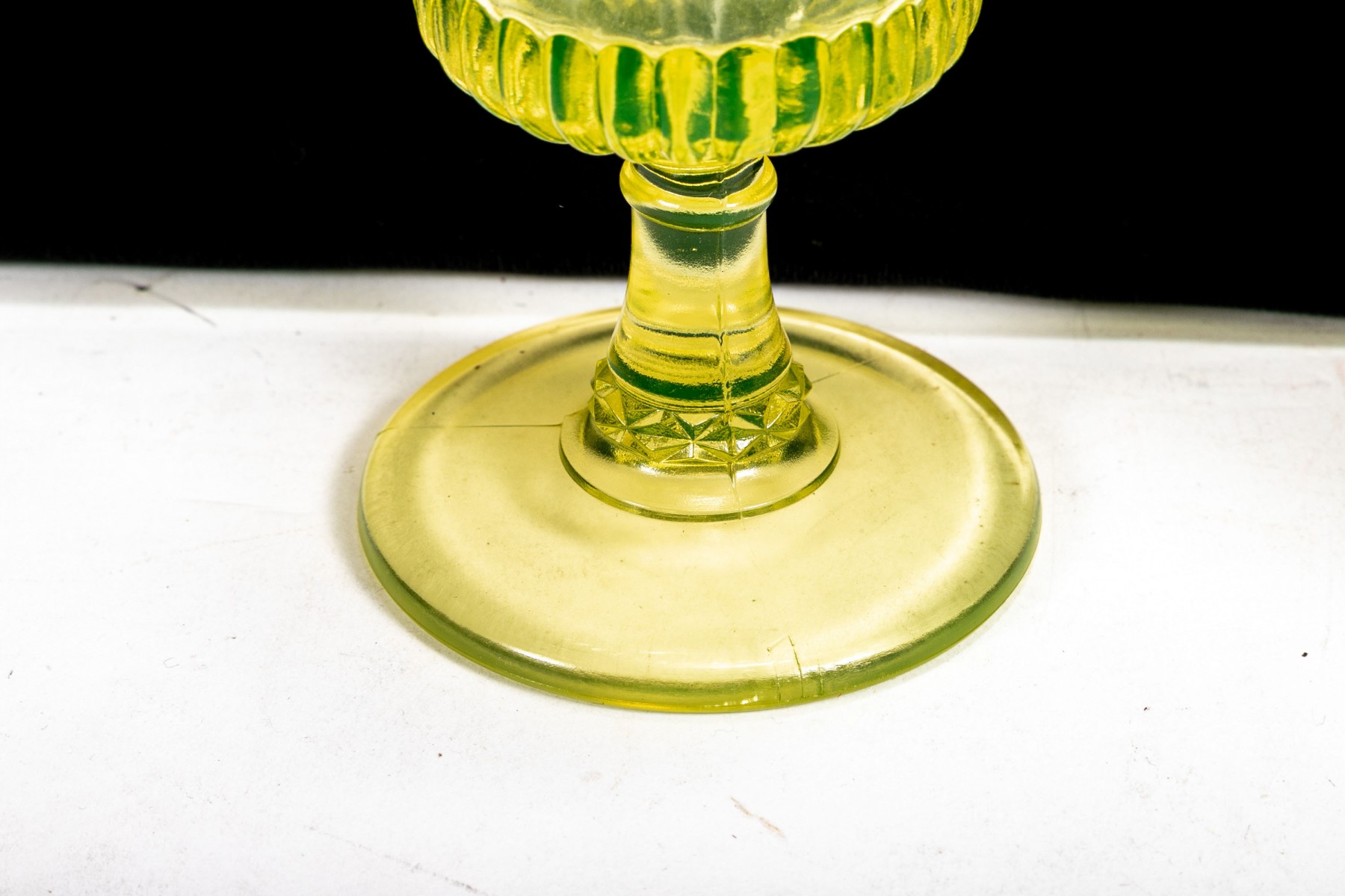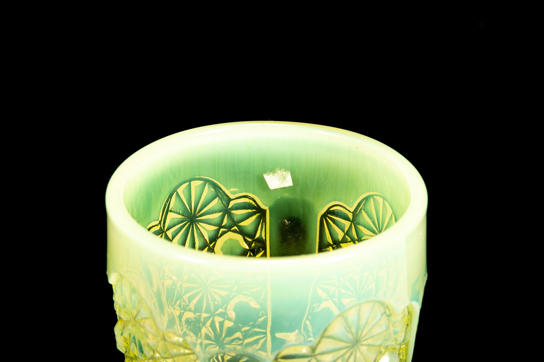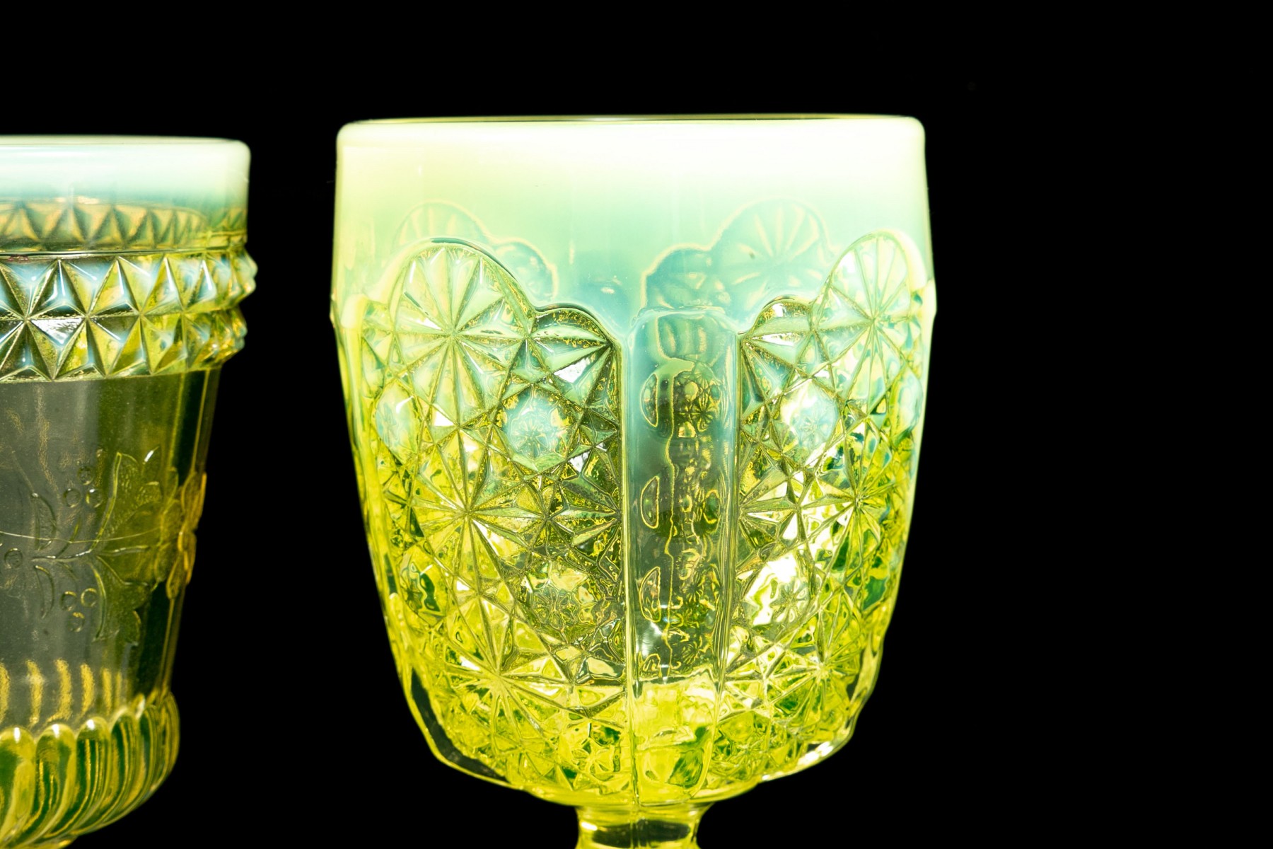 Great collection of uranium glass goblets in compatible patterns. Eight glasses display in L. Wright Daisy and Button pattern, featuring rounded bowl bottoms decorated with large and small starbursts. Five glasses display in Adams & Co. Wildflower pattern, with bands of cut triangles and low relief florals on a tapering cylindrical form, reaching a gadrooned bowl bottom. The glasses feature light ombres around the rims and high points.
