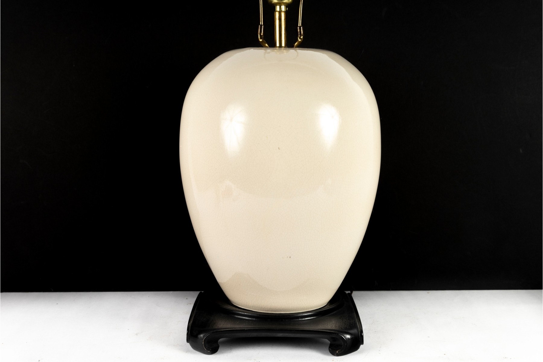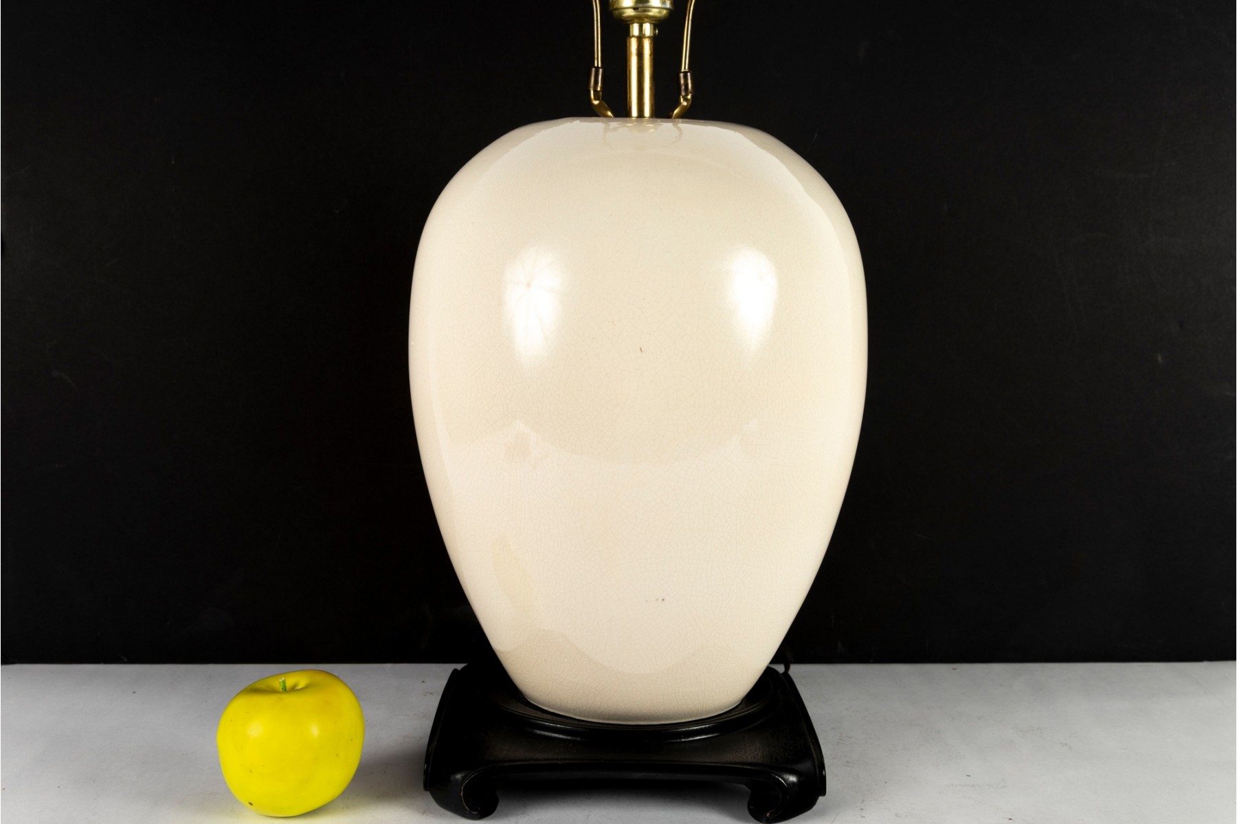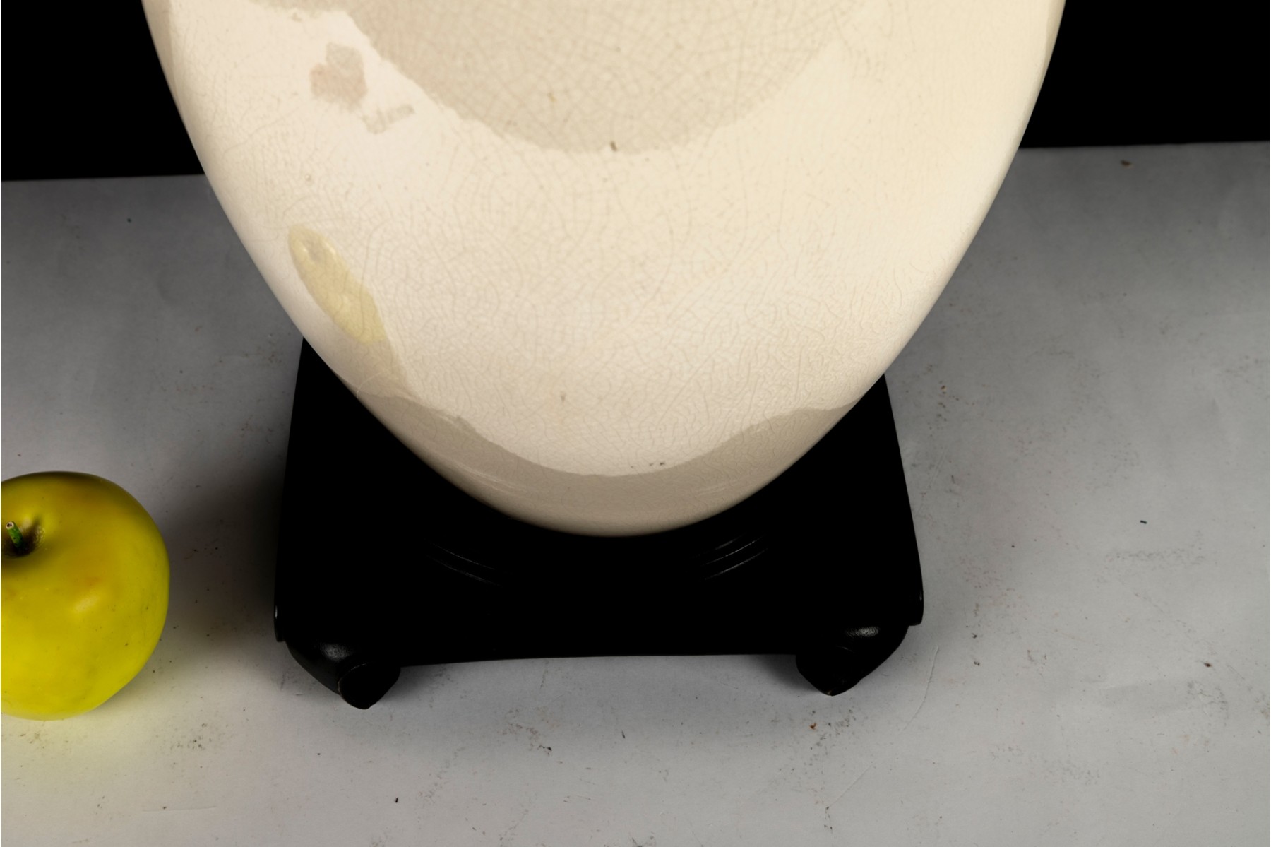An off-white or cream urn-form vase featuring crackle glass gloss finish -- displayed on a Ming form vase. No finial or shade included.