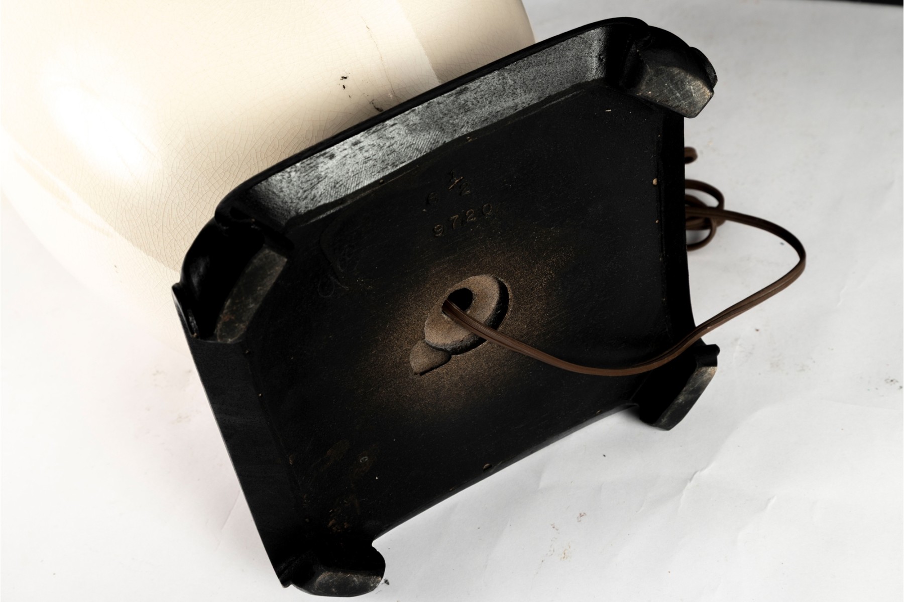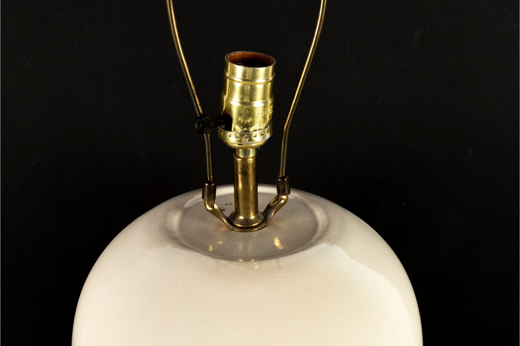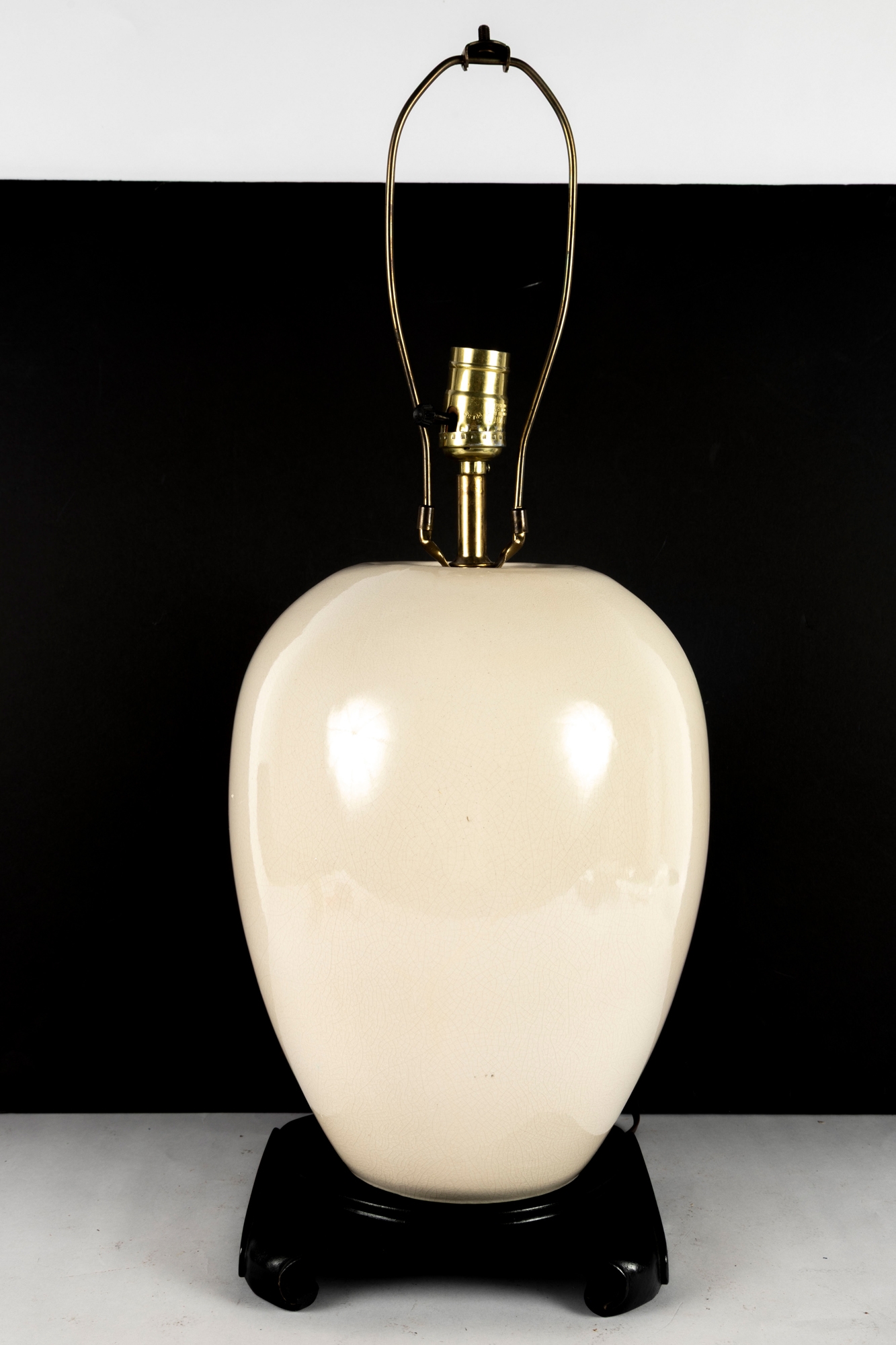 An off-white or cream urn-form vase featuring crackle glass gloss finish -- displayed on a Ming form vase. No finial or shade included.