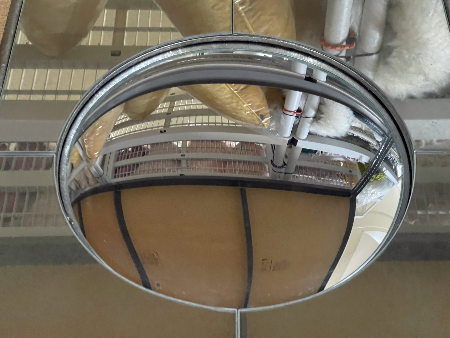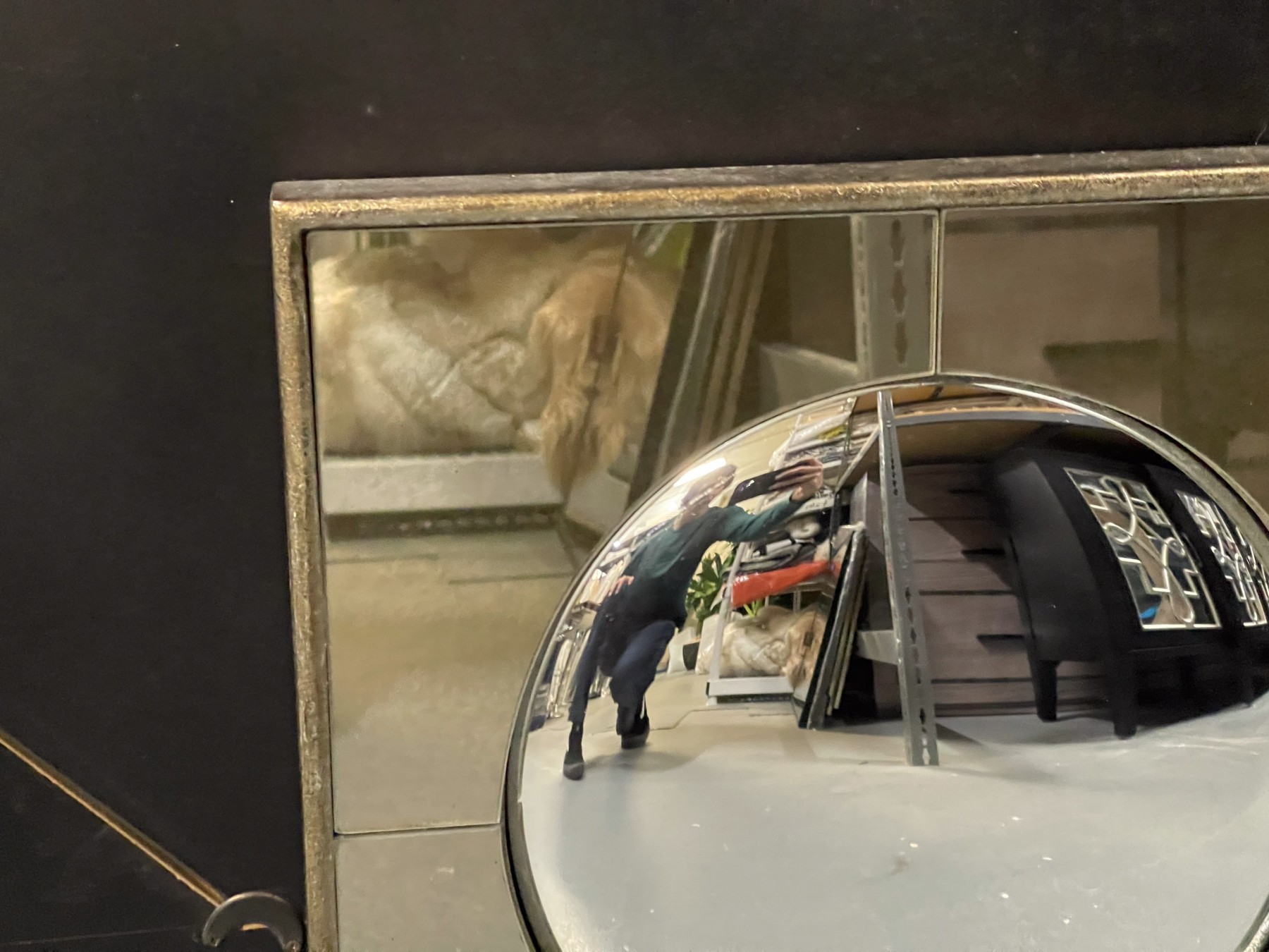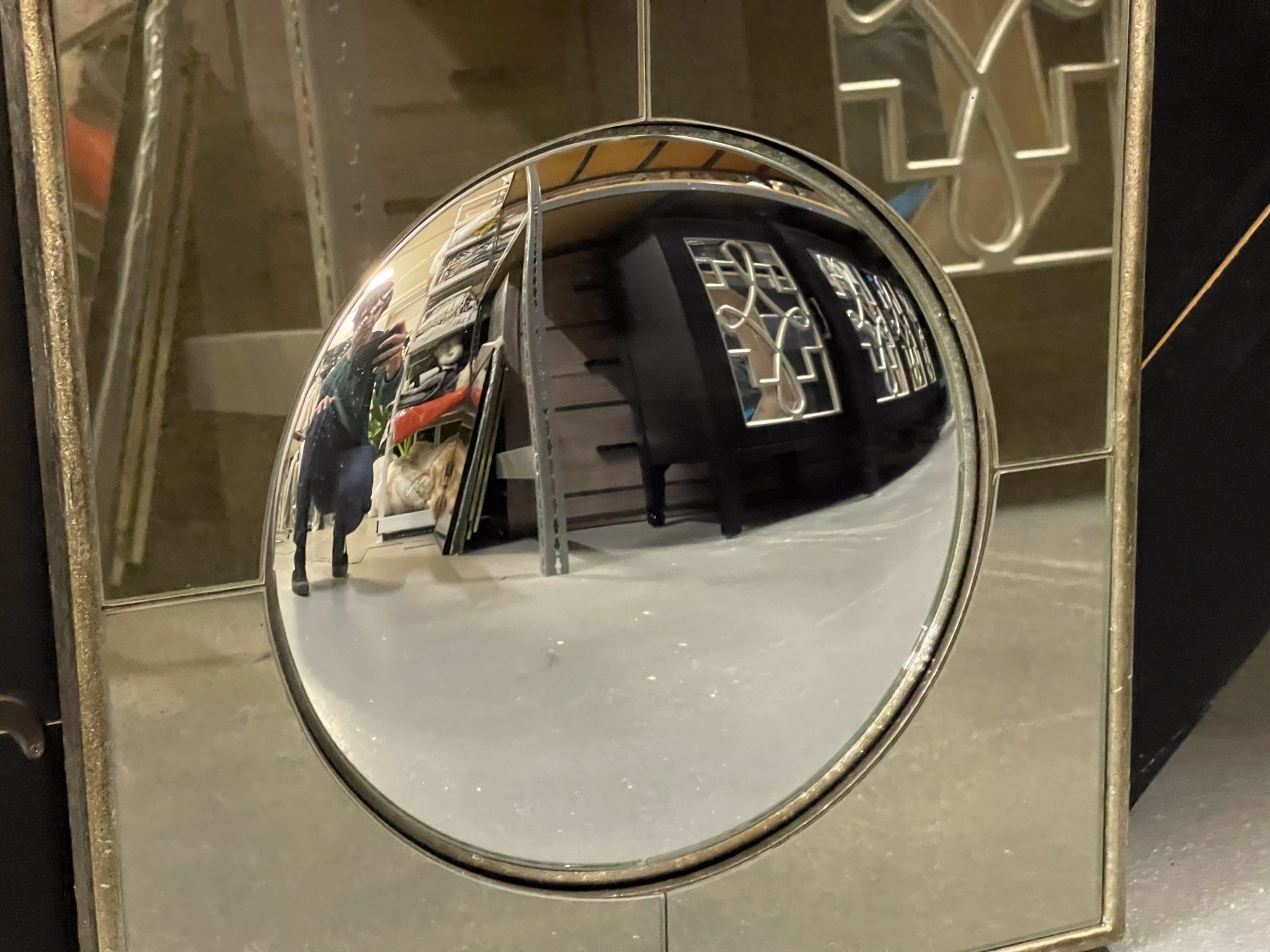 Champagne silver leaf frame with antiqued mirror accents and center convex mirror.