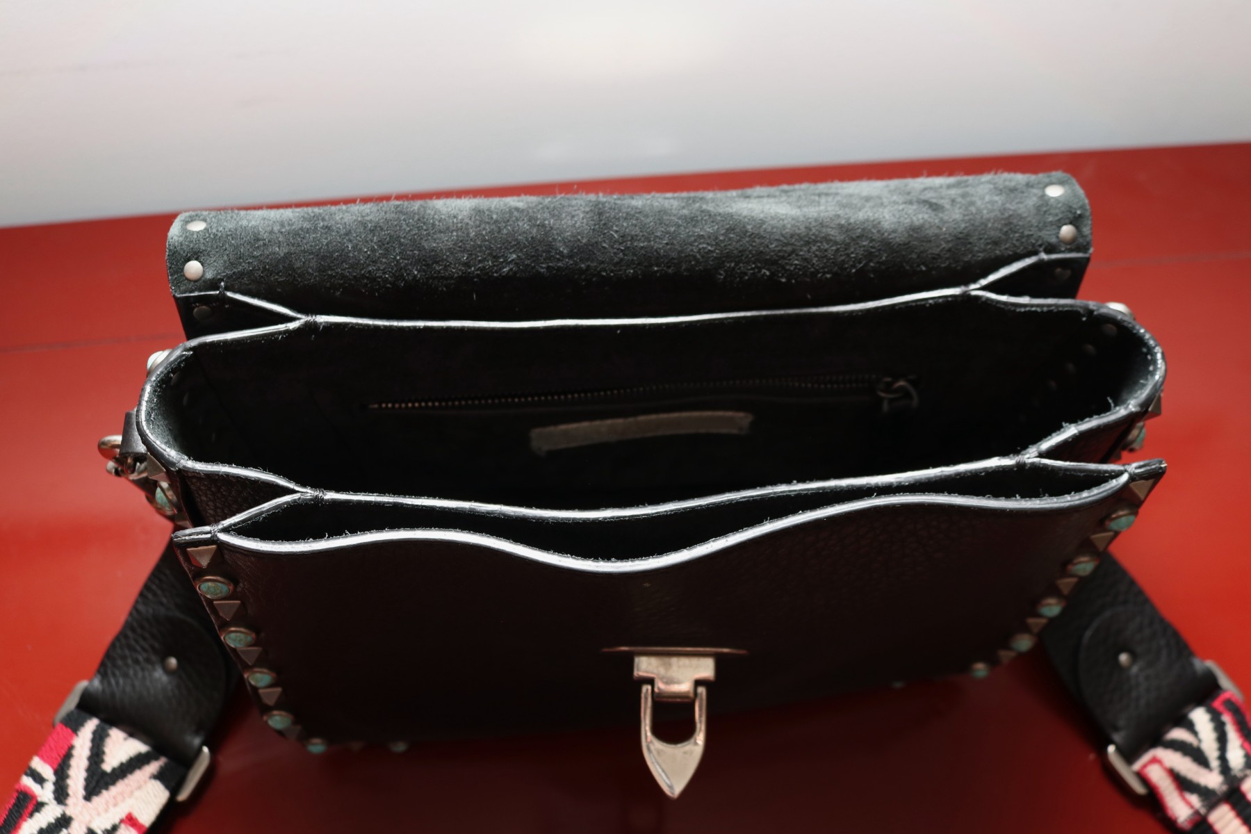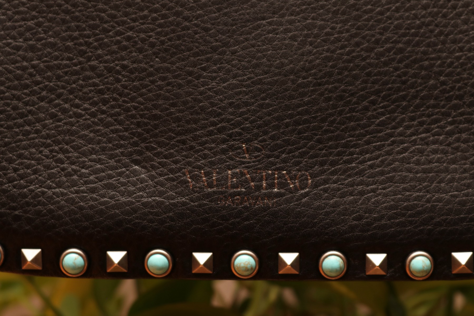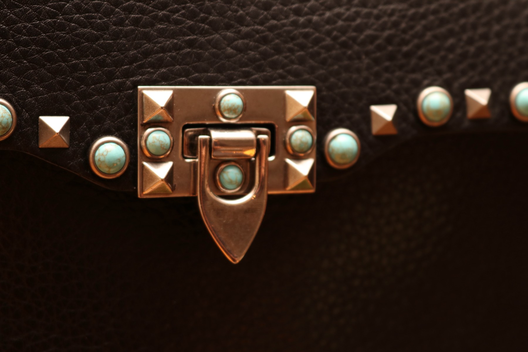 Bold meets bohemian in this standout Valentino Garavani Rockstud Crossbody Bag. Crafted from luxurious black pebbled leather and adorned with a striking combination of turquoise cabochon studs and signature pyramid Rockstuds. The bag features a structured silhouette with flap closure, secured by a polished silver-tone turn-lock clasp framed in brass with turquoise accents.