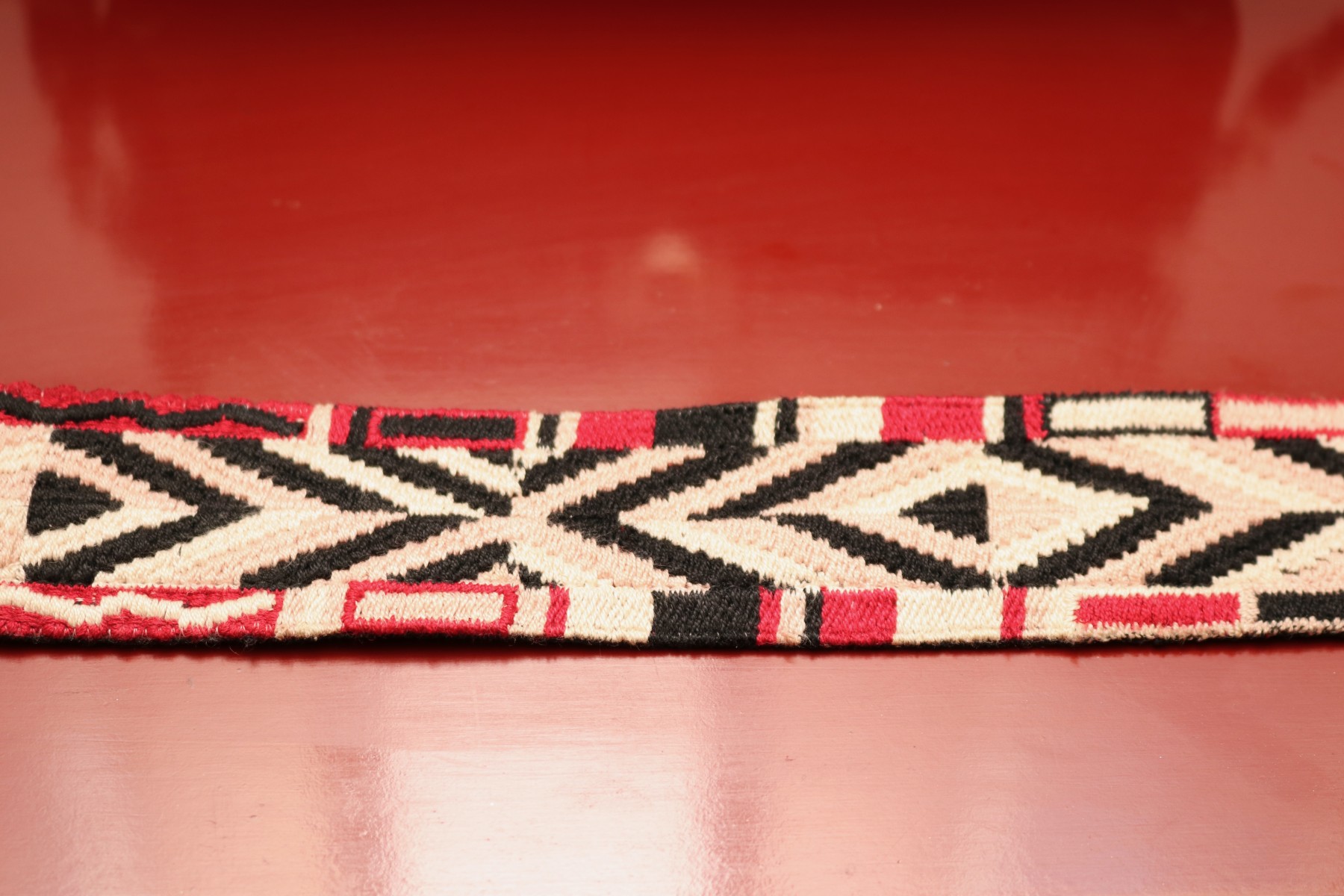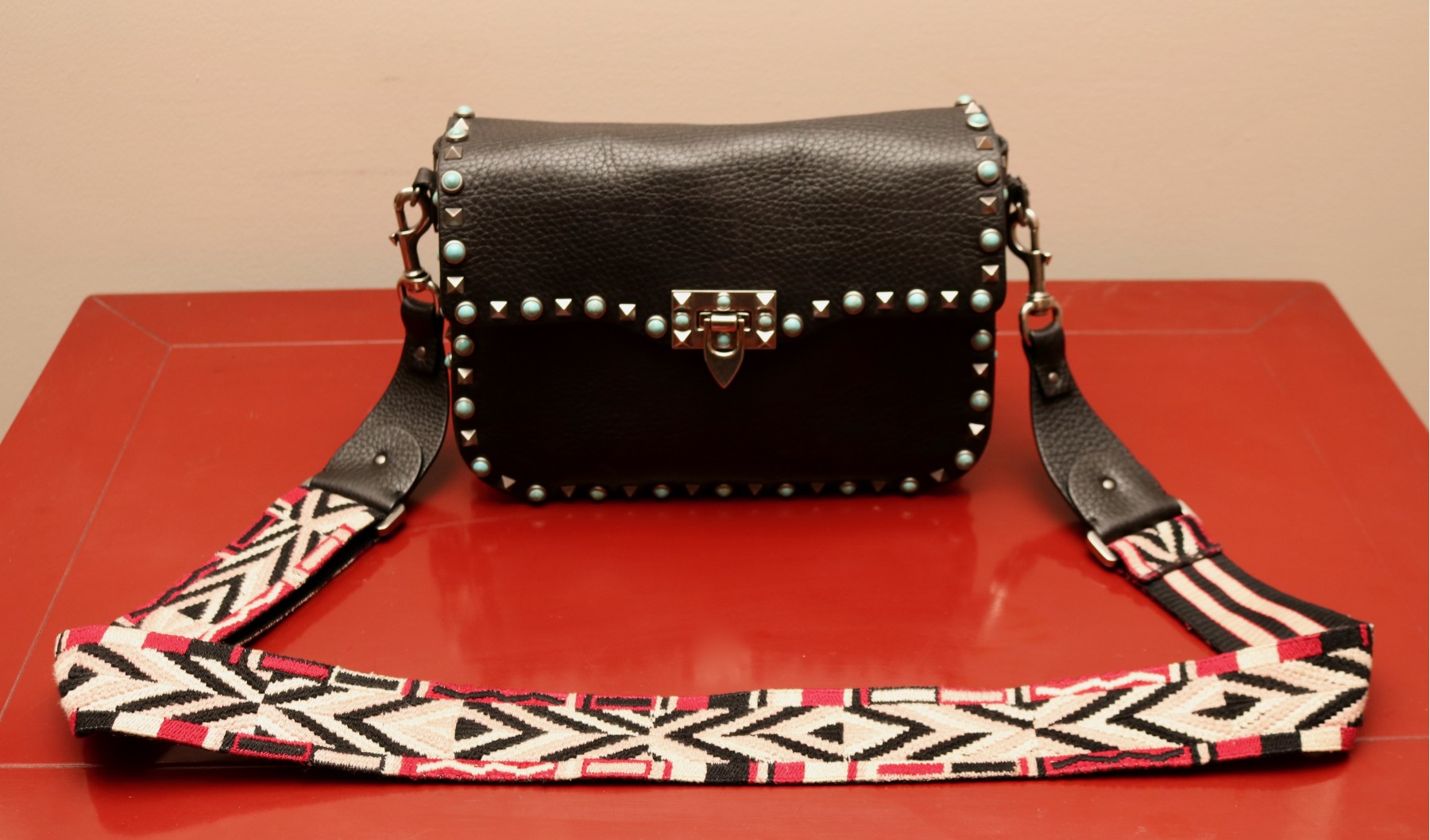 The wide detachable woven guitar-style strap is a showstopper on its own—vibrantly embroidered with geometric patterns in red, blush, black, and cream, offering a Western-Boho luxe aesthetic reminiscent of runway collections. The strap also features an embroidered “V” motif, nodding subtly to the Valentino name.