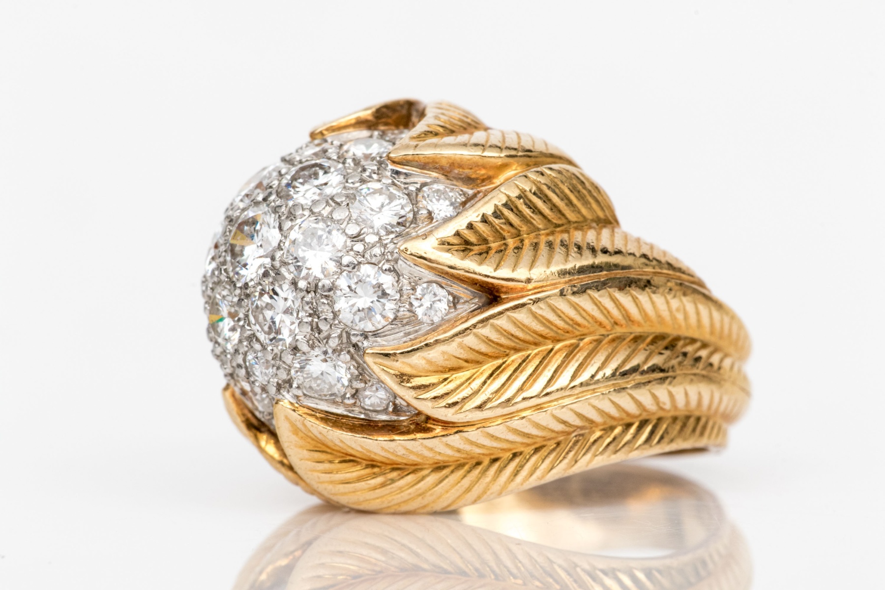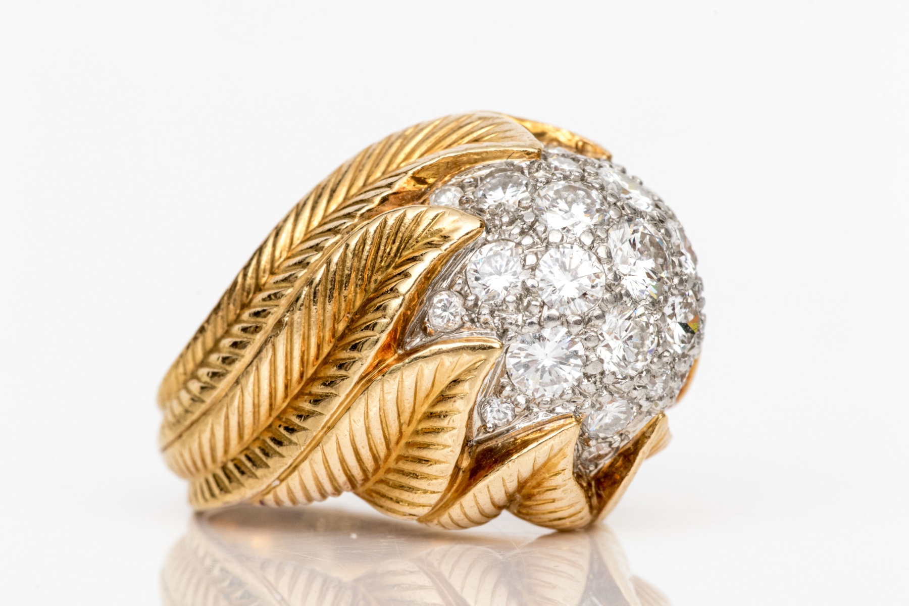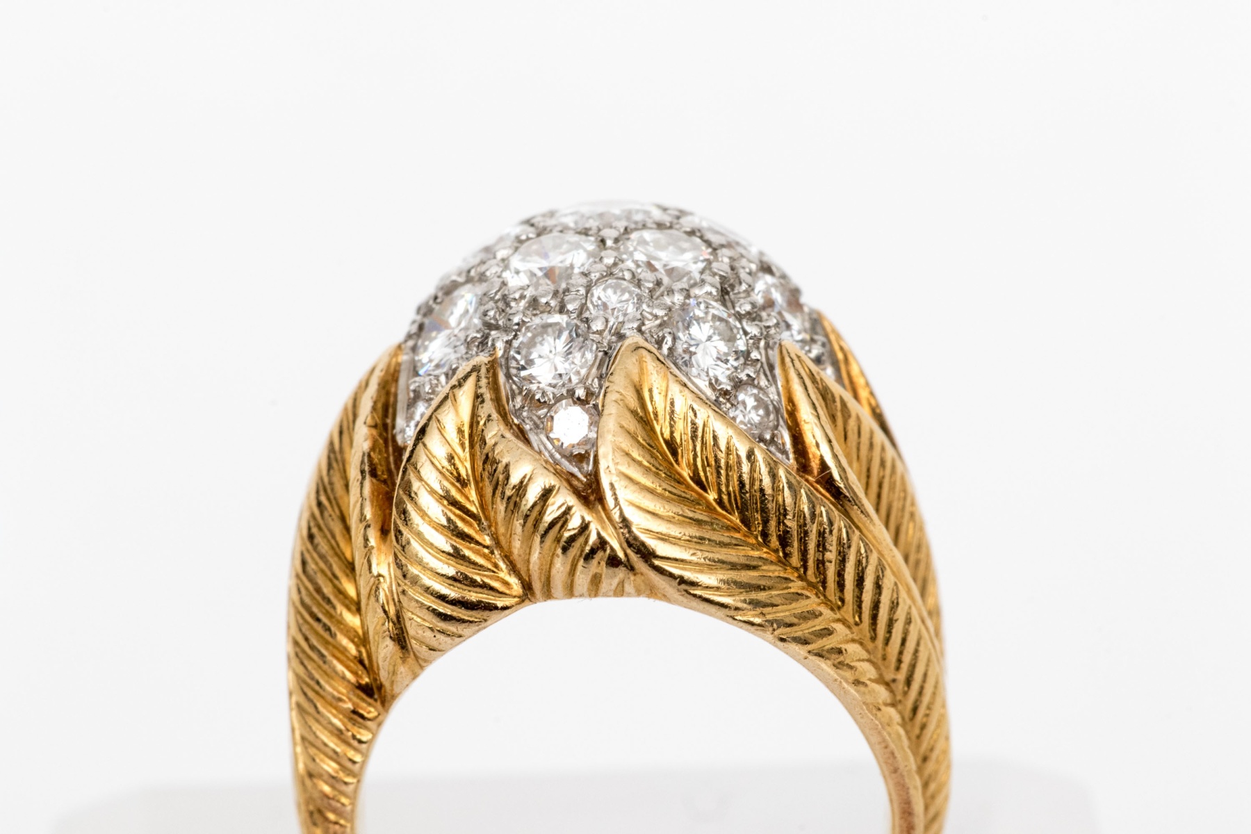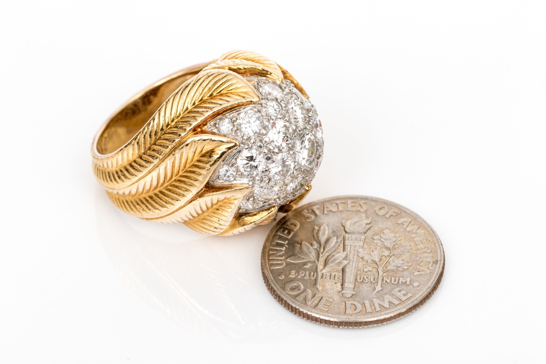 Van Cleef & Arpels 18k yellow gold stunning vintage pave diamond foliate ring, size 3.75. This magnifient domed style ring features a center of pave set round brilliant cut diamonds, app. 1.30 TCW, graced by a foliate patterning that twists and swirls throughout the shoulders and finishes through the shank. Please see note.