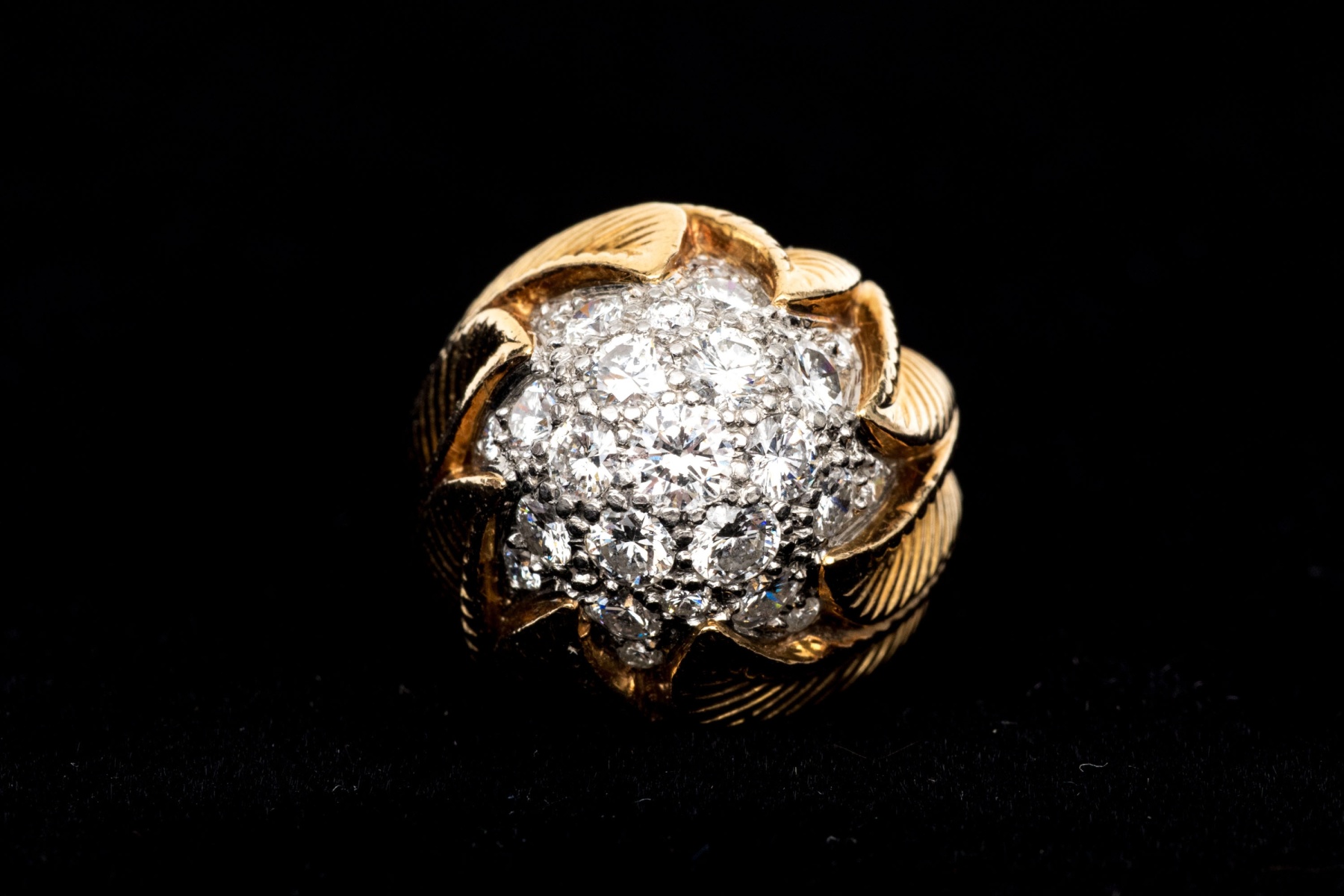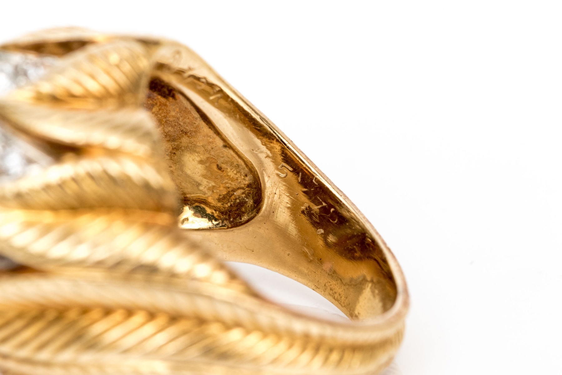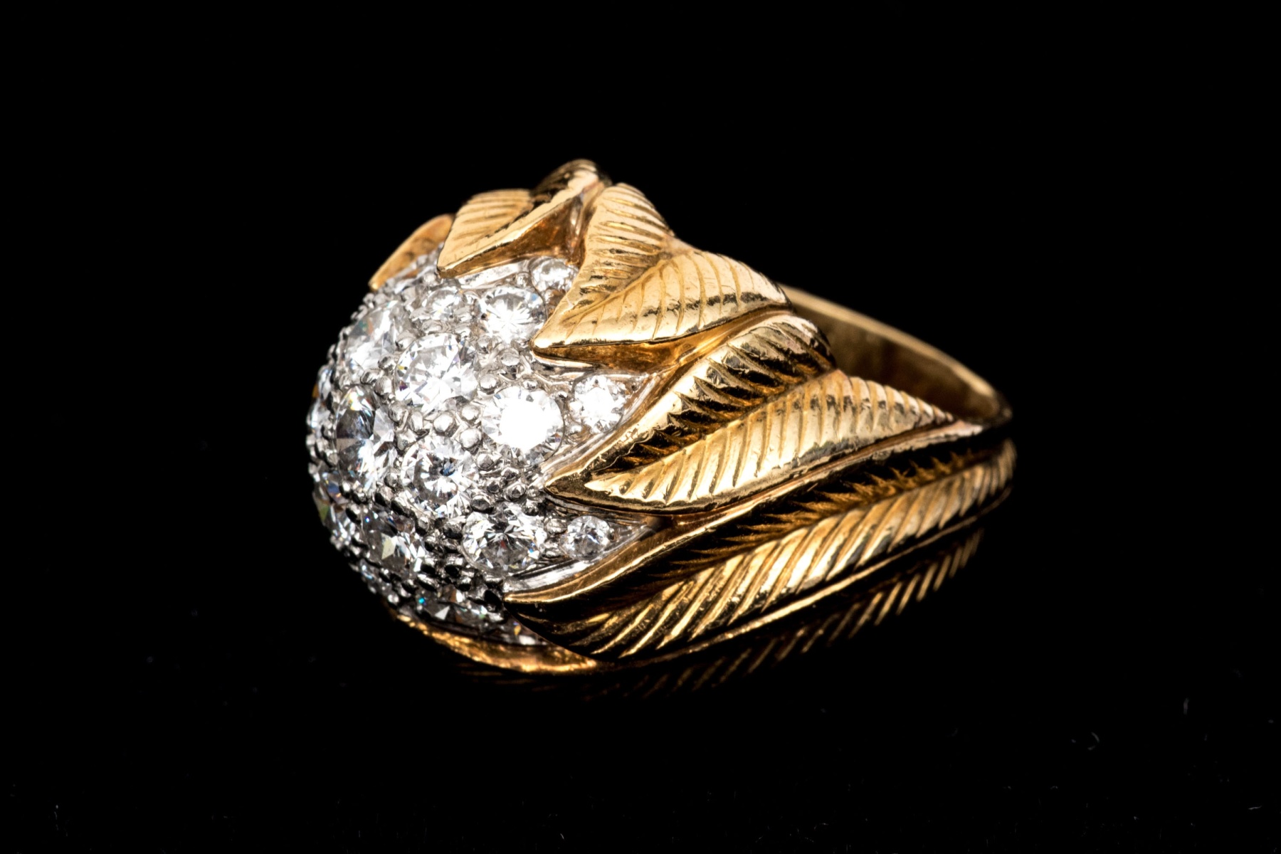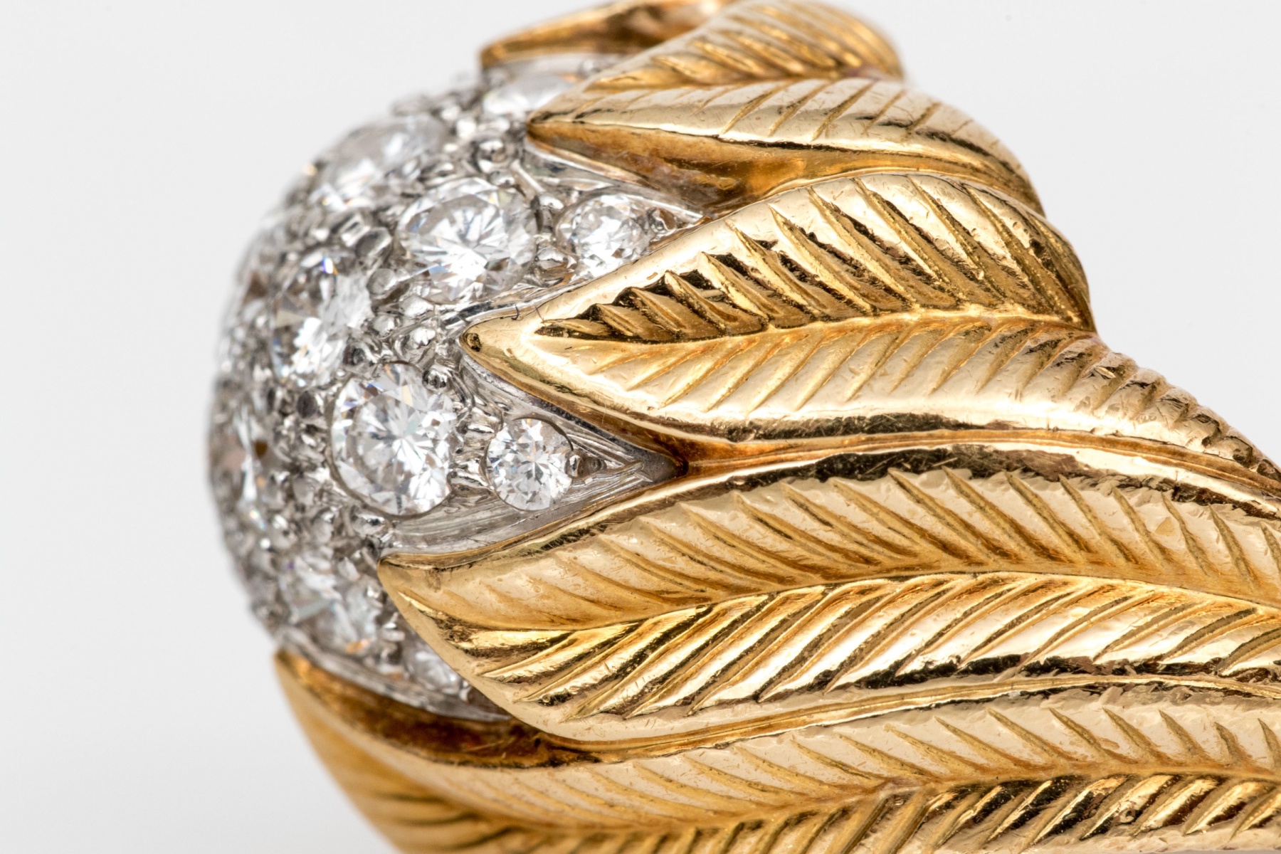 Van Cleef & Arpels 18k yellow gold stunning vintage pave diamond foliate ring, size 3.75. This magnifient domed style ring features a center of pave set round brilliant cut diamonds, app. 1.30 TCW, graced by a foliate patterning that twists and swirls throughout the shoulders and finishes through the shank. Please see note.
