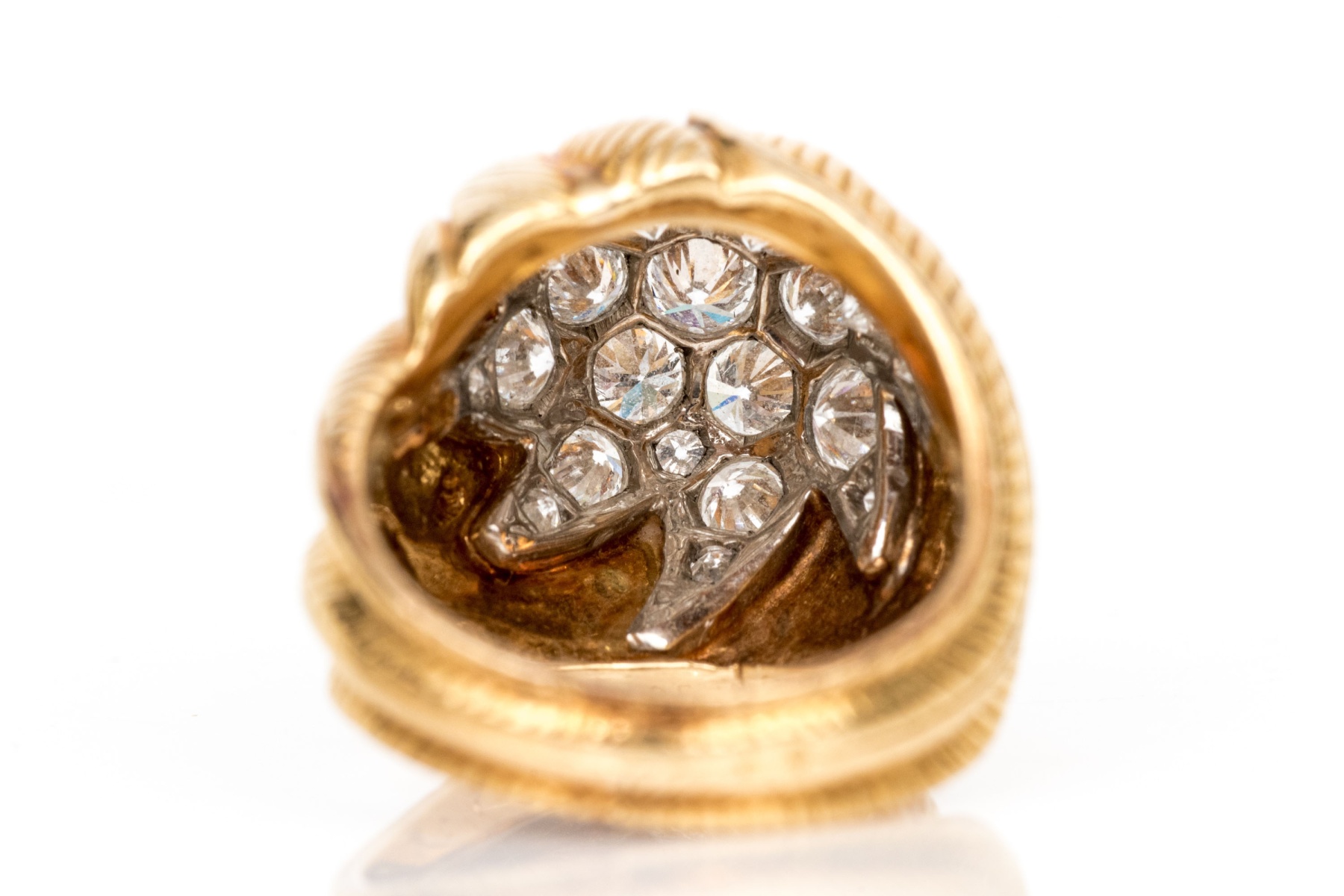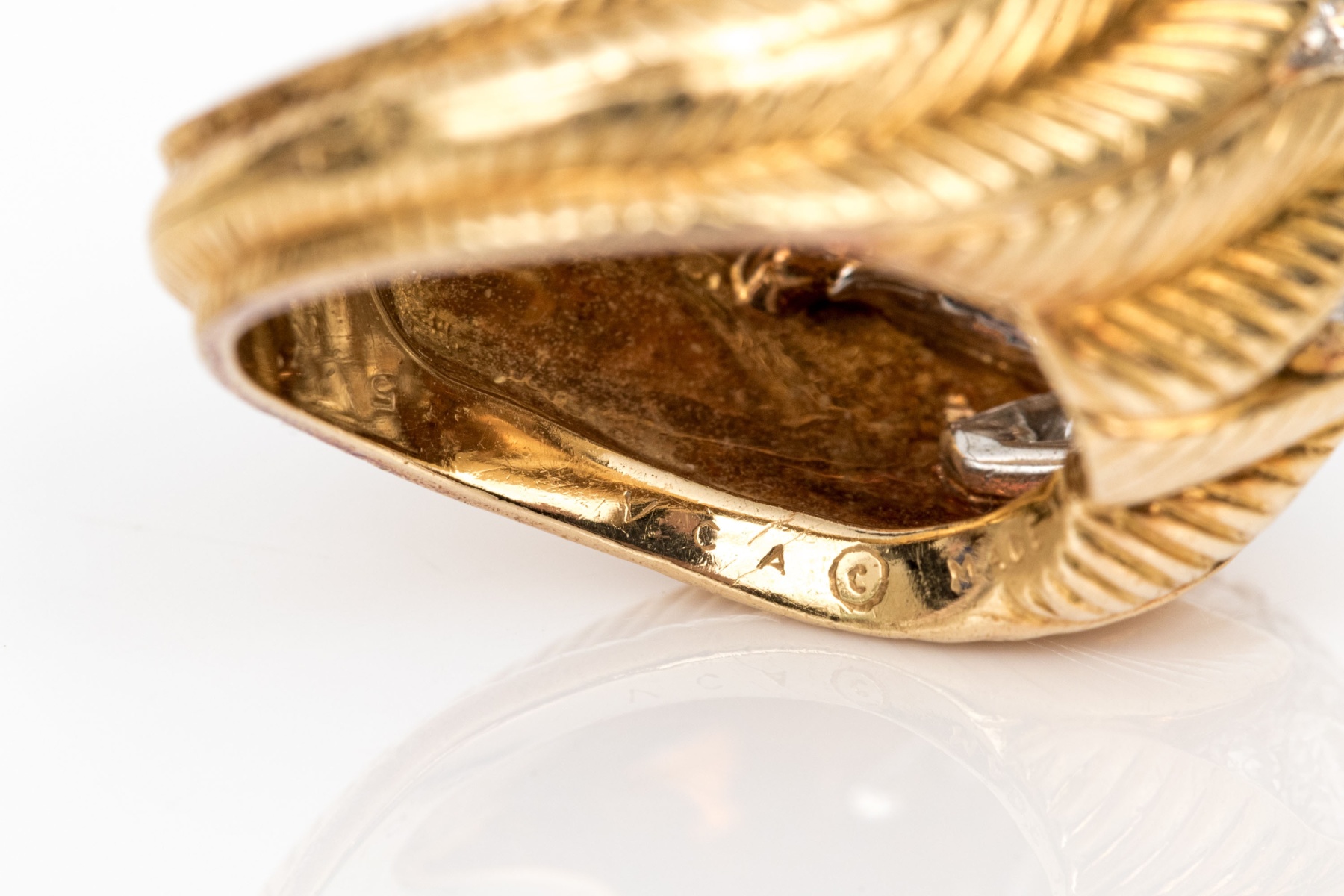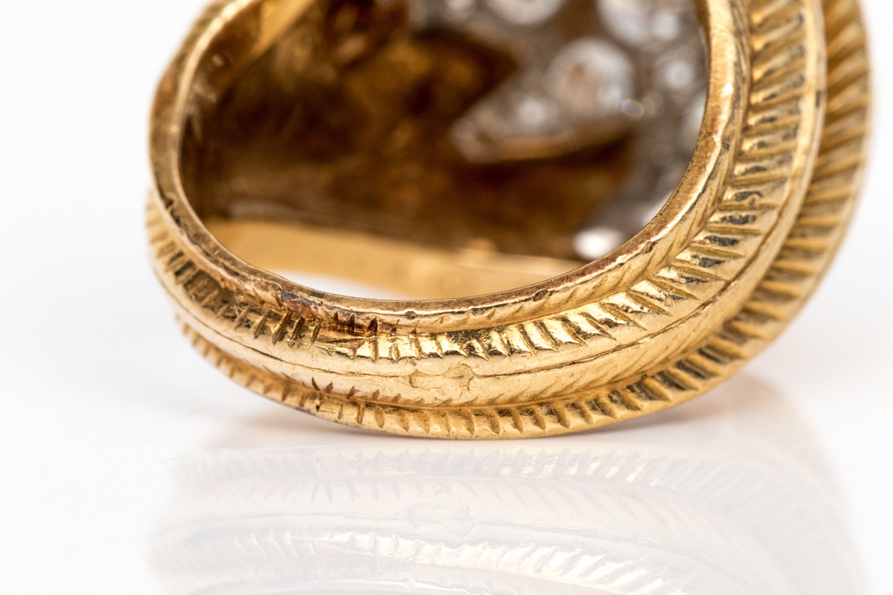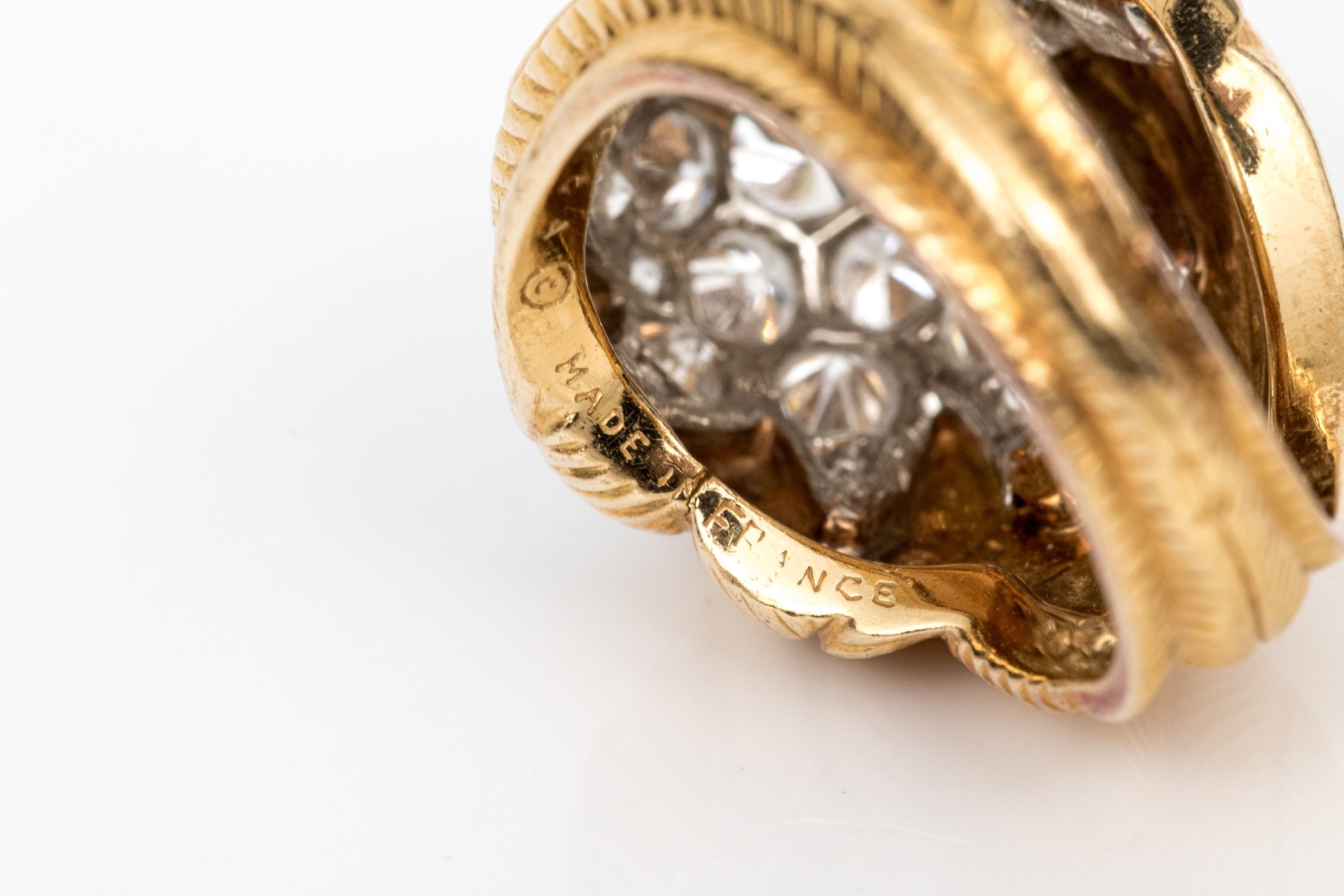 Van Cleef & Arpels 18k yellow gold stunning vintage pave diamond foliate ring, size 3.75. This magnifient domed style ring features a center of pave set round brilliant cut diamonds, app. 1.30 TCW, graced by a foliate patterning that twists and swirls throughout the shoulders and finishes through the shank. Please see note.