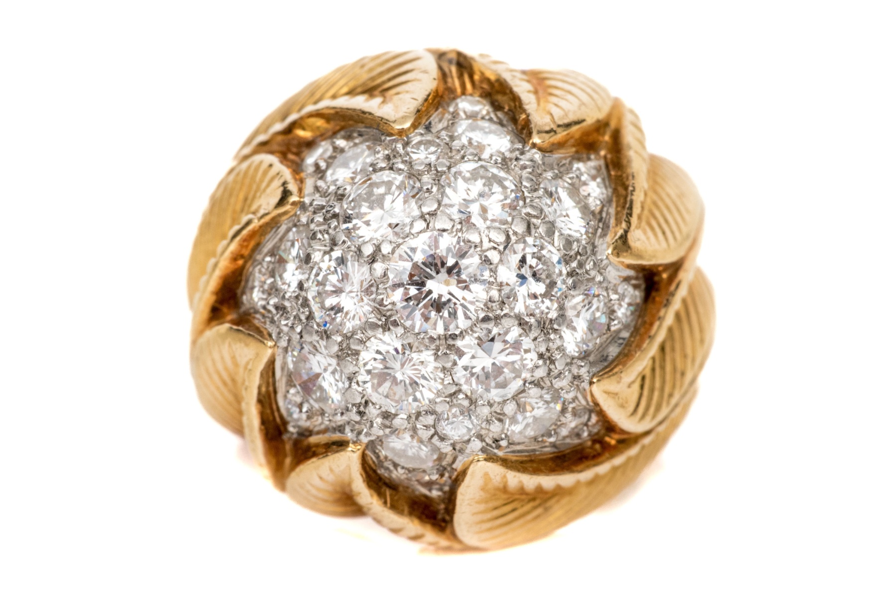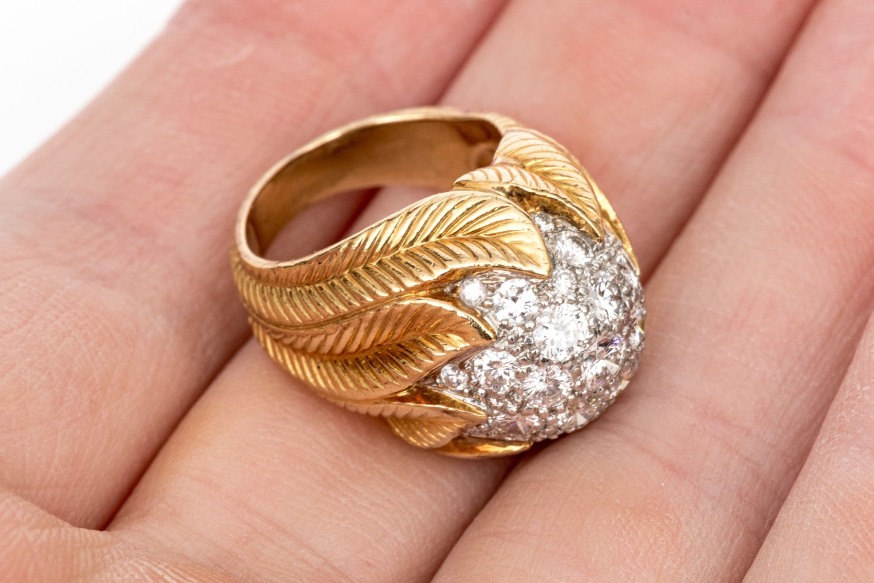 Van Cleef & Arpels 18k yellow gold stunning vintage pave diamond foliate ring, size 3.75. This magnifient domed style ring features a center of pave set round brilliant cut diamonds, app. 1.30 TCW, graced by a foliate patterning that twists and swirls throughout the shoulders and finishes through the shank. Please see note.