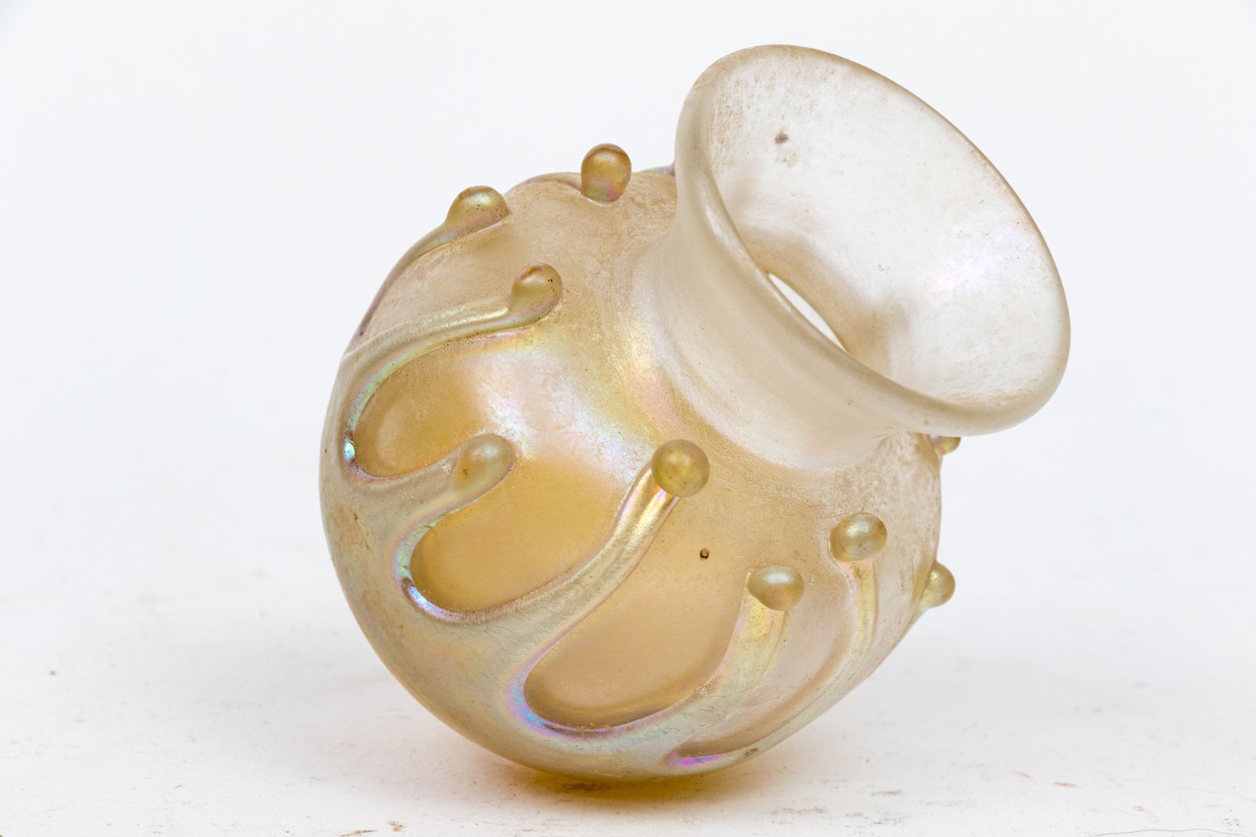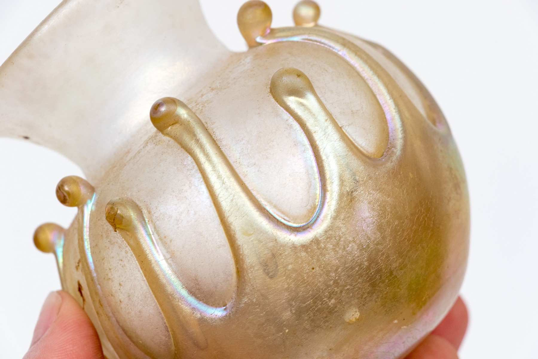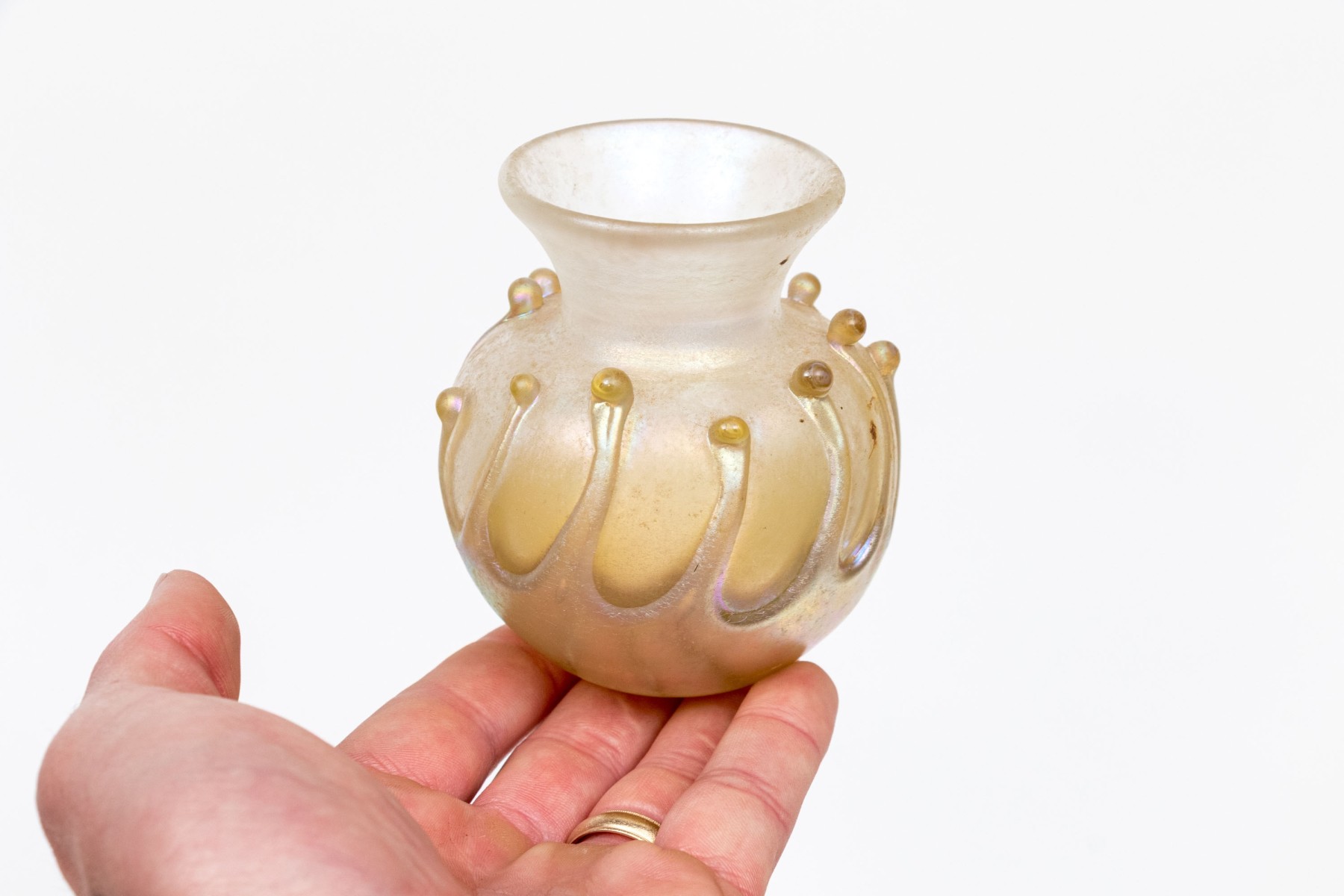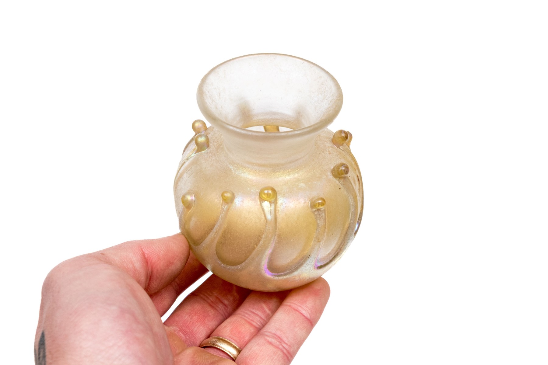 A gorgeous diminutive Vandermark Merritt iridescent art glass vase with an ovoid body and beaker form neck designed with a drip motif as though glass was dripped from the bottom of the vase with raised decoration where the end of drips terminate at the shoulder of the vase. Signed underfoot and dated 1981.