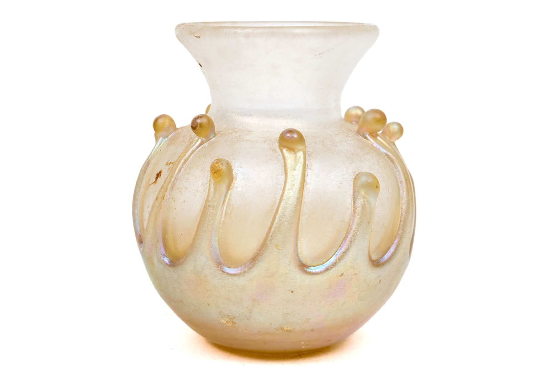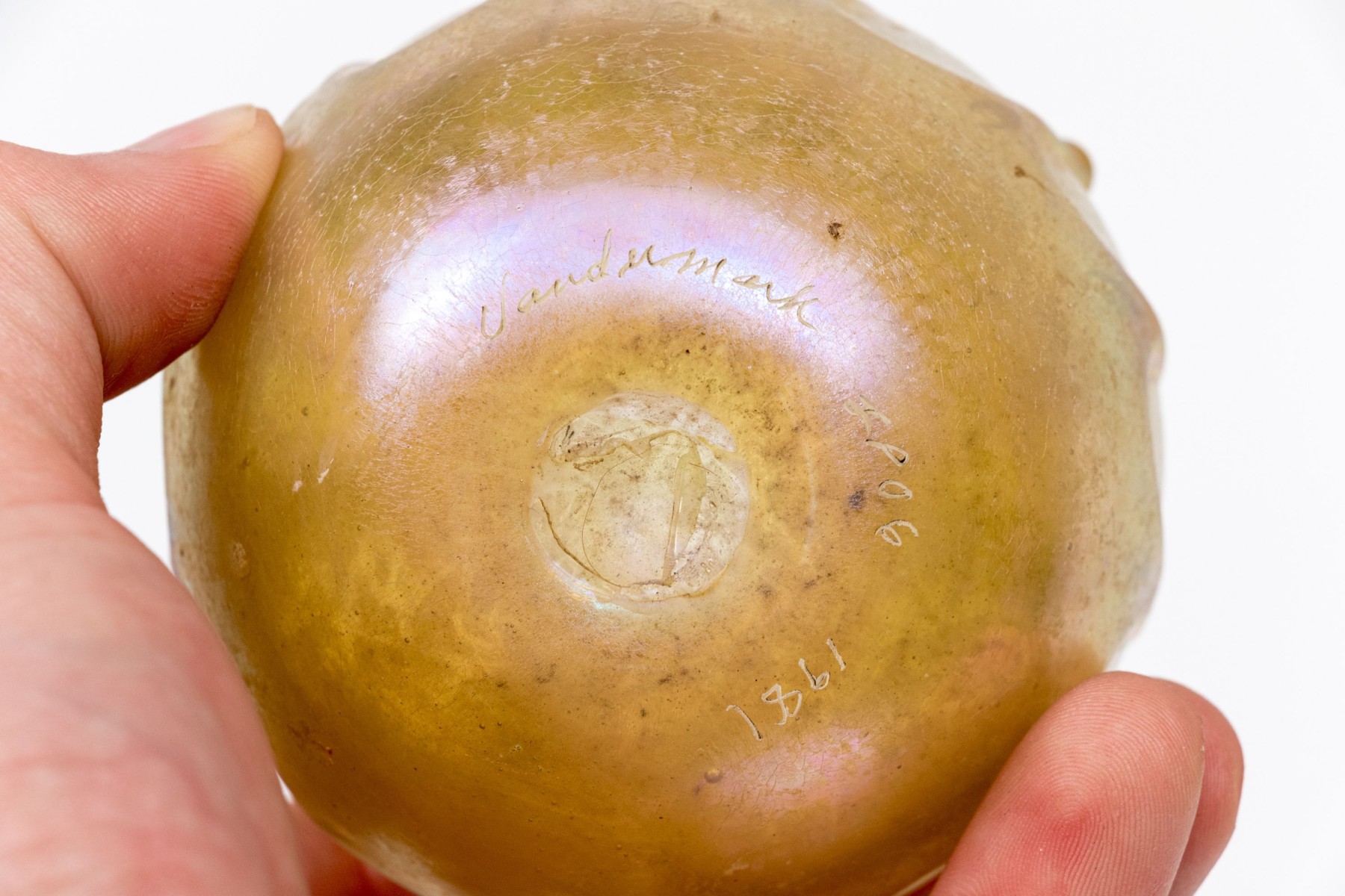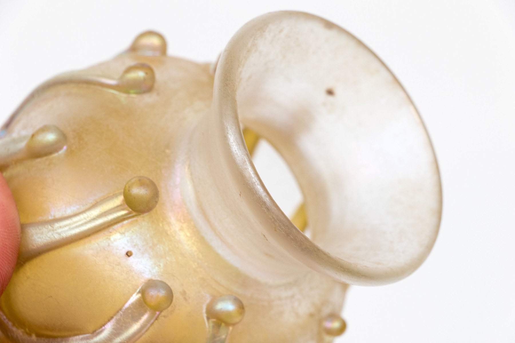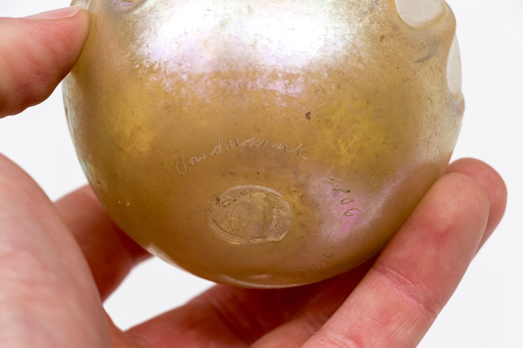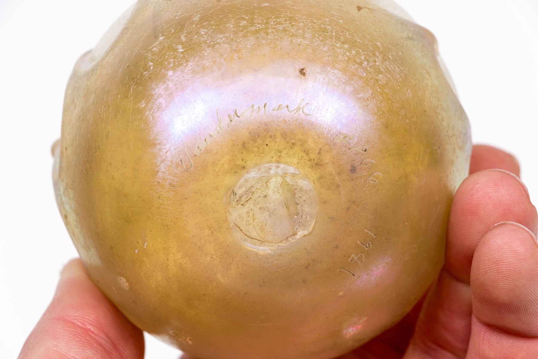A gorgeous diminutive Vandermark Merritt iridescent art glass vase with an ovoid body and beaker form neck designed with a drip motif as though glass was dripped from the bottom of the vase with raised decoration where the end of drips terminate at the shoulder of the vase. Signed underfoot and dated 1981.