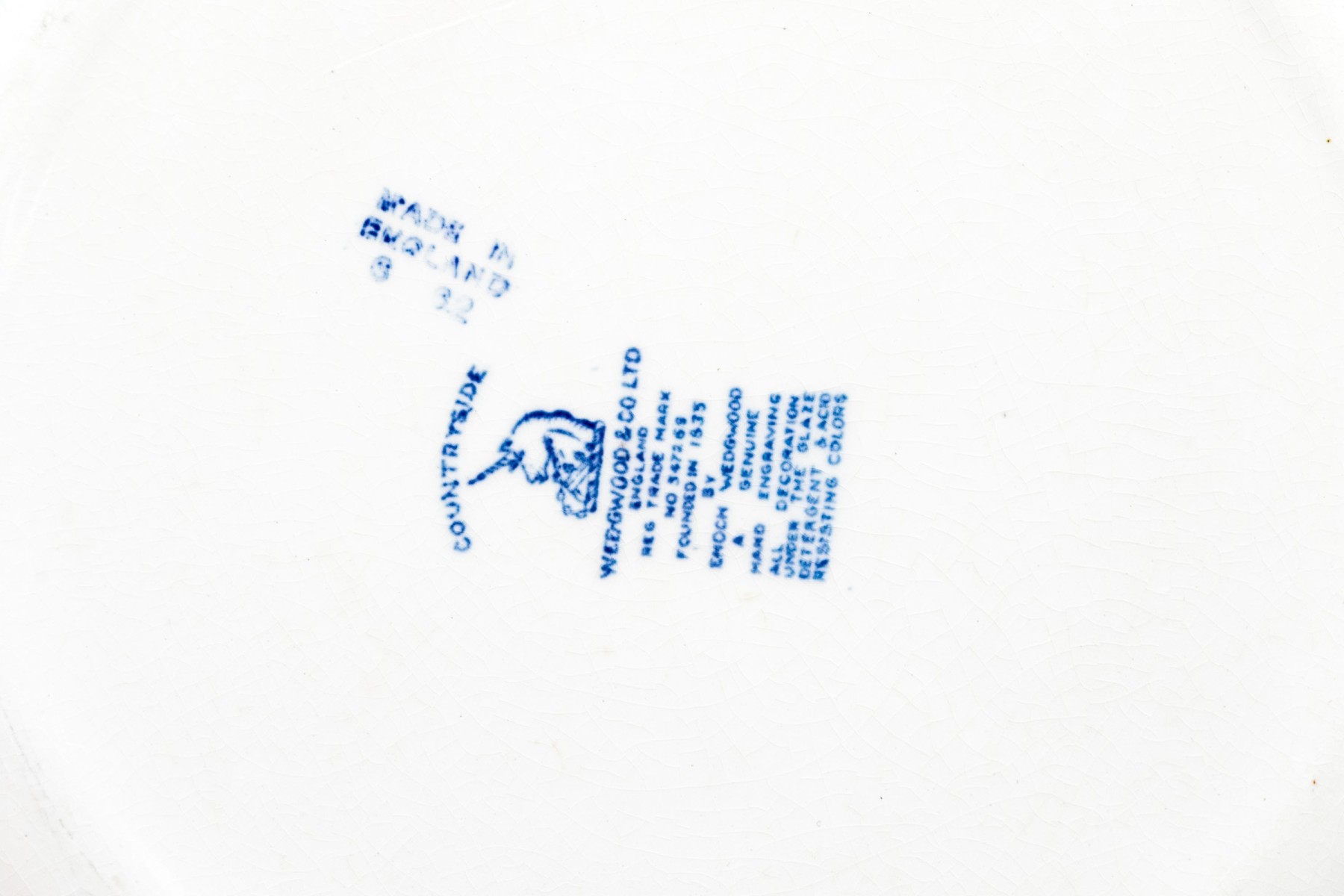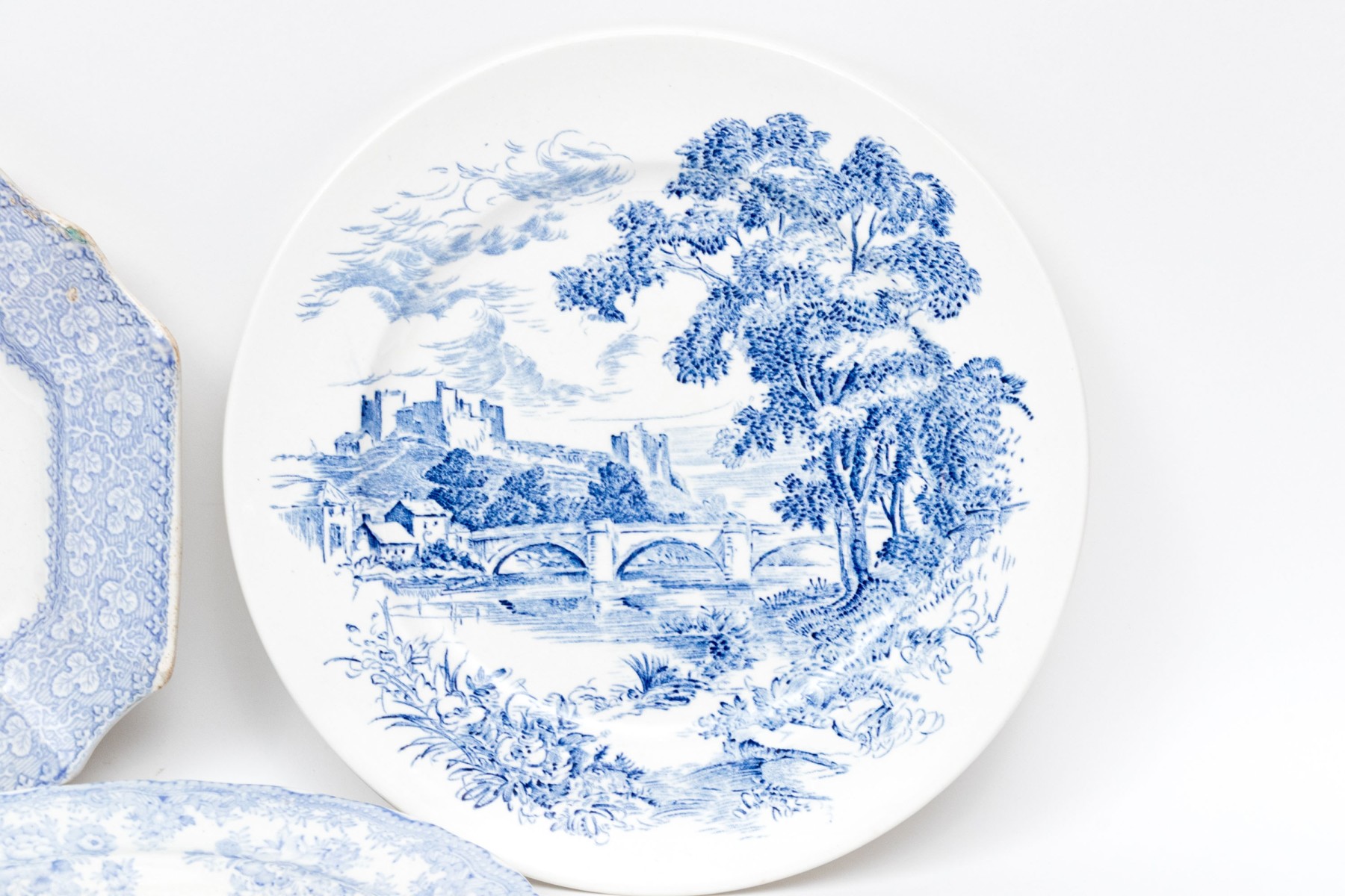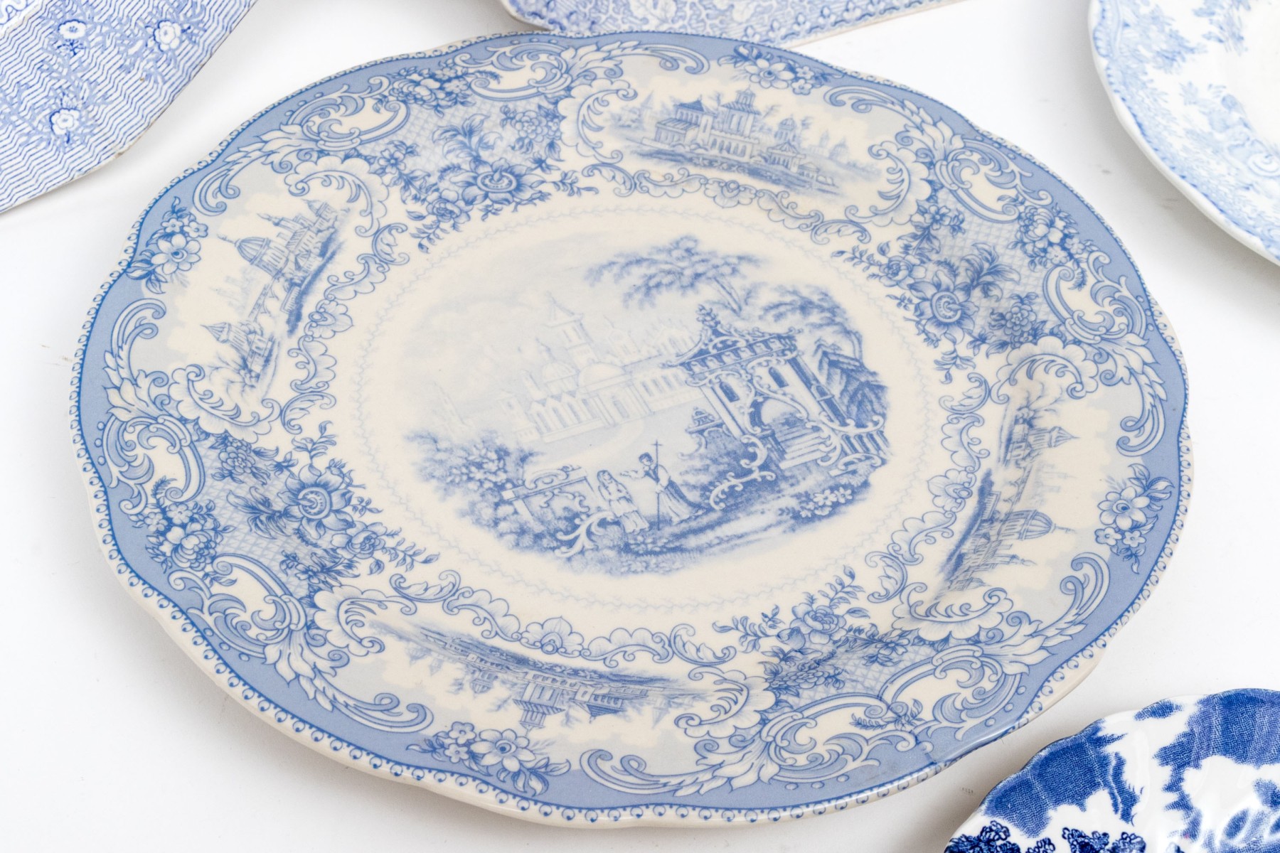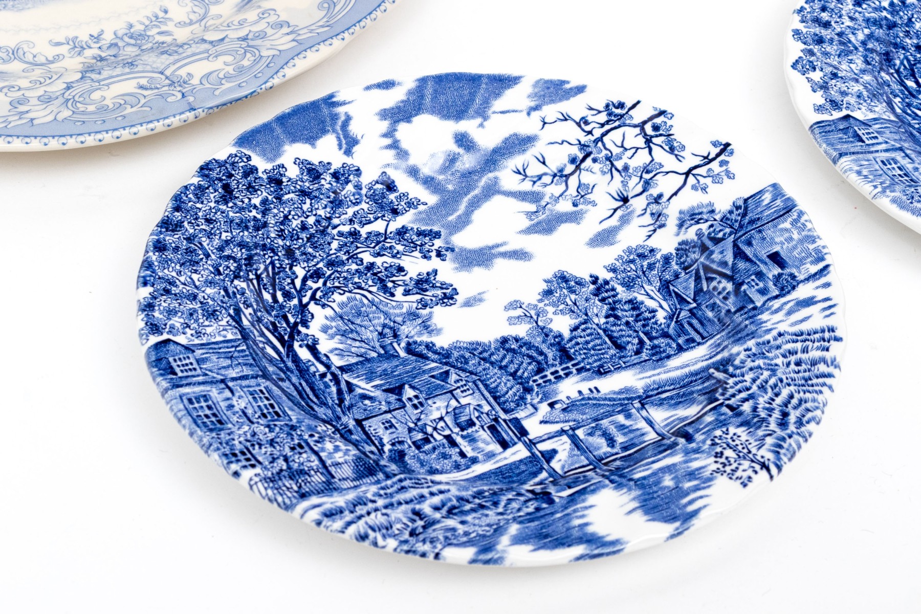 A wonderful variety of blue and white transferware china with makers including Johnson Bros, Wedgwood, and Formosa. Includes an assortment of four medium plates, two circular chargers, and one octagonal platter.