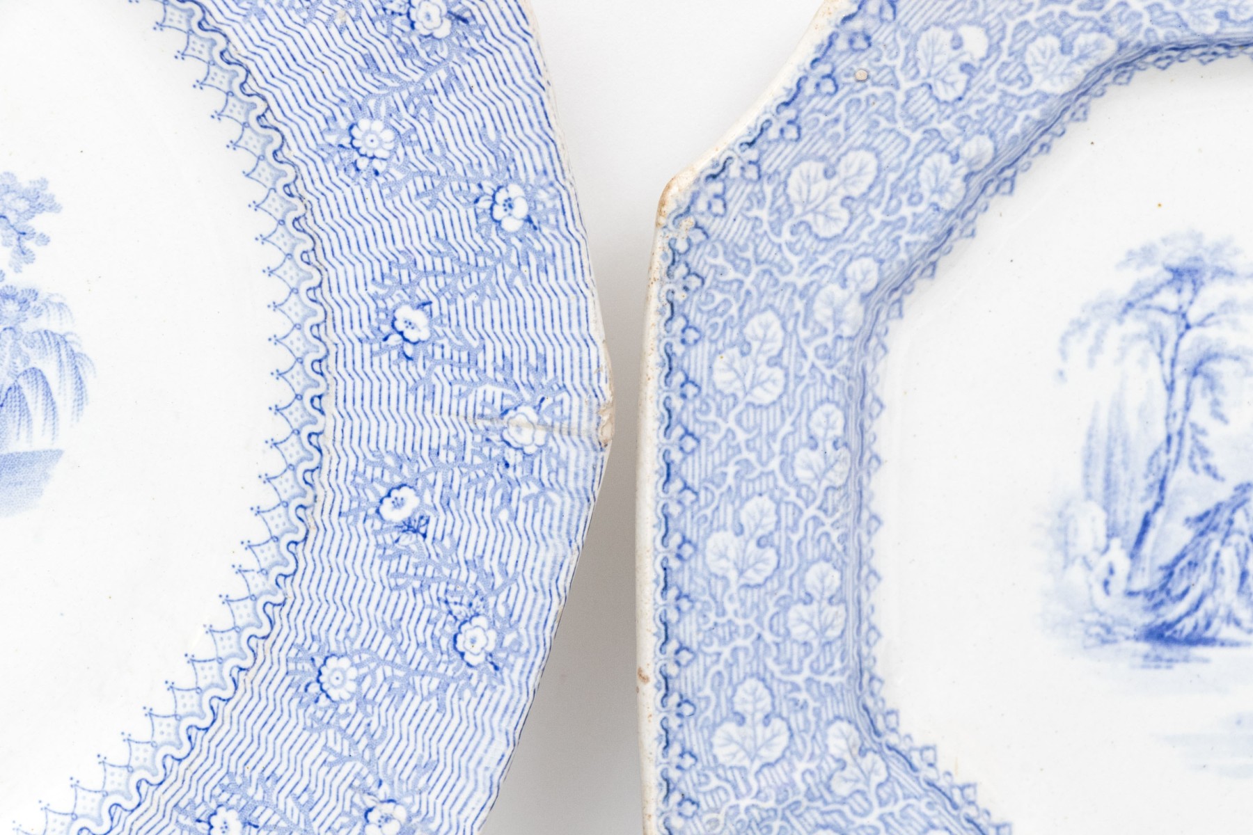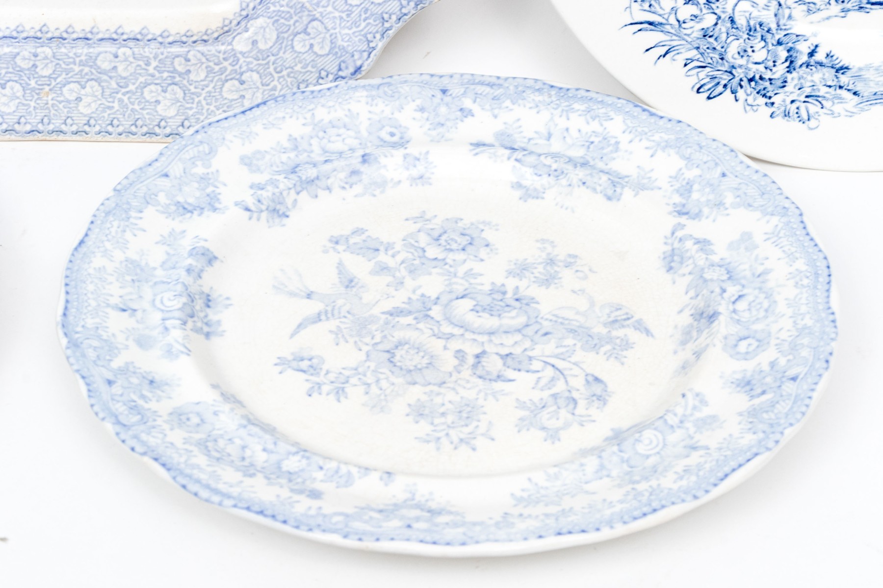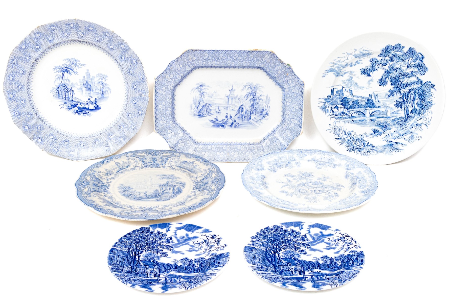 A wonderful variety of blue and white transferware china with makers including Johnson Bros, Wedgwood, and Formosa. Includes an assortment of four medium plates, two circular chargers, and one octagonal platter.