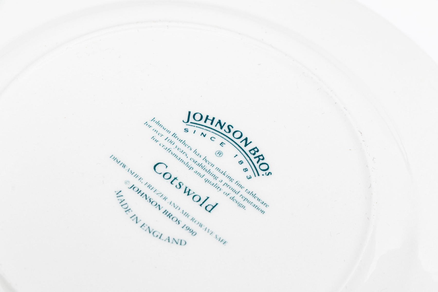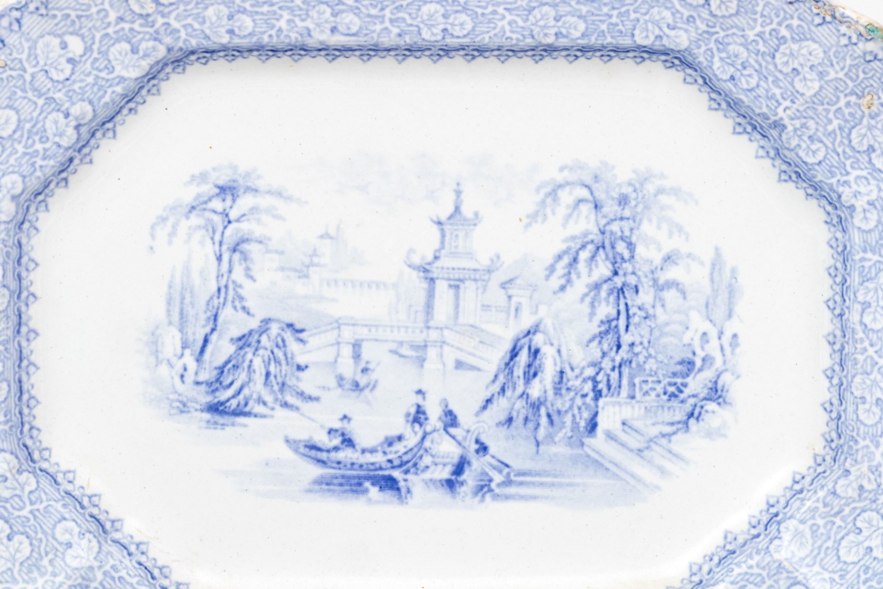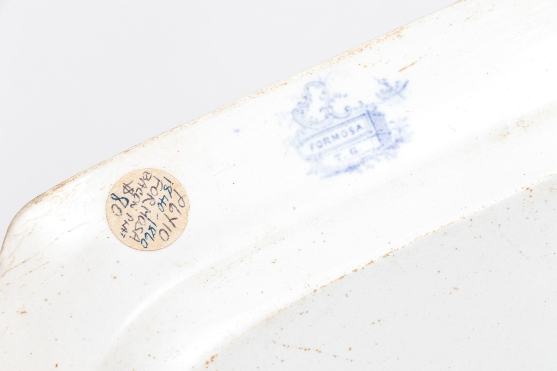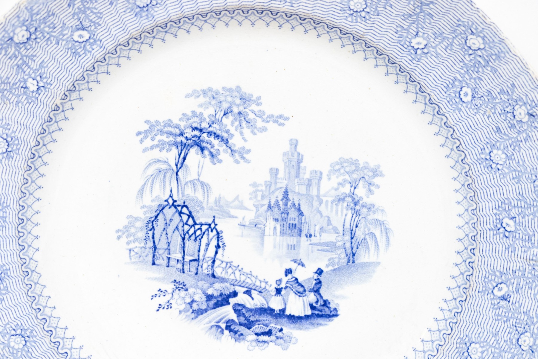 A wonderful variety of blue and white transferware china with makers including Johnson Bros, Wedgwood, and Formosa. Includes an assortment of four medium plates, two circular chargers, and one octagonal platter.