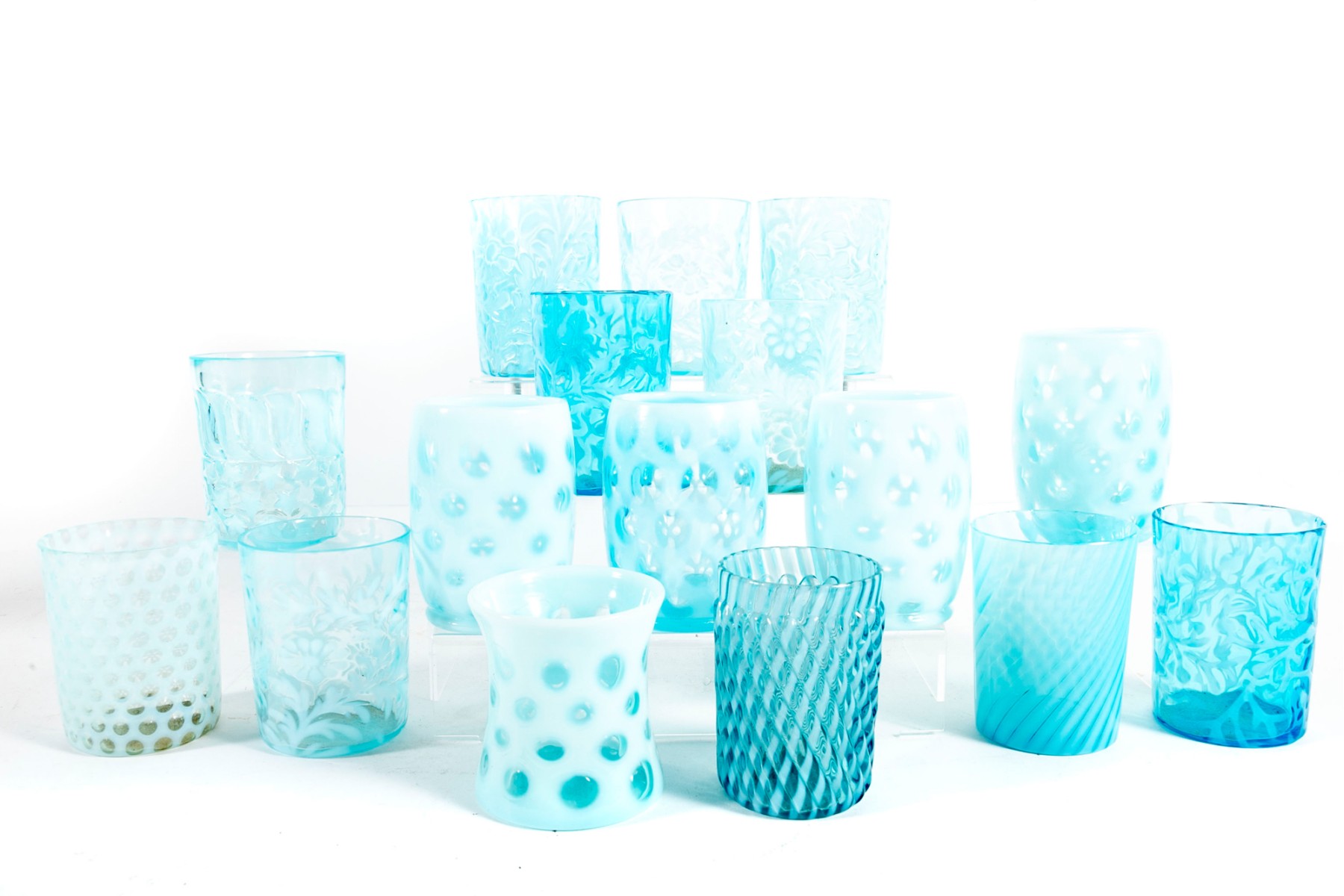 A variety of sixteen blue depression glass cups, likely including Fenton. Patterns include stars and stripes, coin spot, daisy and fern, and spiral striped designs over ribbed textures.