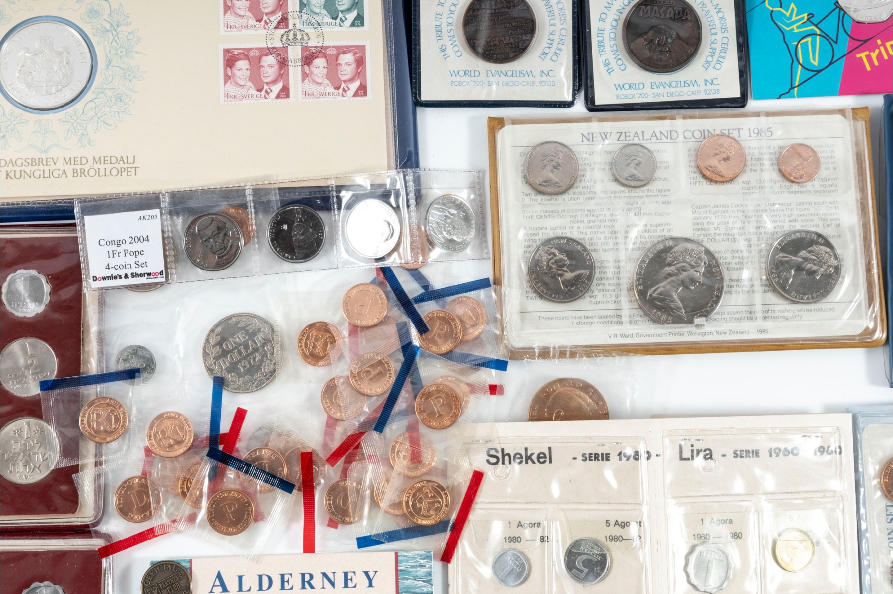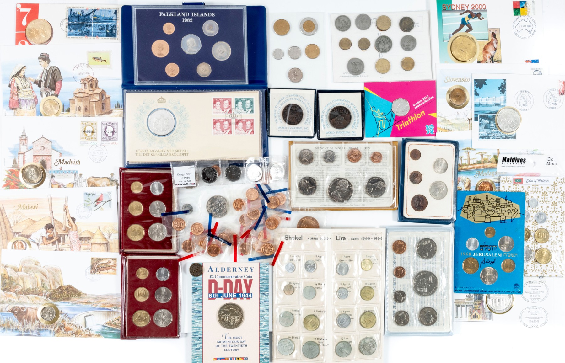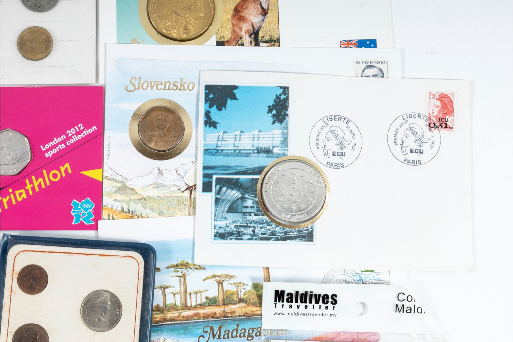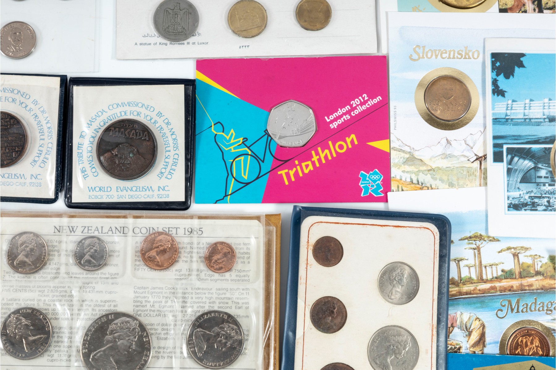 A wonderful variety of commemorative world coins, many with accompanying cards and protective holders.