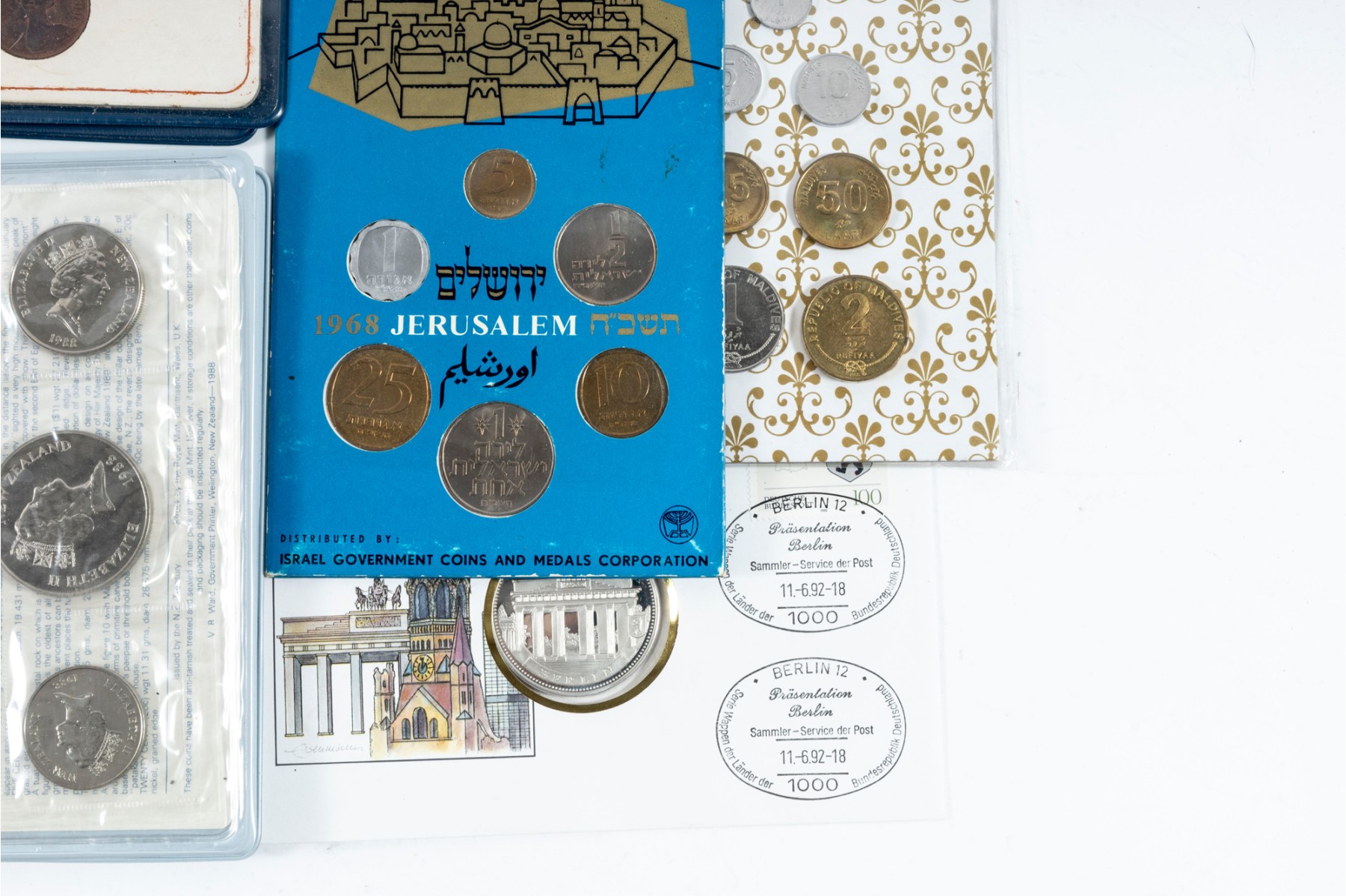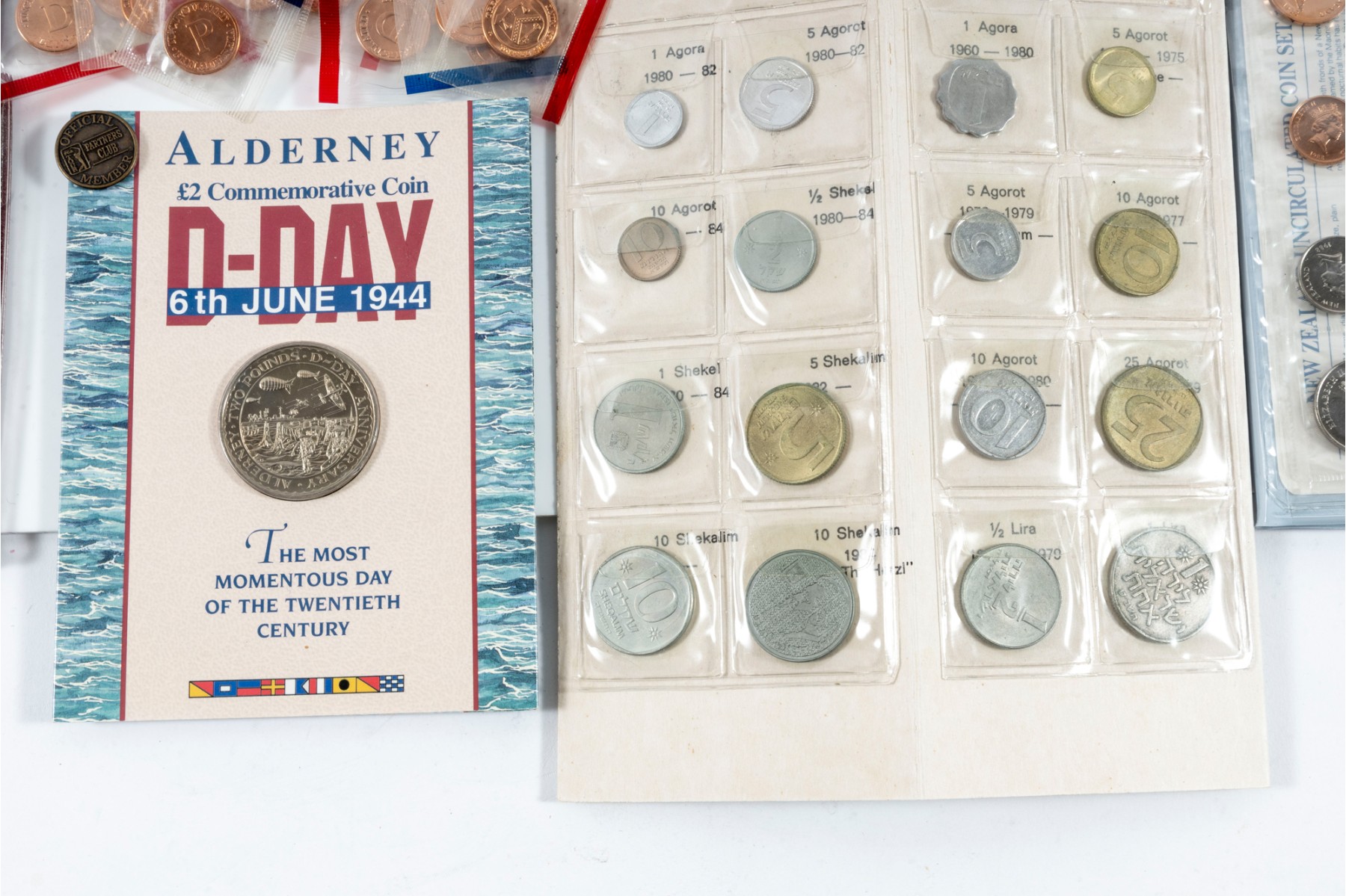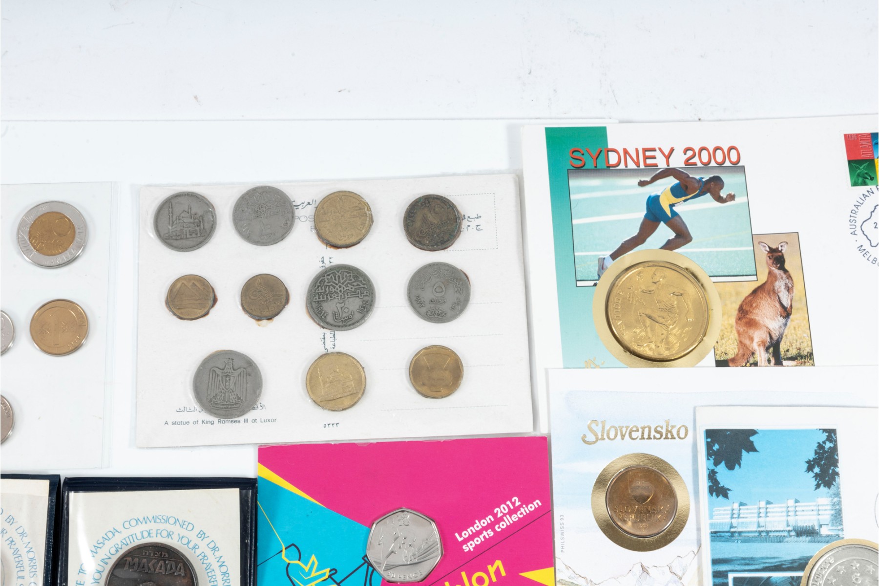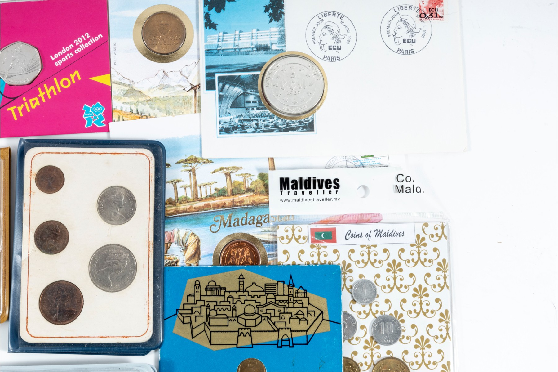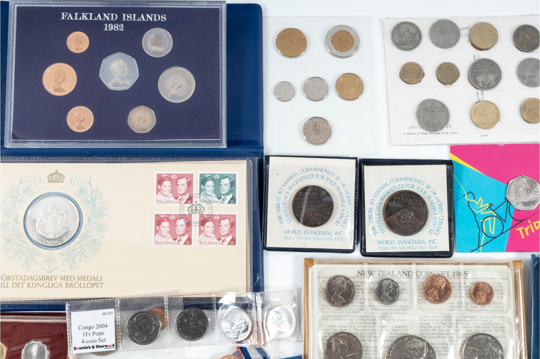 A wonderful variety of commemorative world coins, many with accompanying cards and protective holders.