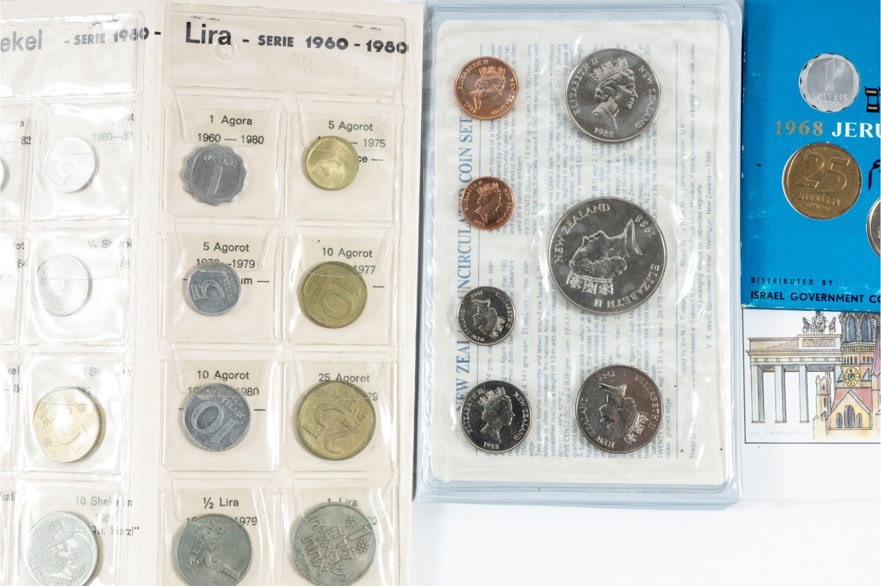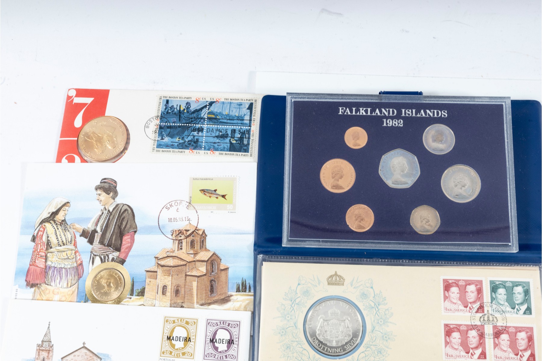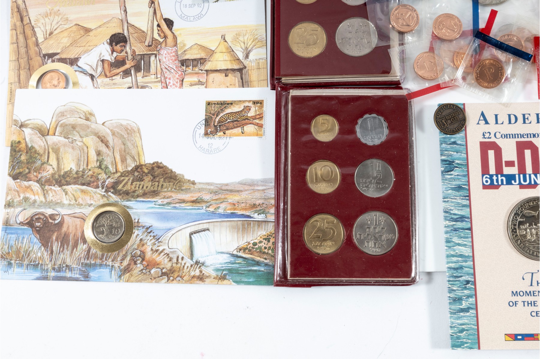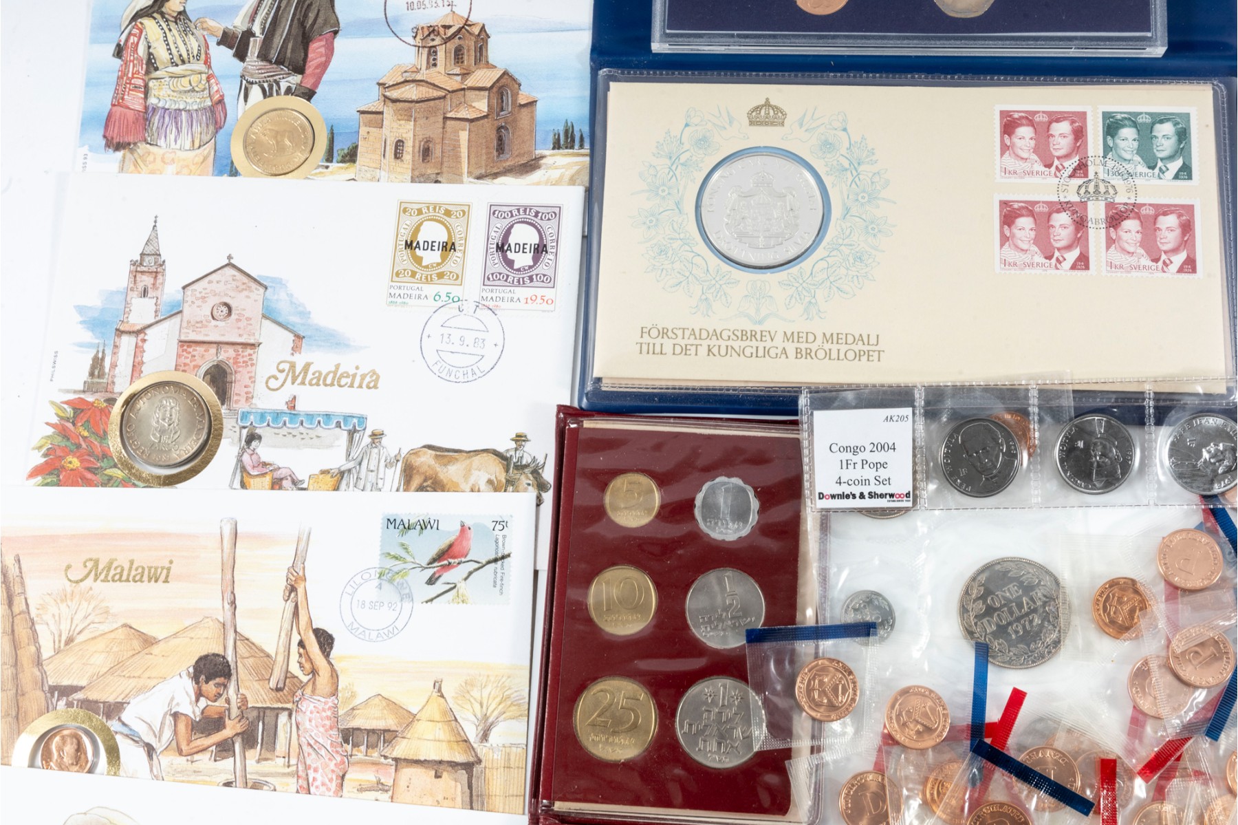 A wonderful variety of commemorative world coins, many with accompanying cards and protective holders.