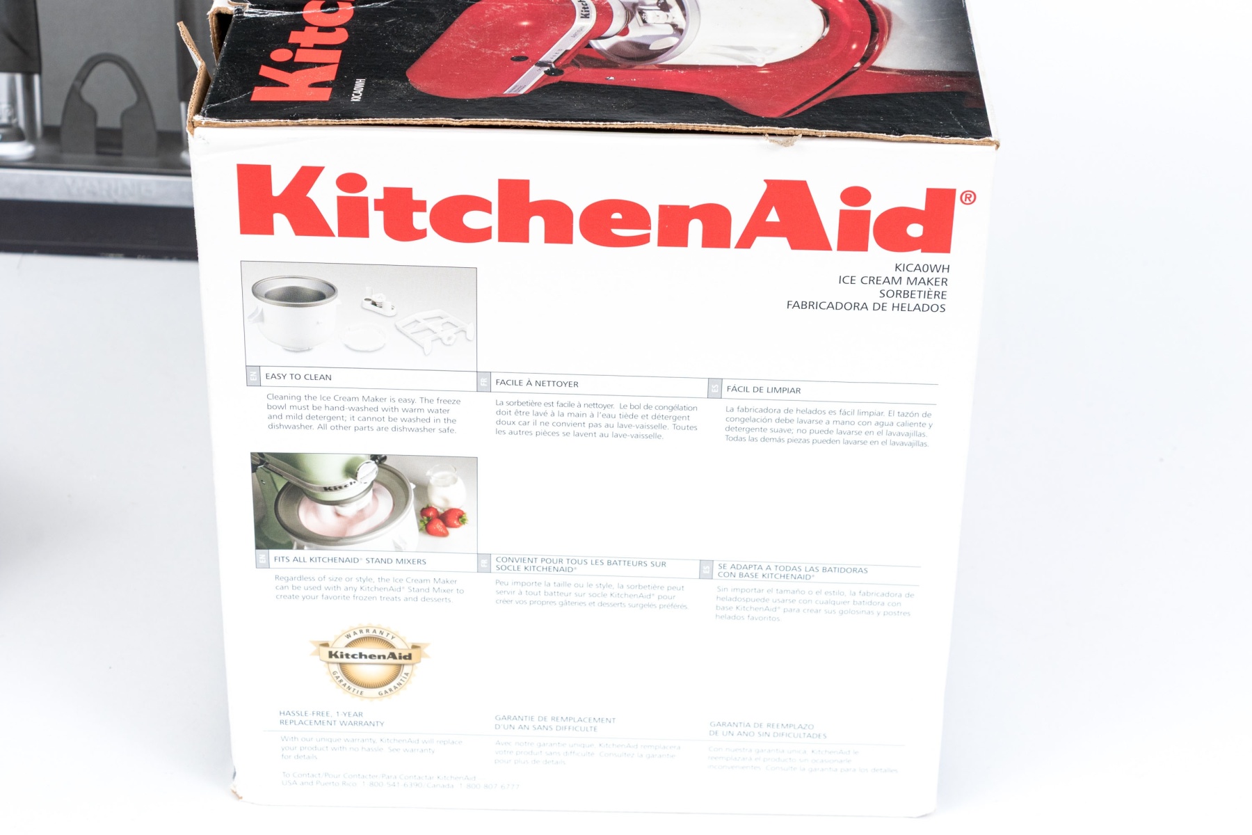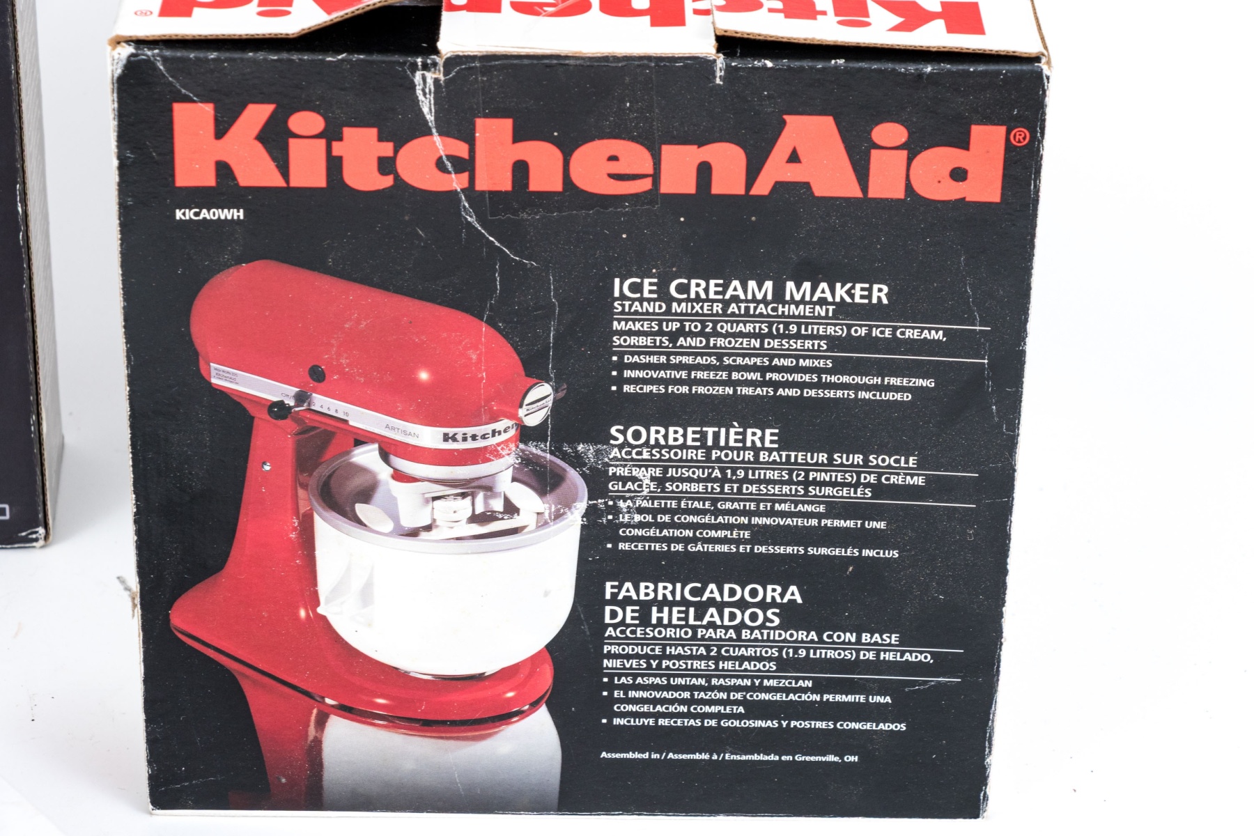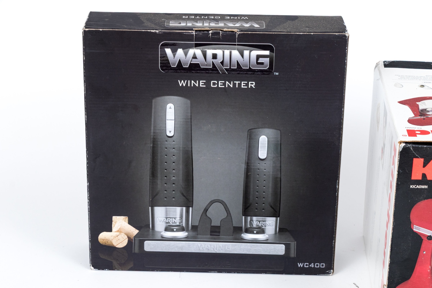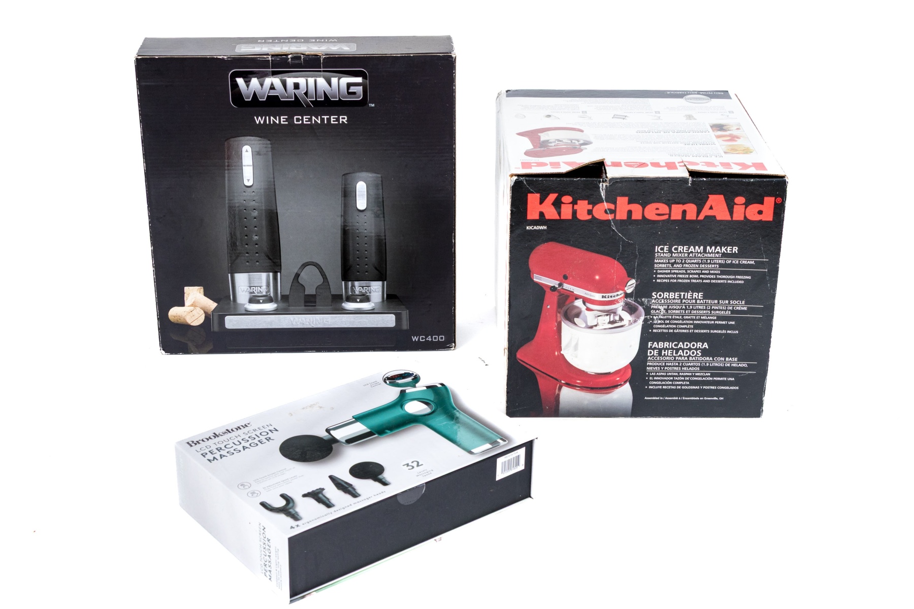 Variety of Gadgets including Waring wine center WC400, KitchenAid ice cream maker, and a Brookstone percussion massager with LCD touch screen. All in box.