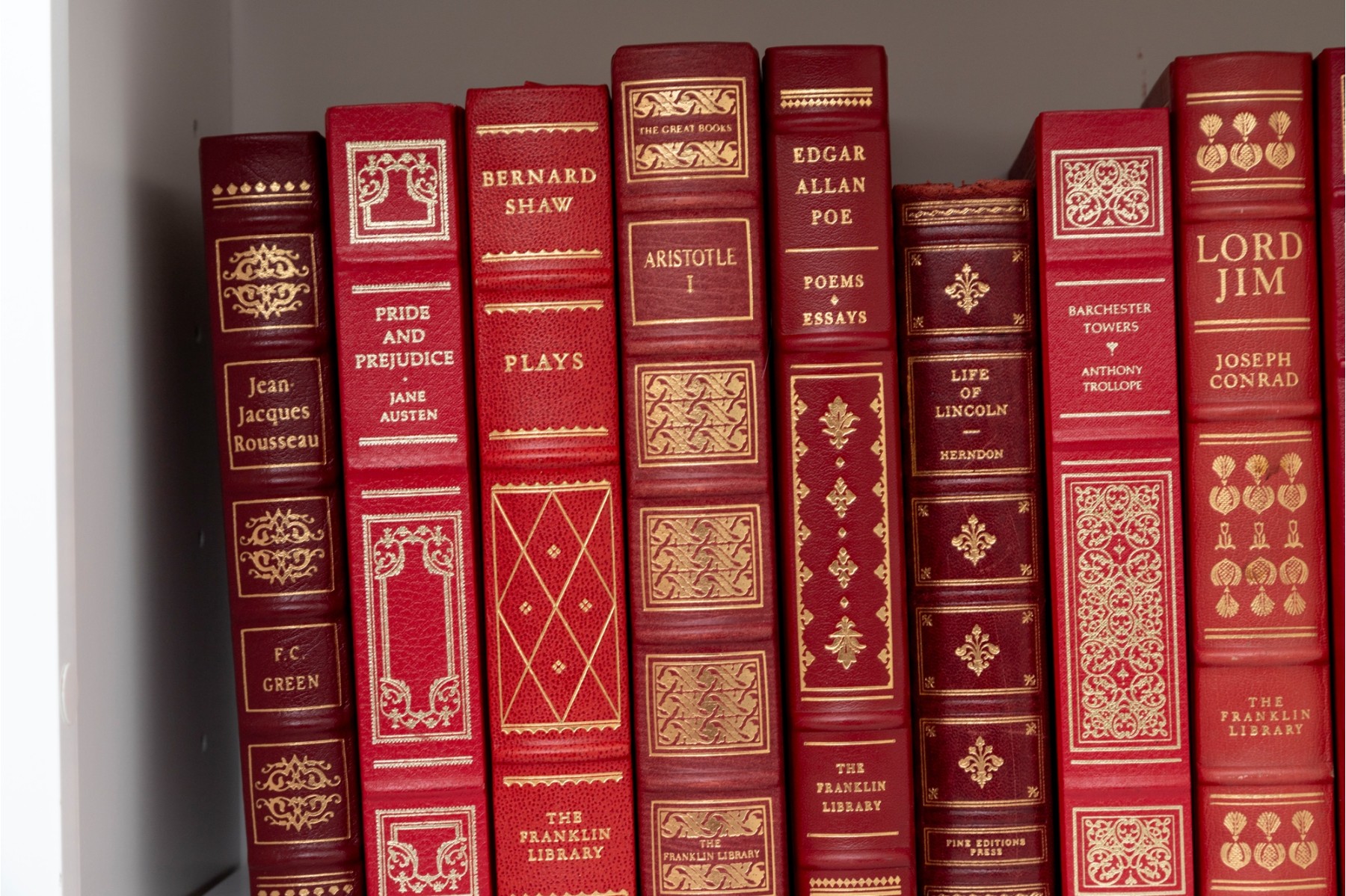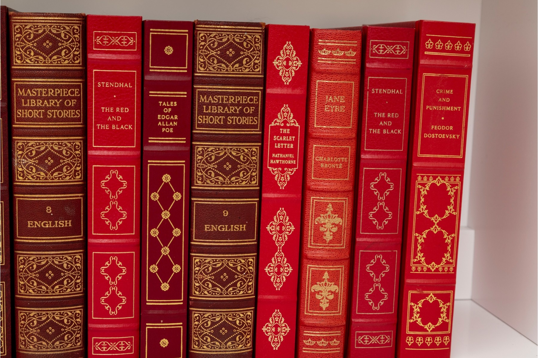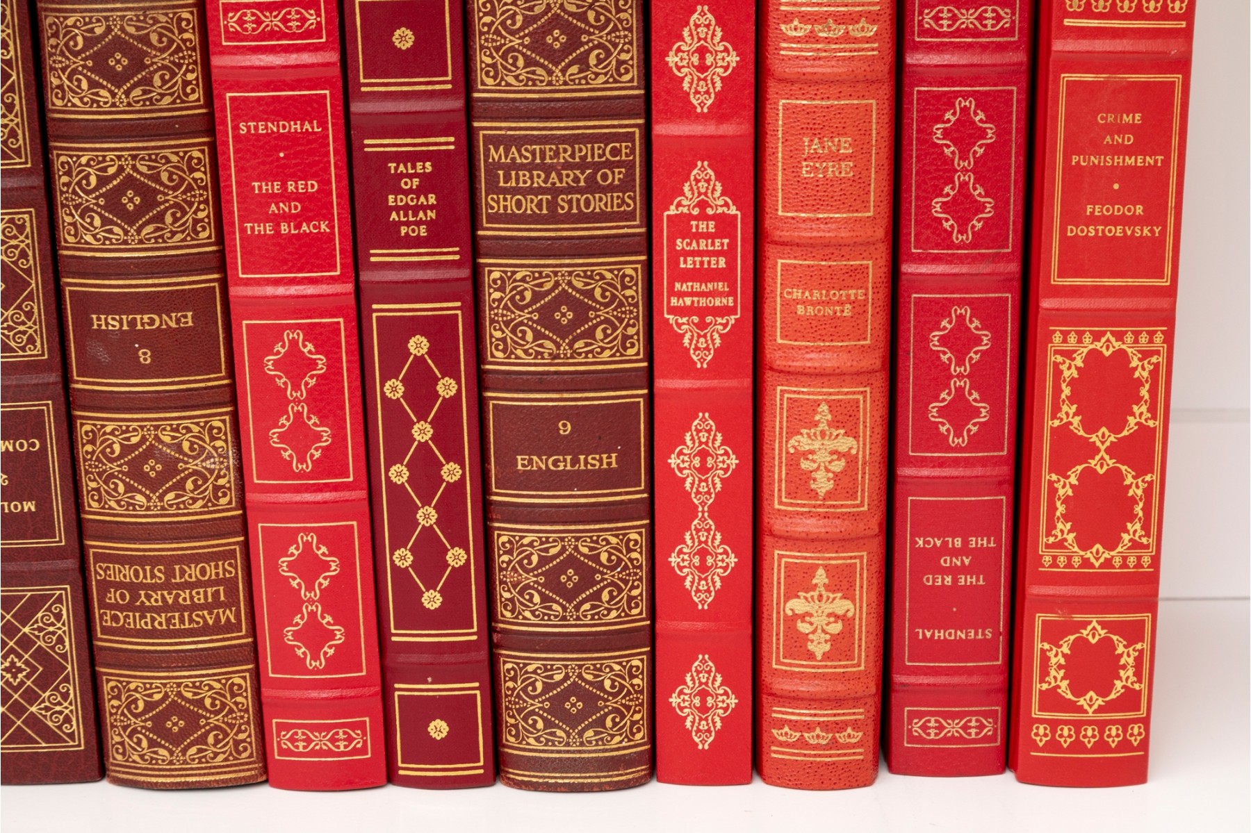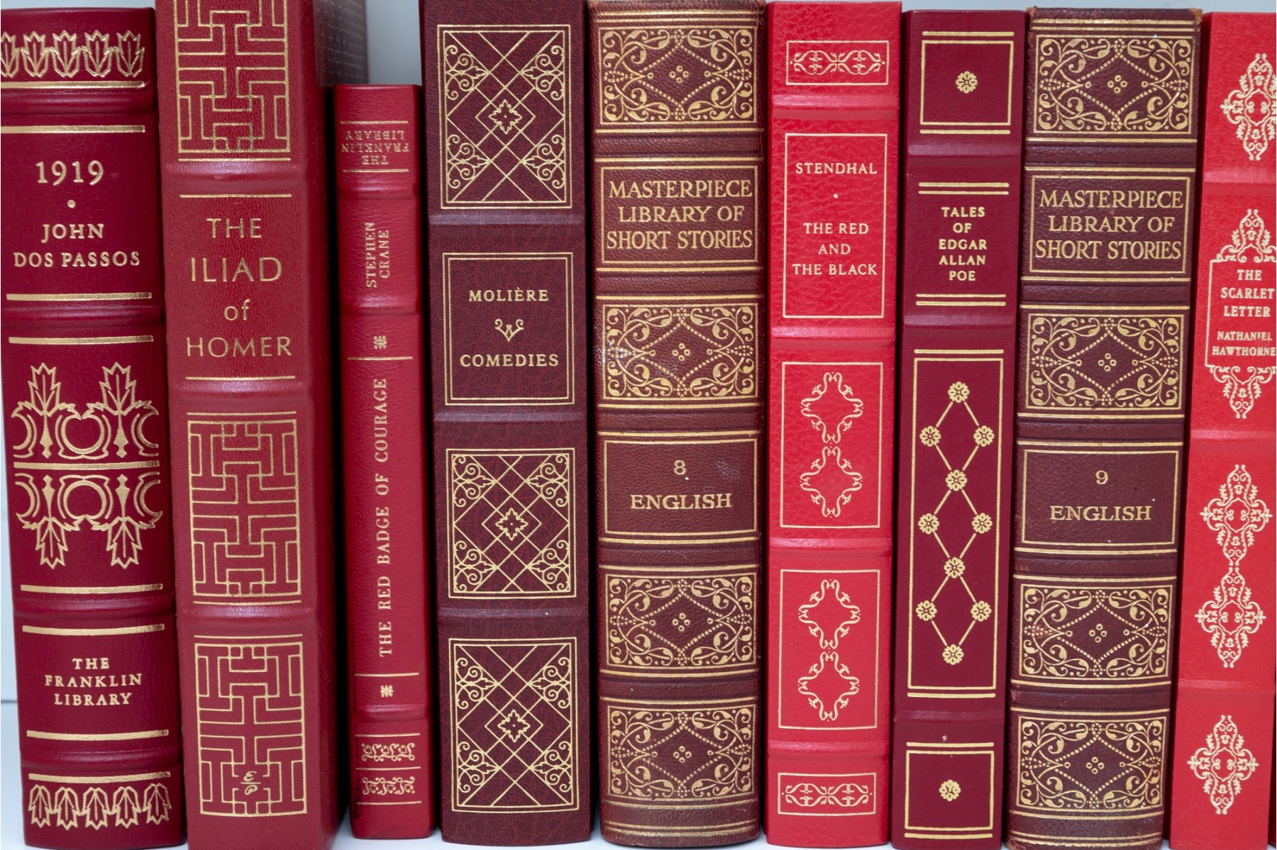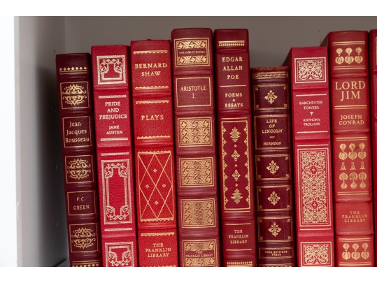 A large collection of vintage leather bound books. Varied examples, including Edgar Ellen Poe, The Iliad of Homer, William Shakespeare, etc. See photos for details.