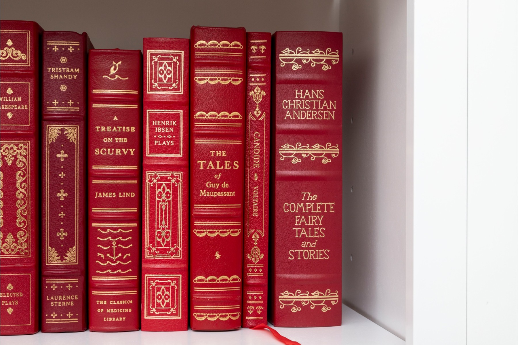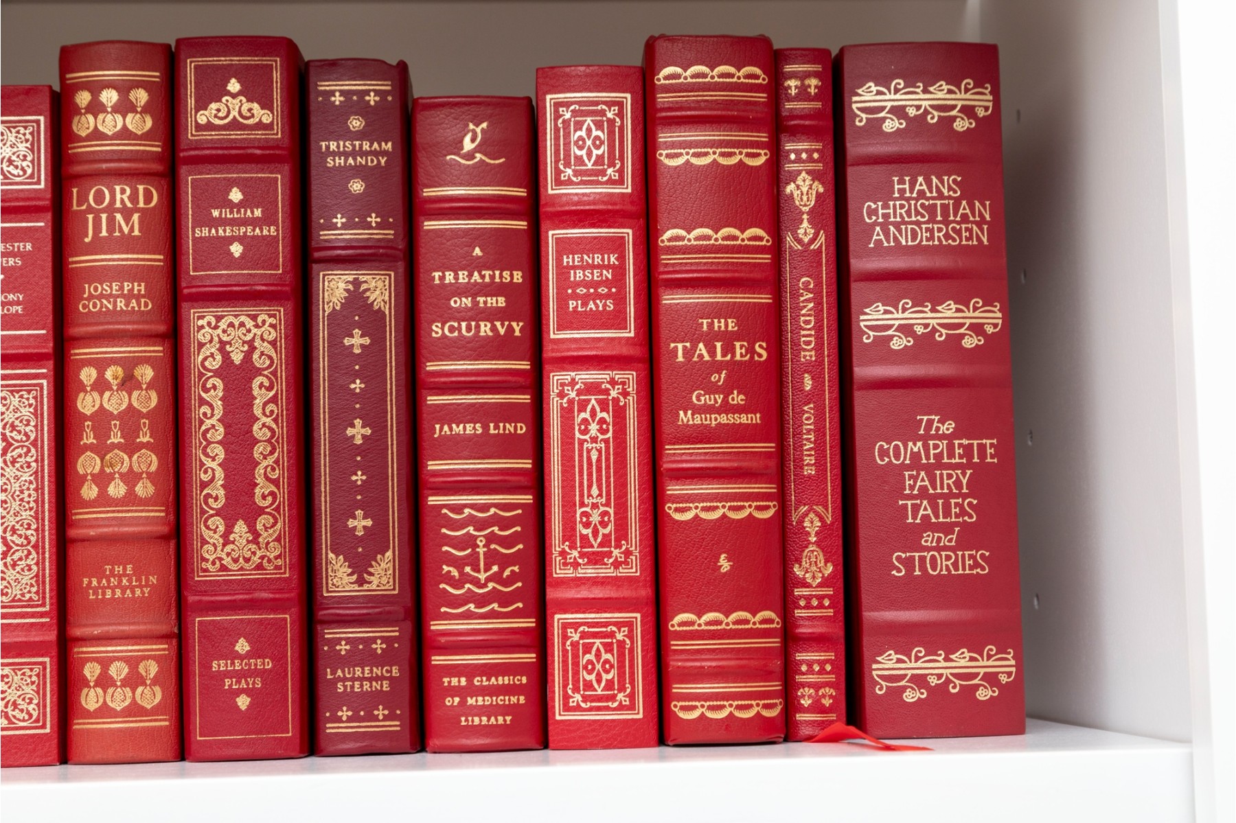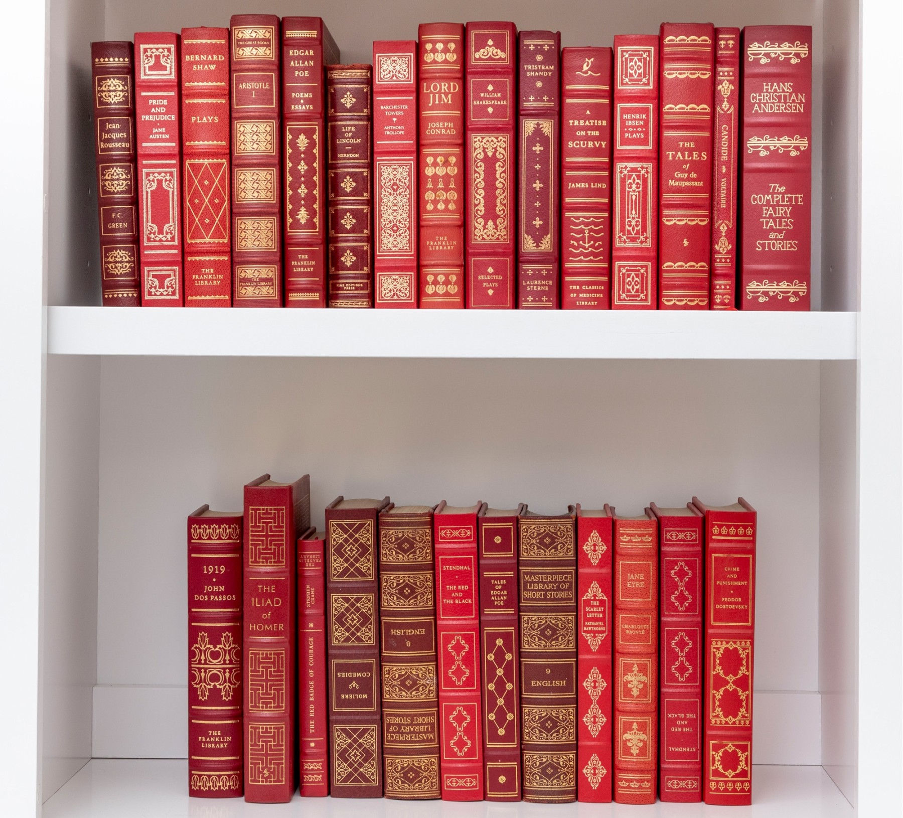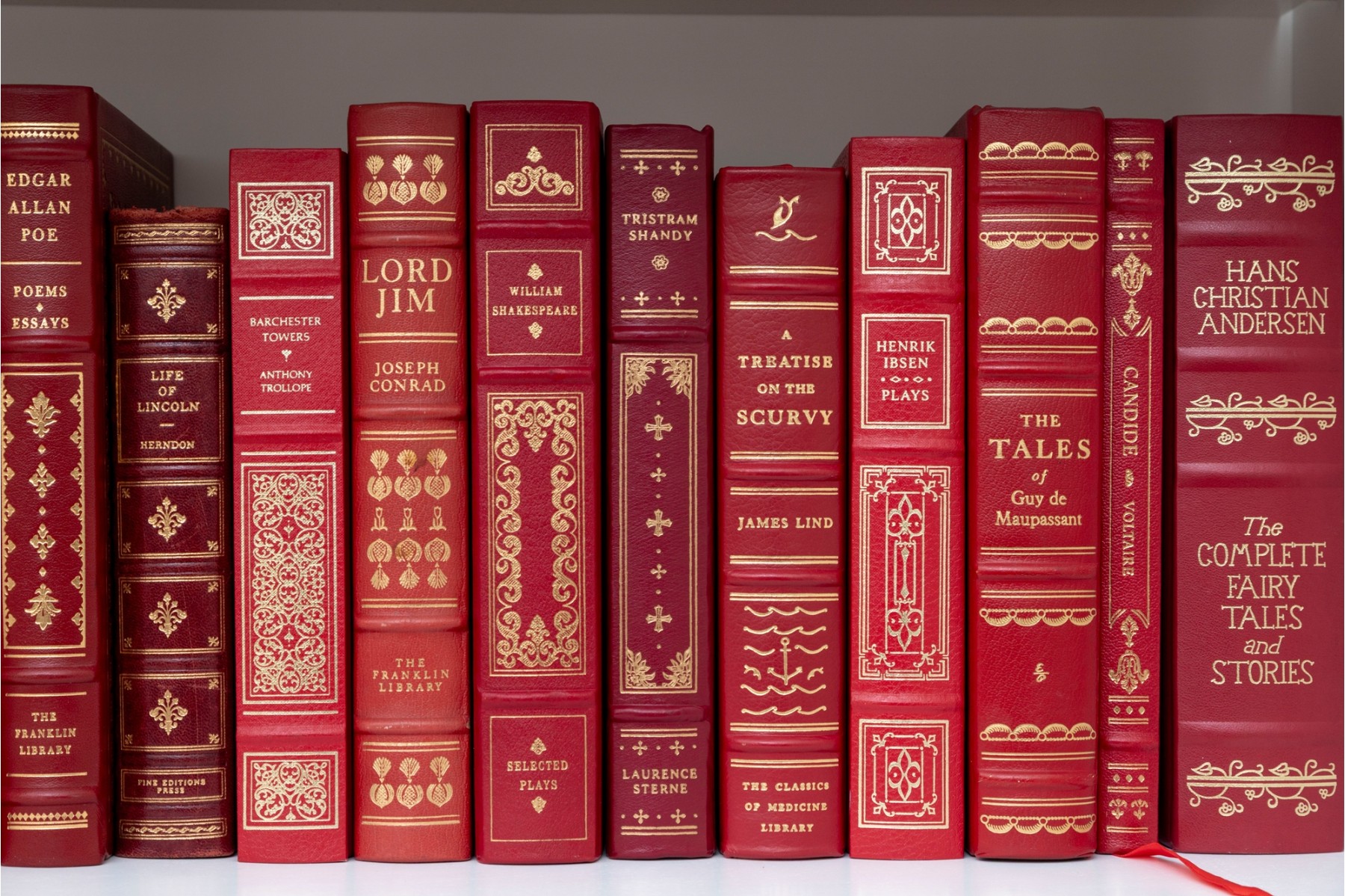 A large collection of vintage leather bound books. Varied examples, including Edgar Ellen Poe, The Iliad of Homer, William Shakespeare, etc. See photos for details.