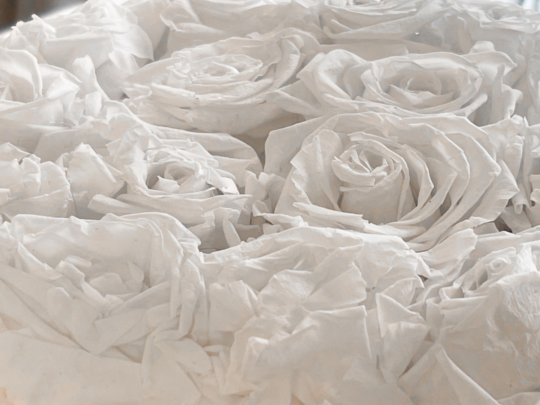 Fragrant bouquet of white “eterity” roses in hatbox style box.