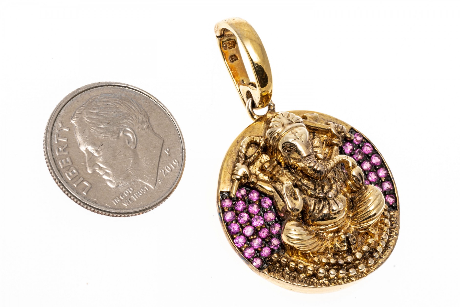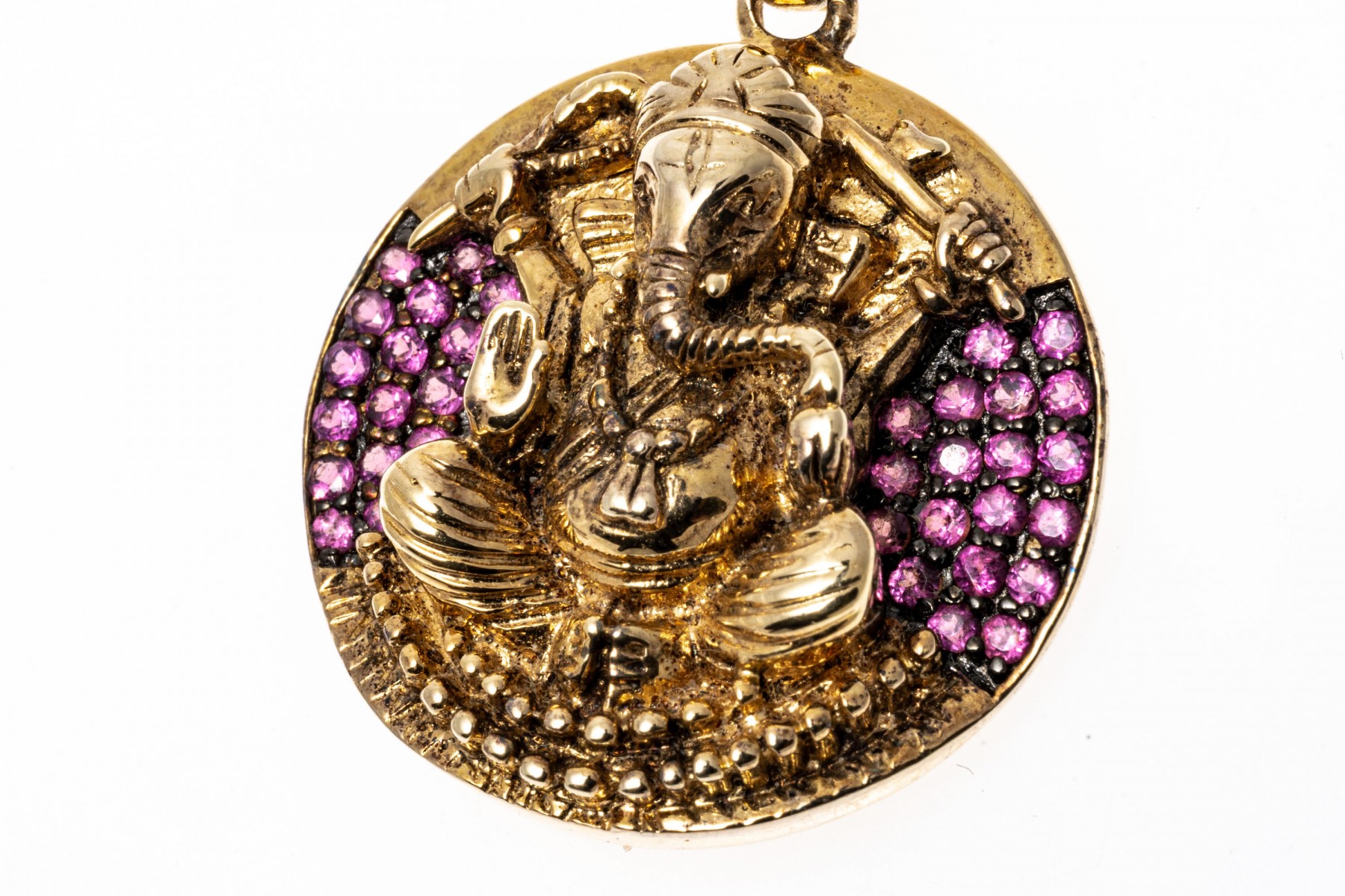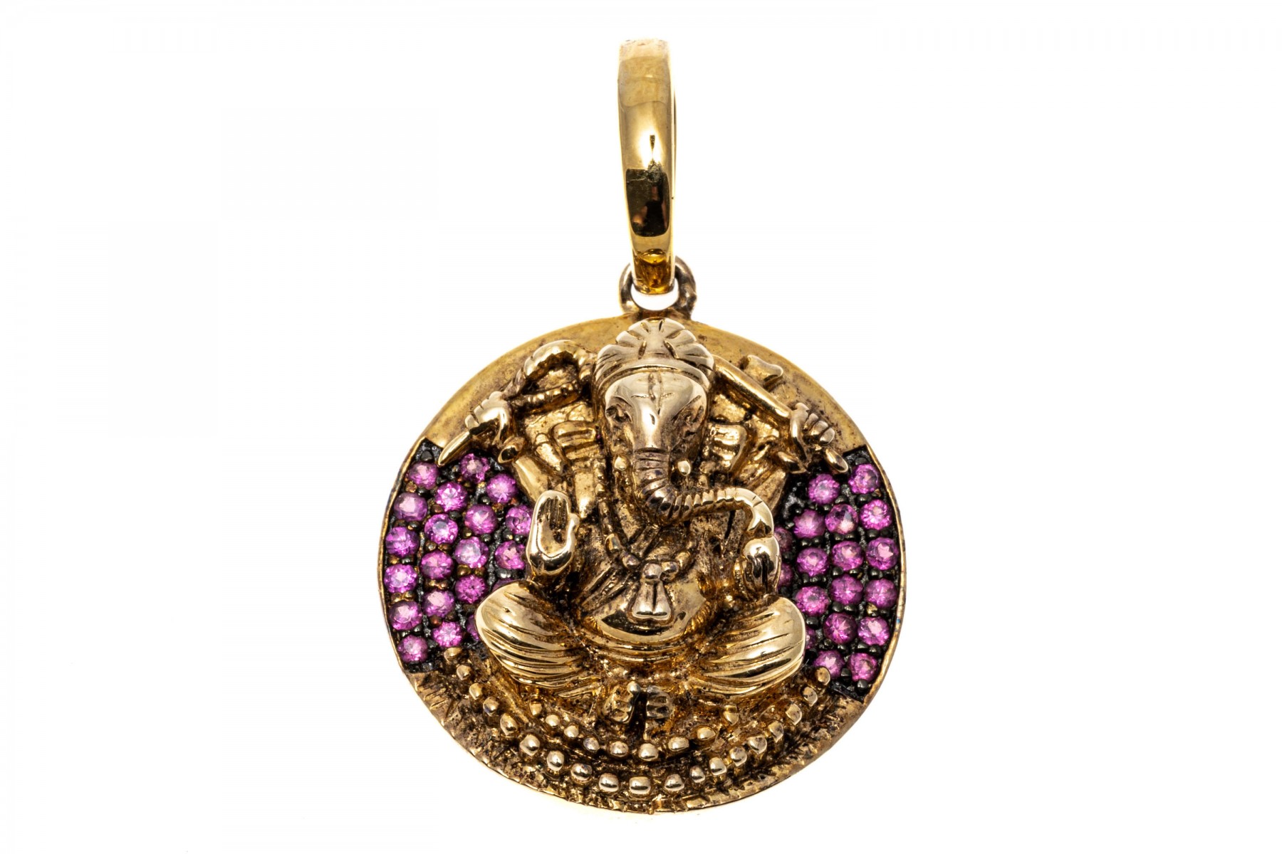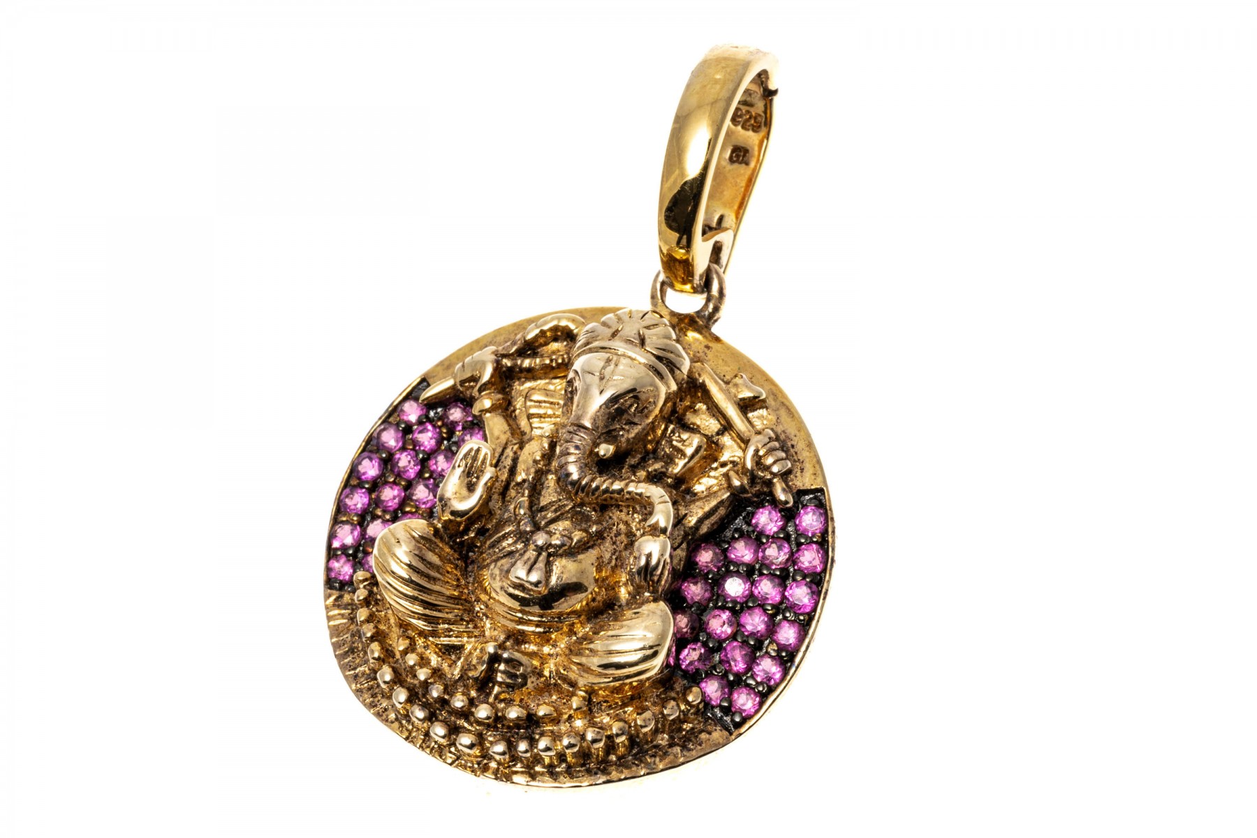 This sterling silver disk pendant. This vermeil pendant depicts a deity flanked by round faceted pink tourmalines. The bale of the pendant is hinged.
