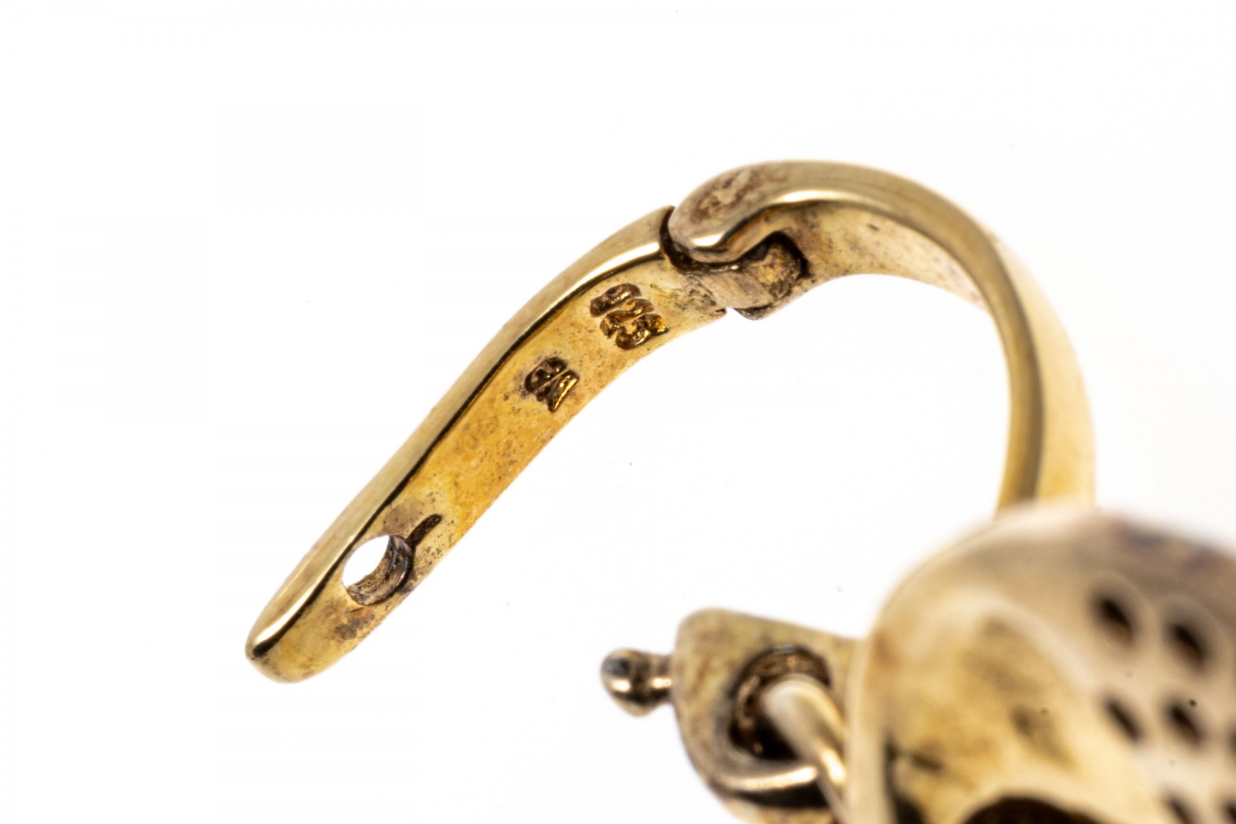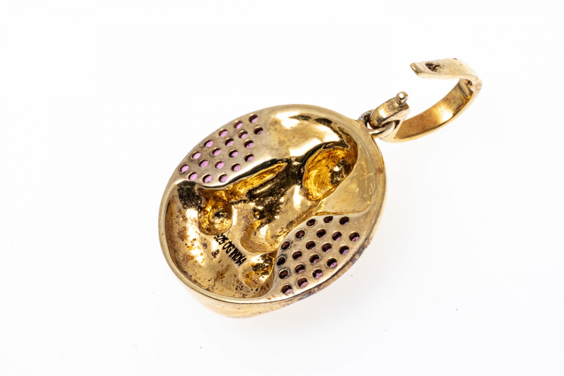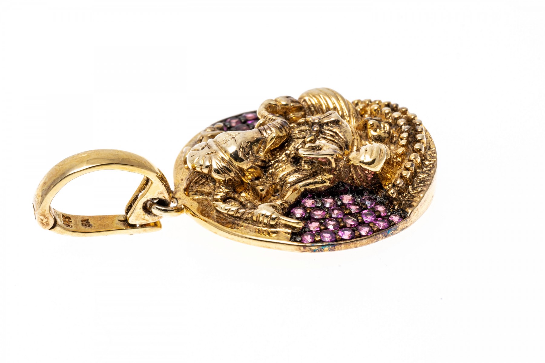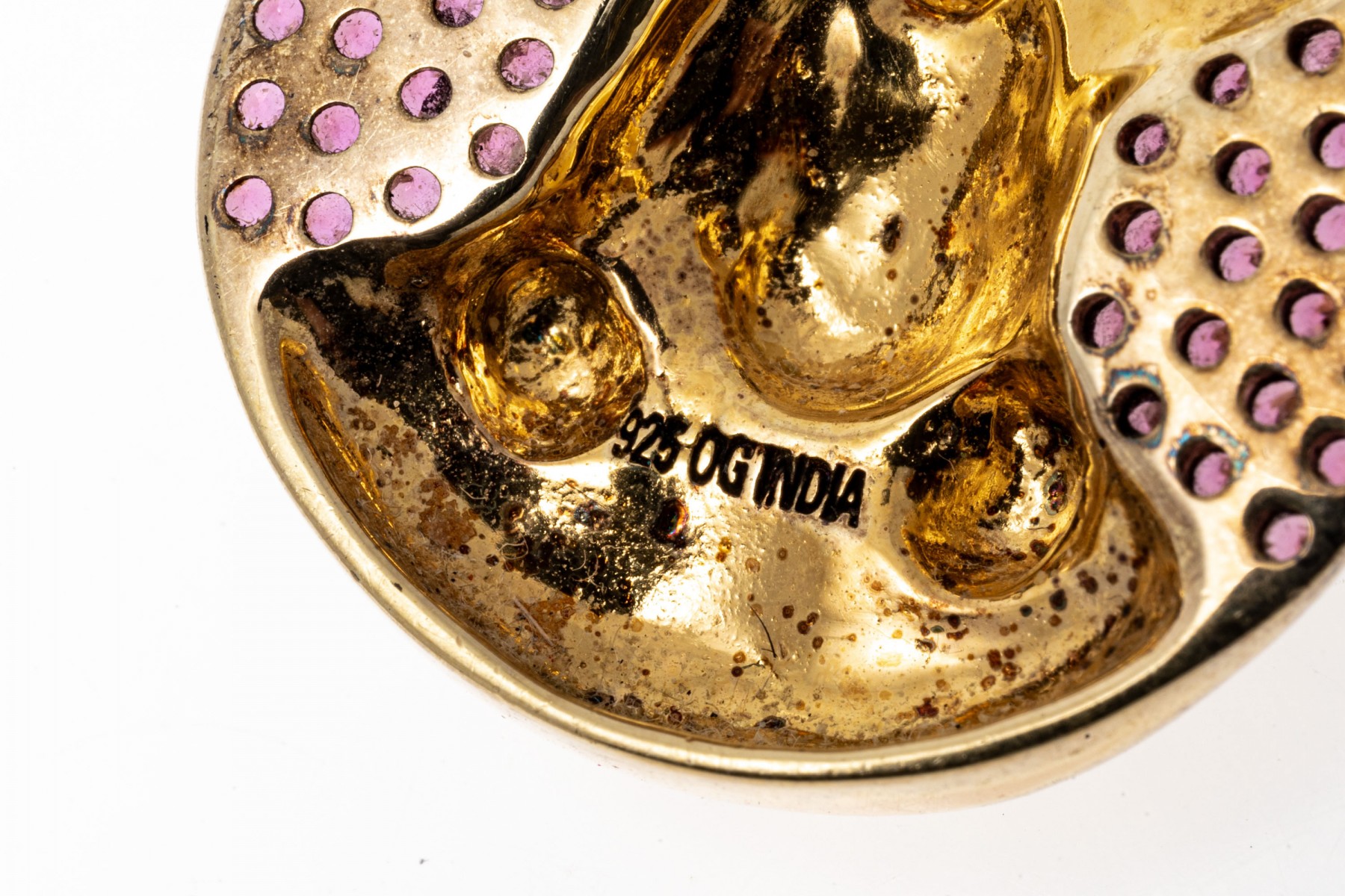 This sterling silver disk pendant. This vermeil pendant depicts a deity flanked by round faceted pink tourmalines. The bale of the pendant is hinged.
