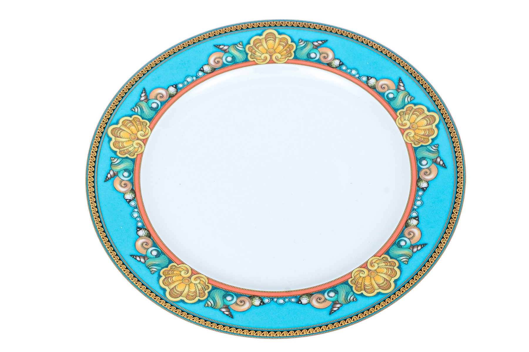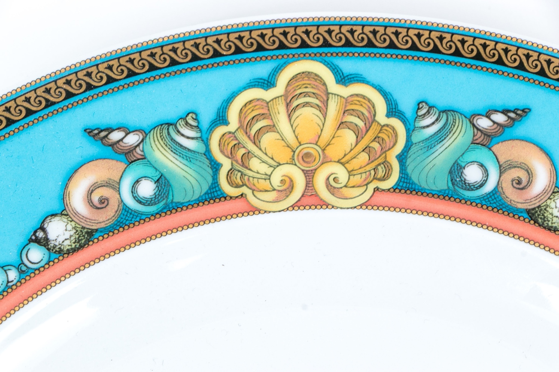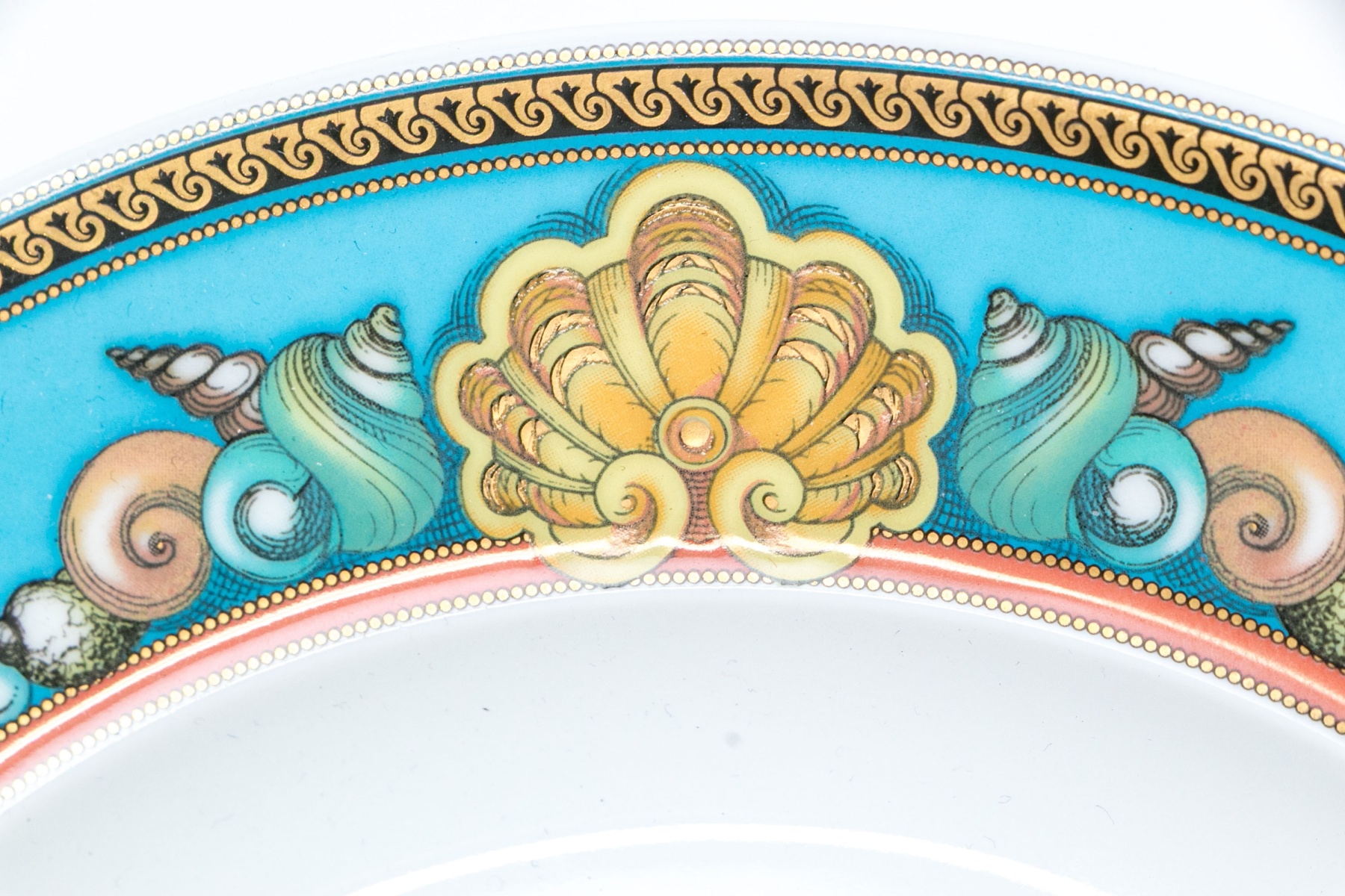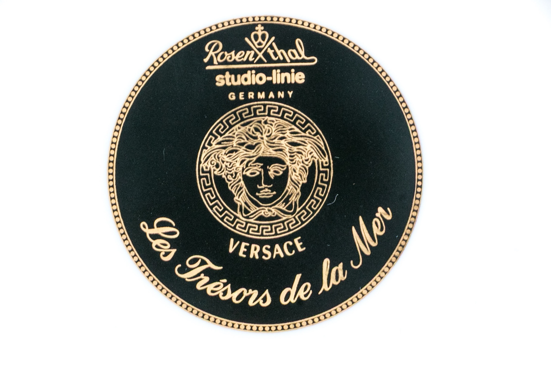 A striking Versace for Rosenthal “Les Trésors de la Mer” salad plate, lavishly decorated with the collection’s signature seashells, coral motifs, and marine-inspired ornamentation. Rendered in vibrant turquoise, gold, and pastel tones, this iconic design exemplifies the opulent aesthetic of Versace’s collaboration with Rosenthal. A standout piece for collectors and luxury tableware enthusiasts.
