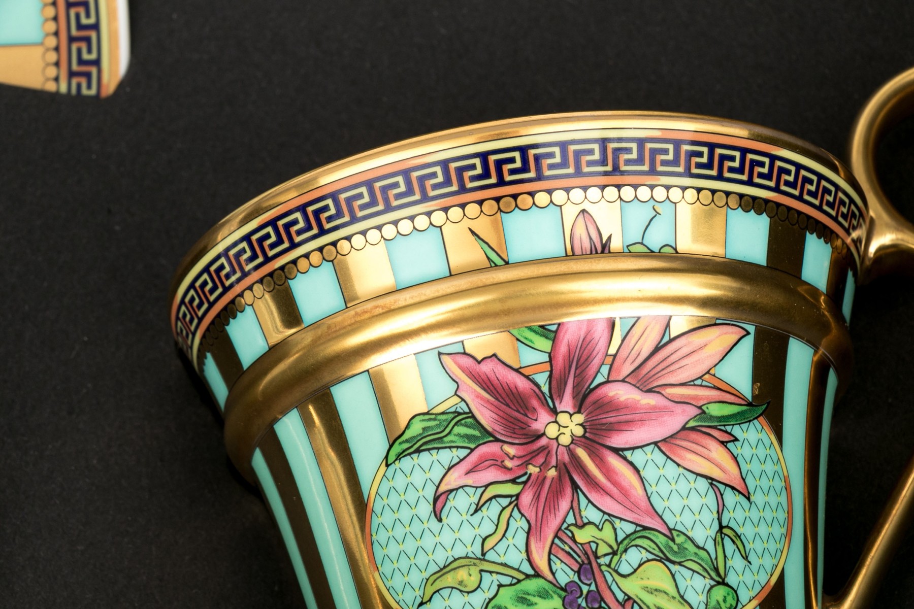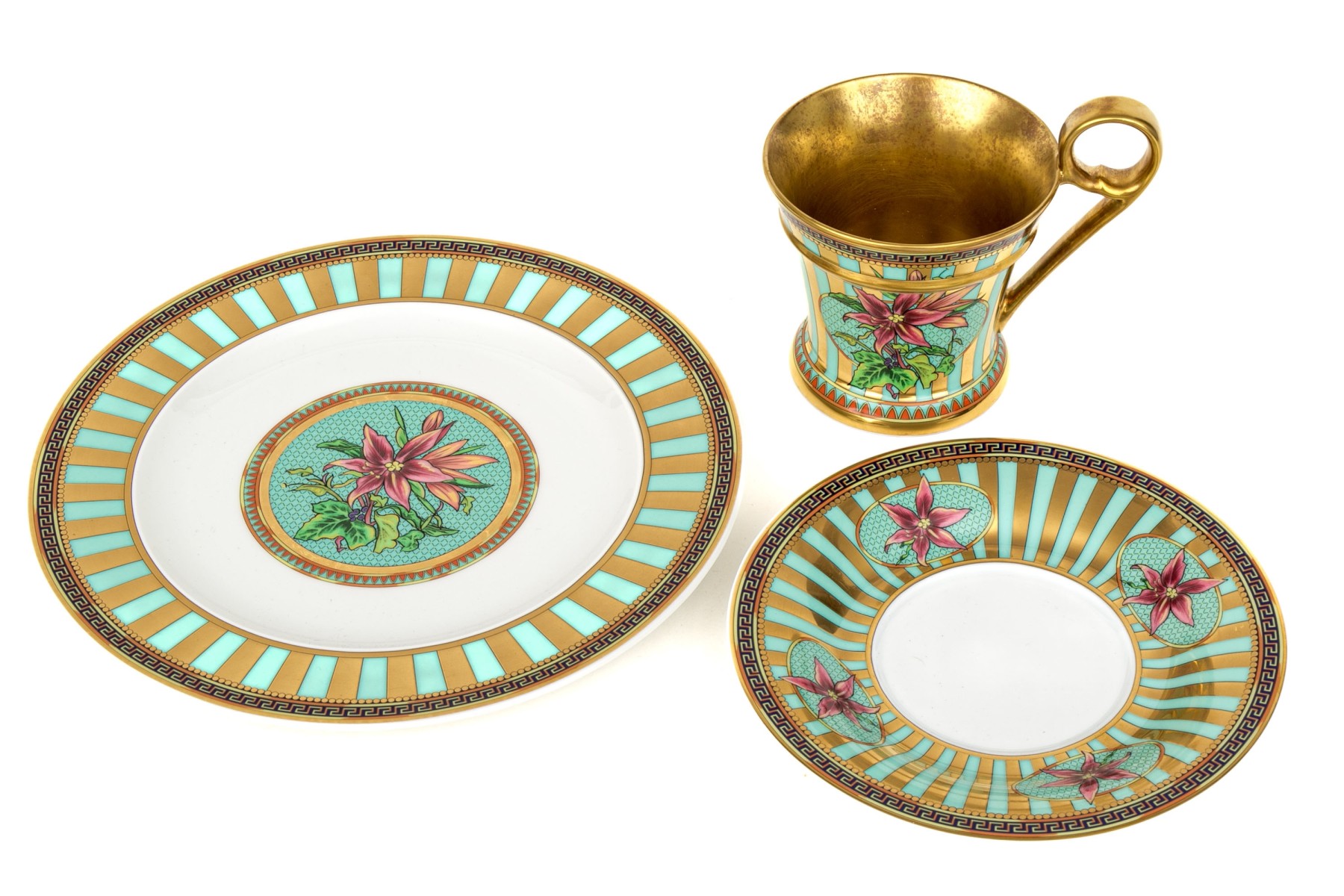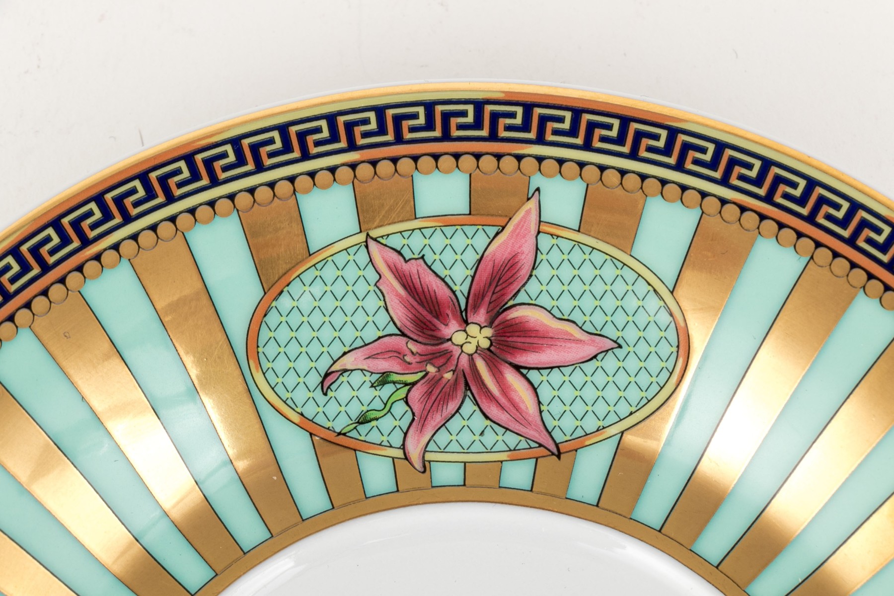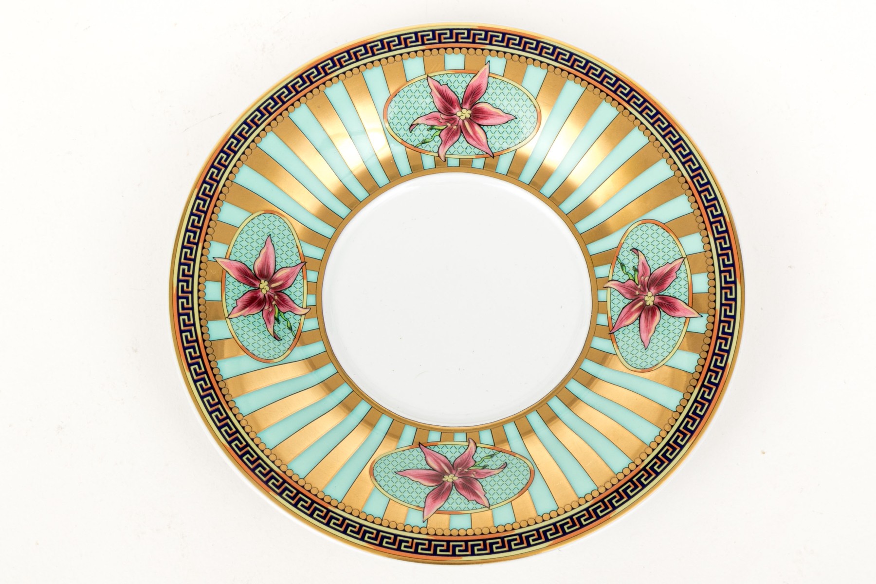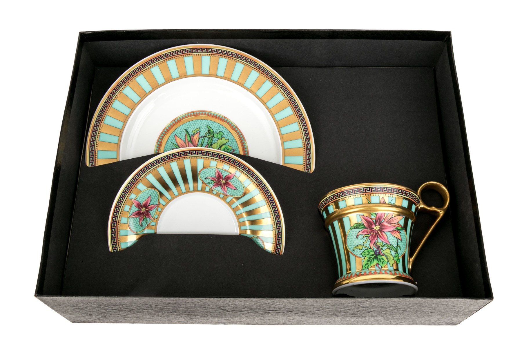 Versace, Rosenthal fabulous "Floral Elegy" three piece dessert set, boxed. This beautiful set features an oversized tea cup, saucer and 8 7/8" diameter dessert/luncheon plate, decorated with green and gold striping and pink Lily motifs