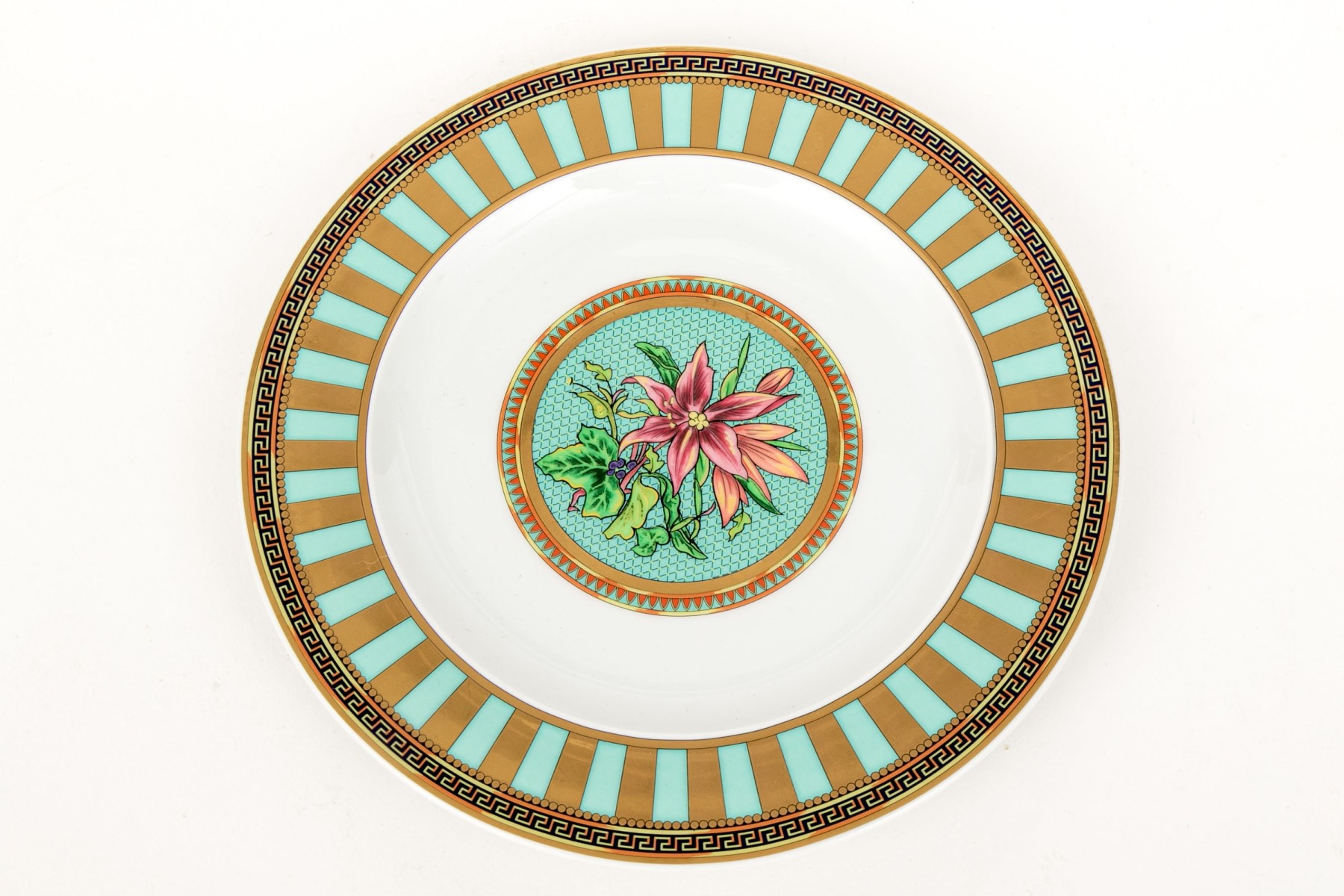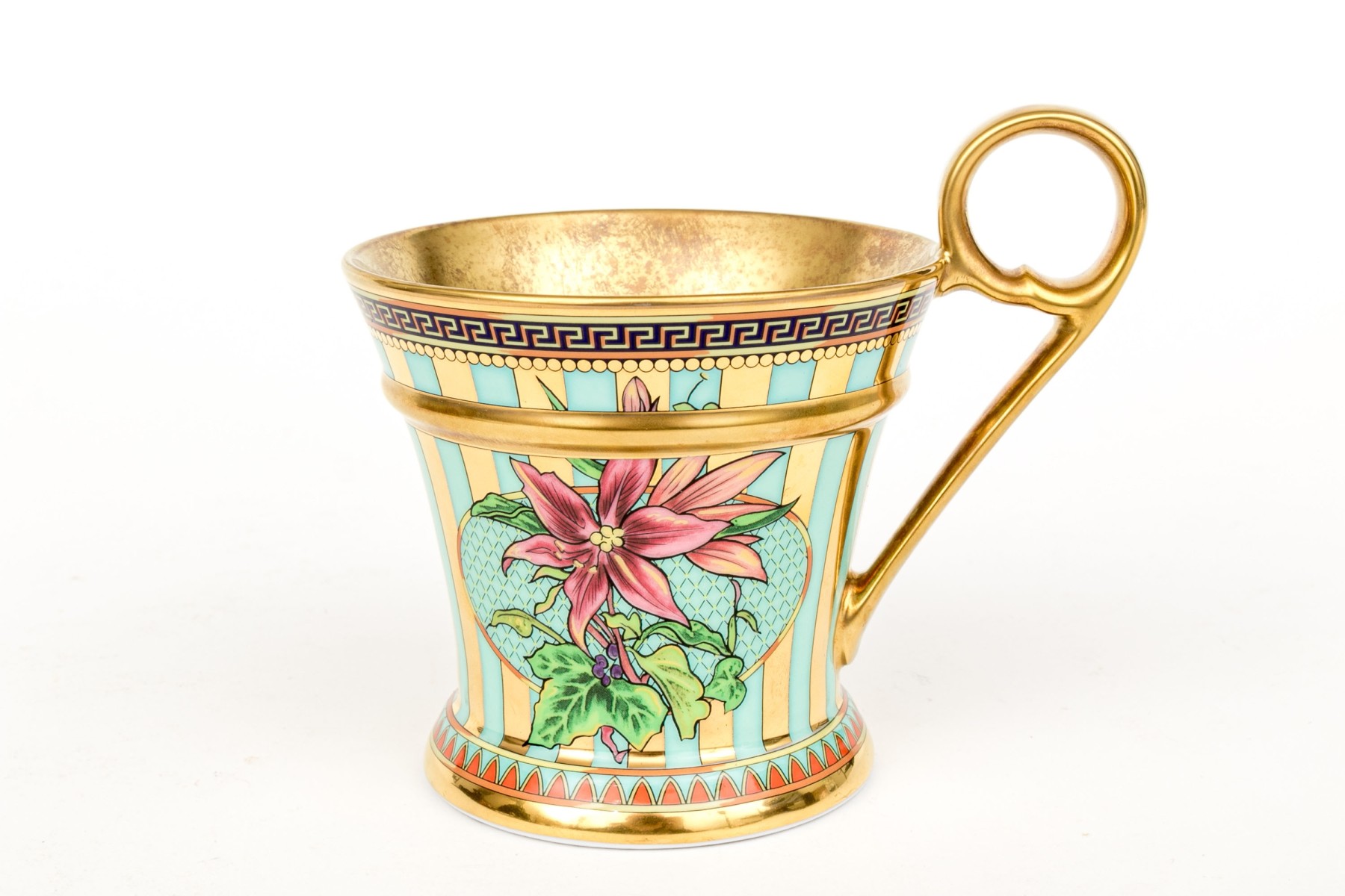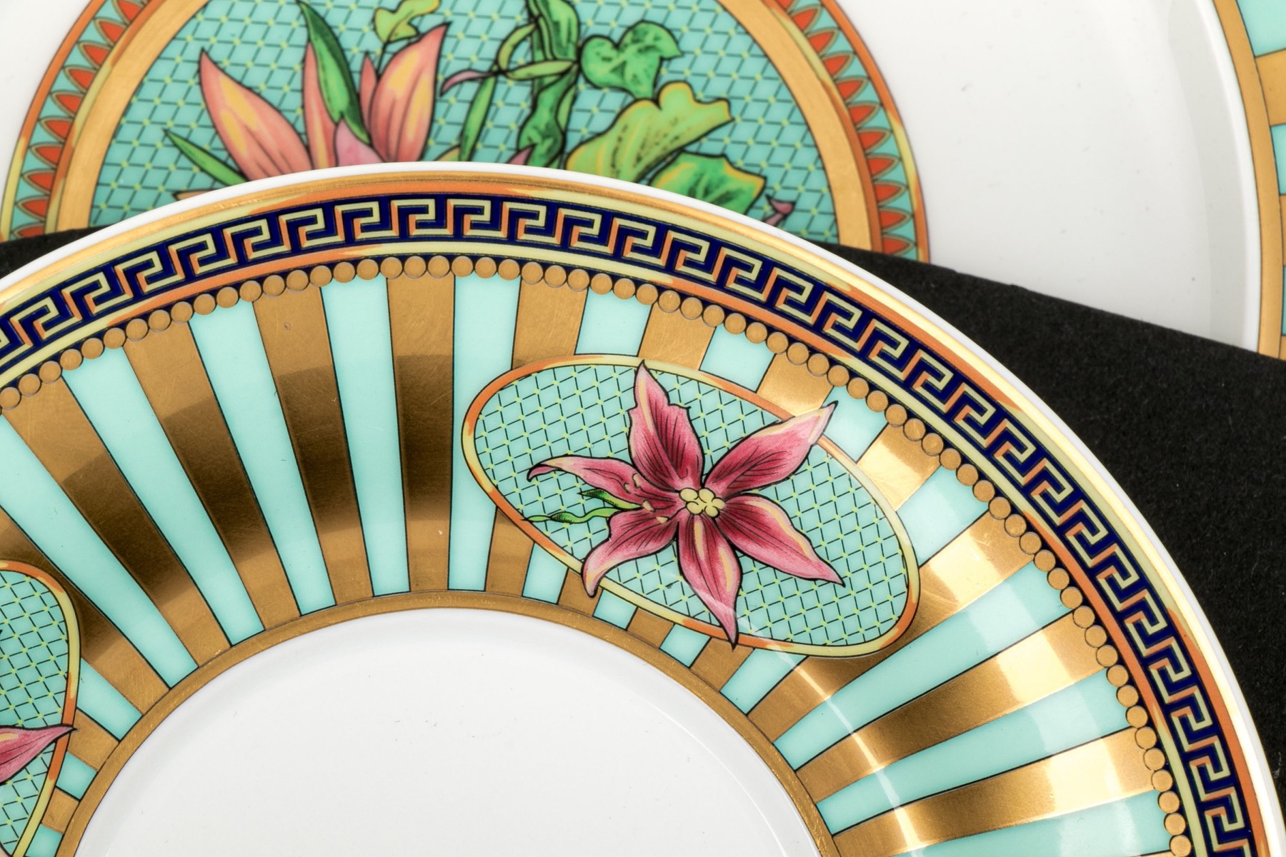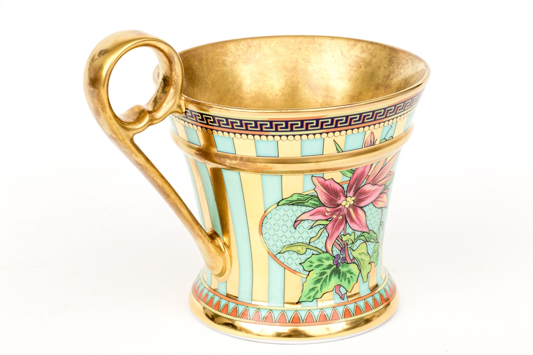 Versace, Rosenthal fabulous "Floral Elegy" three piece dessert set, boxed. This beautiful set features an oversized tea cup, saucer and 8 7/8" diameter dessert/luncheon plate, decorated with green and gold striping and pink Lily motifs