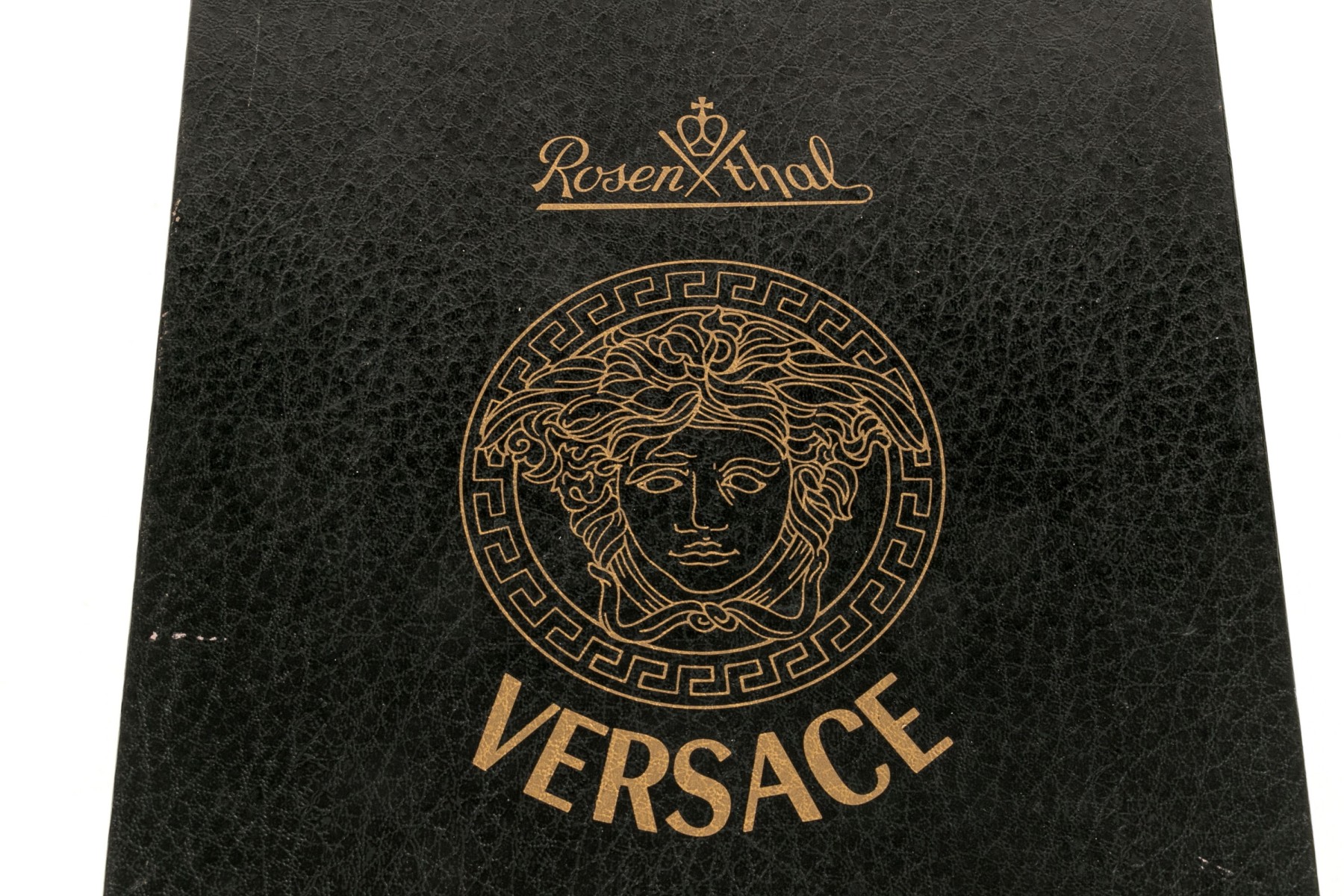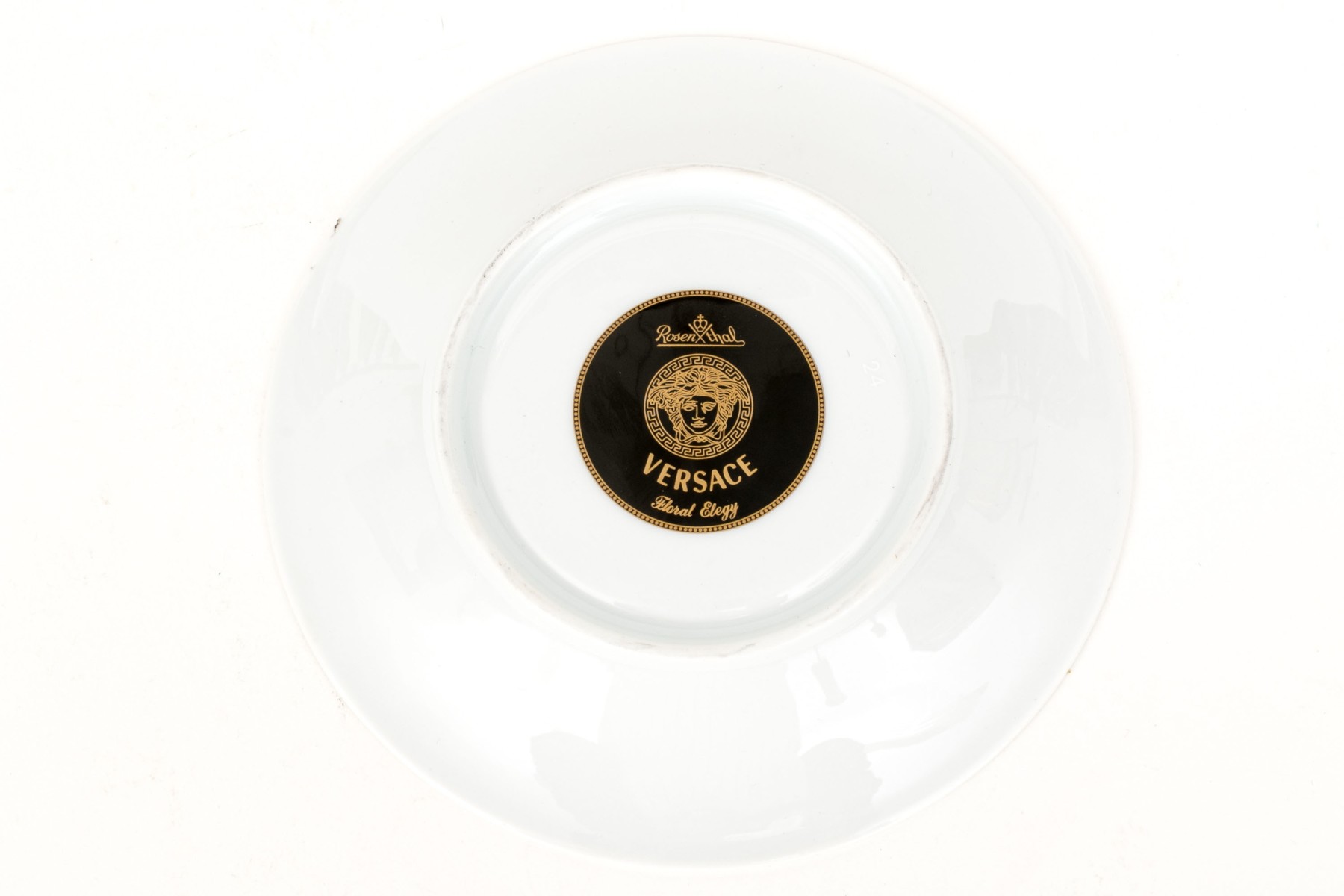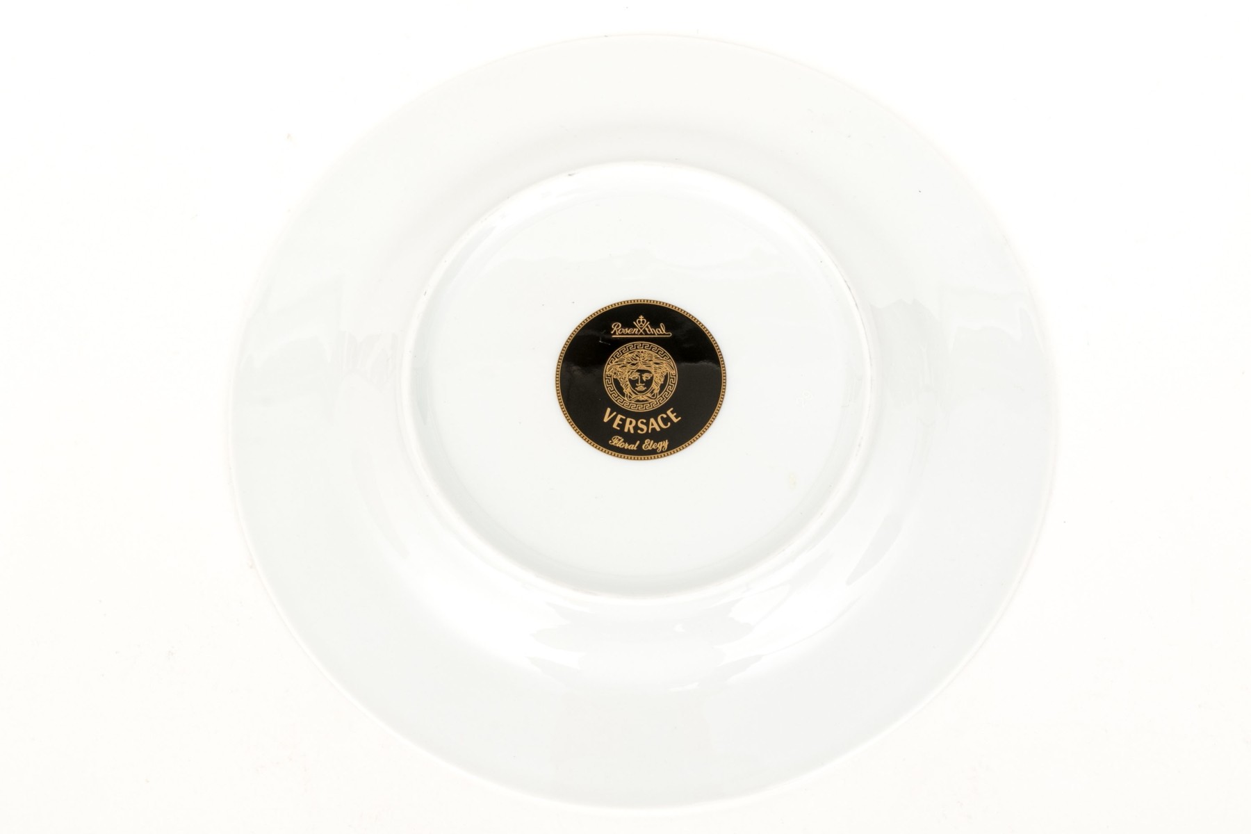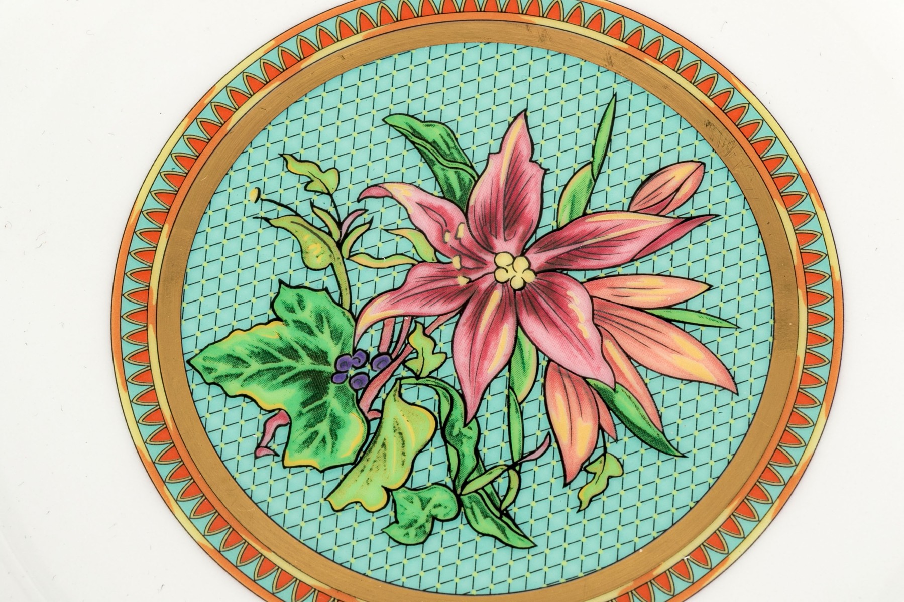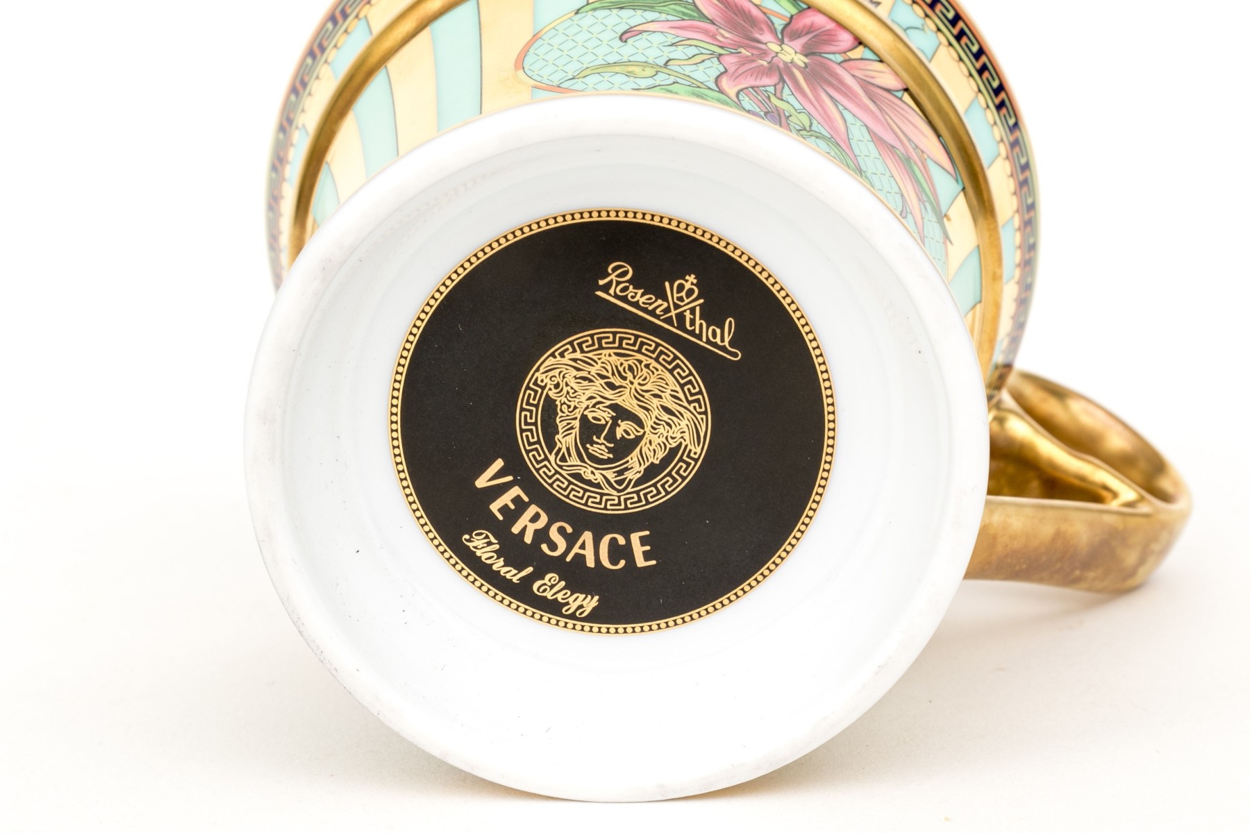 Versace, Rosenthal fabulous "Floral Elegy" three piece dessert set, boxed. This beautiful set features an oversized tea cup, saucer and 8 7/8" diameter dessert/luncheon plate, decorated with green and gold striping and pink Lily motifs