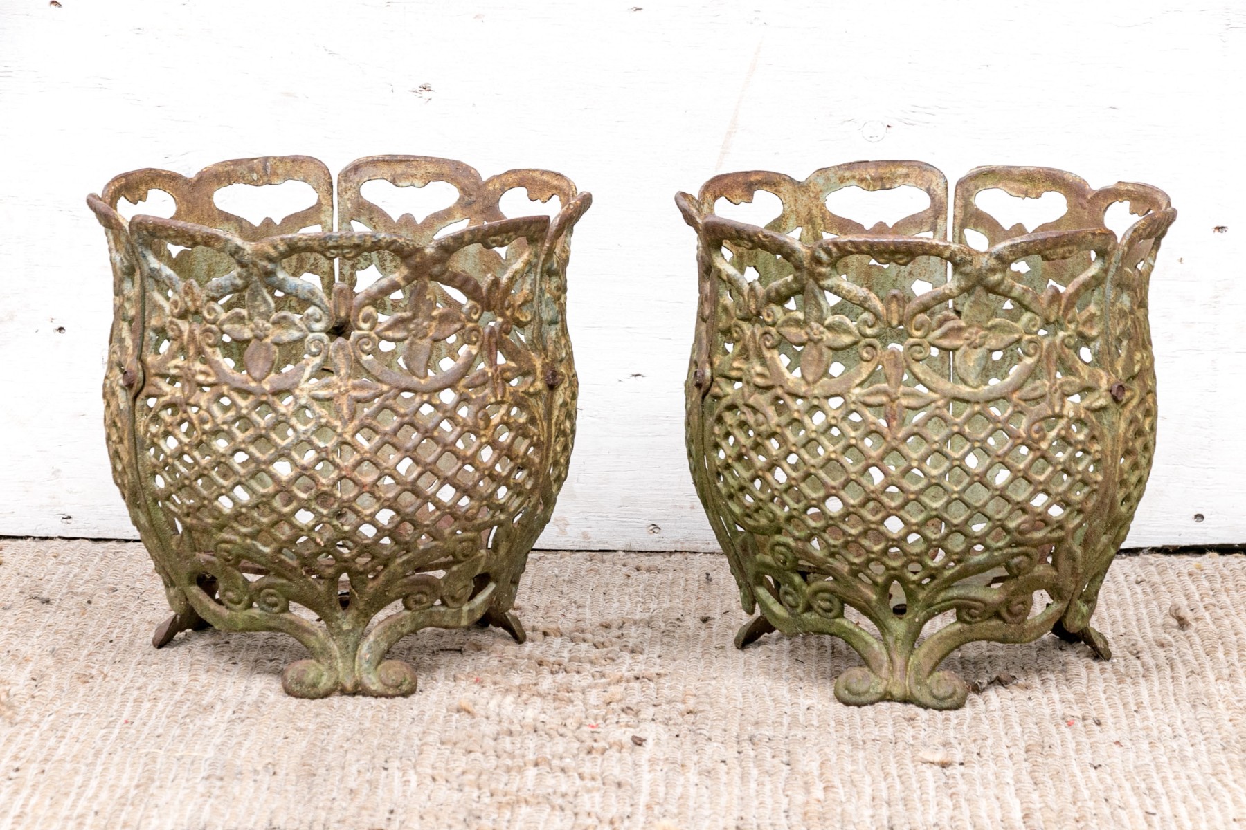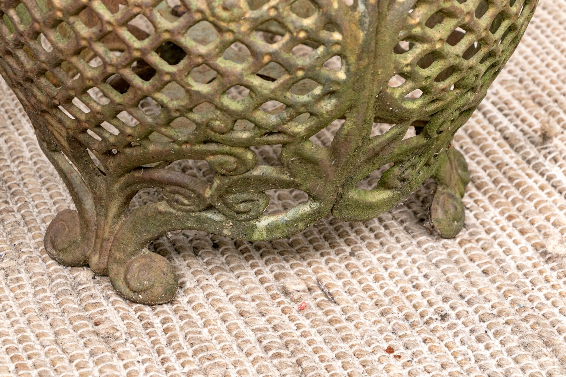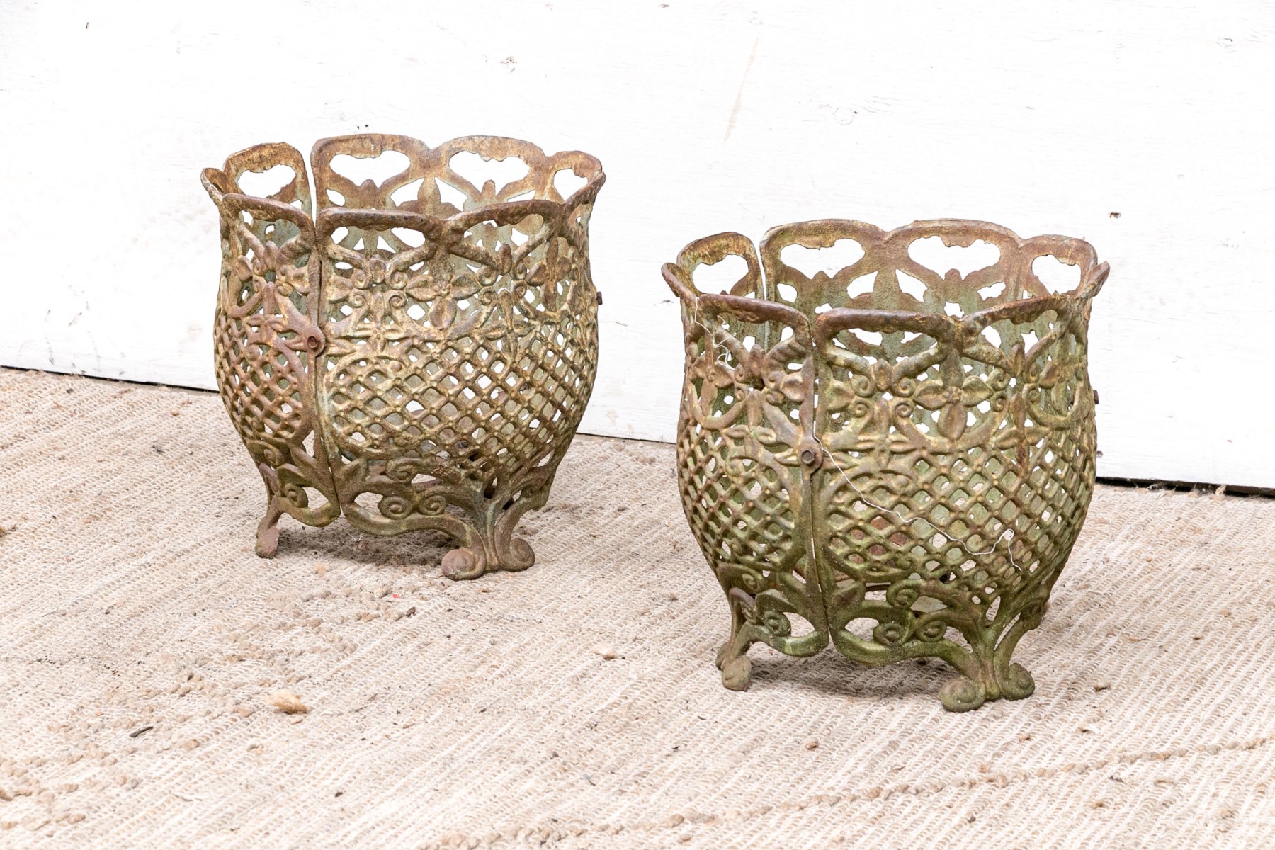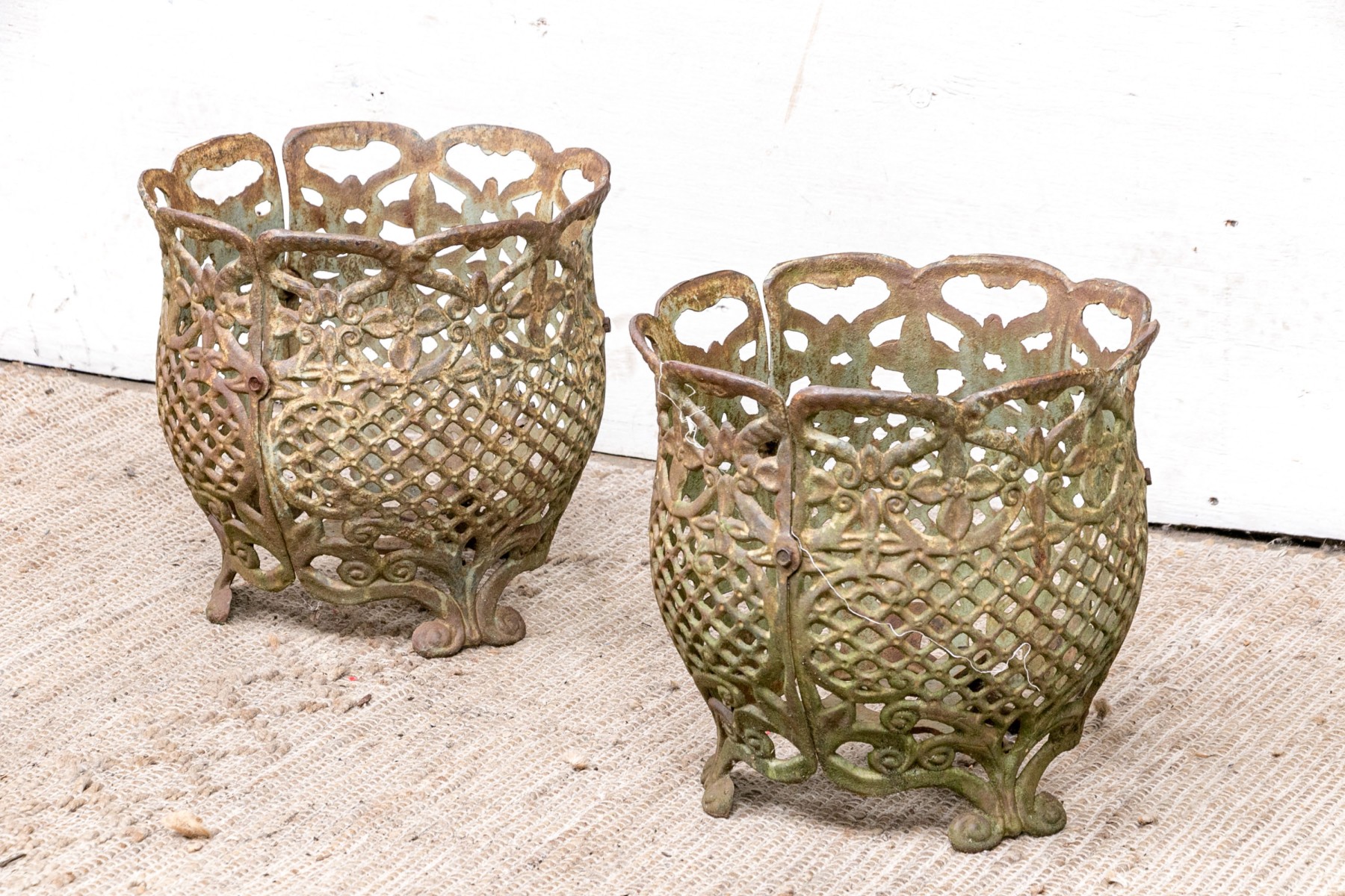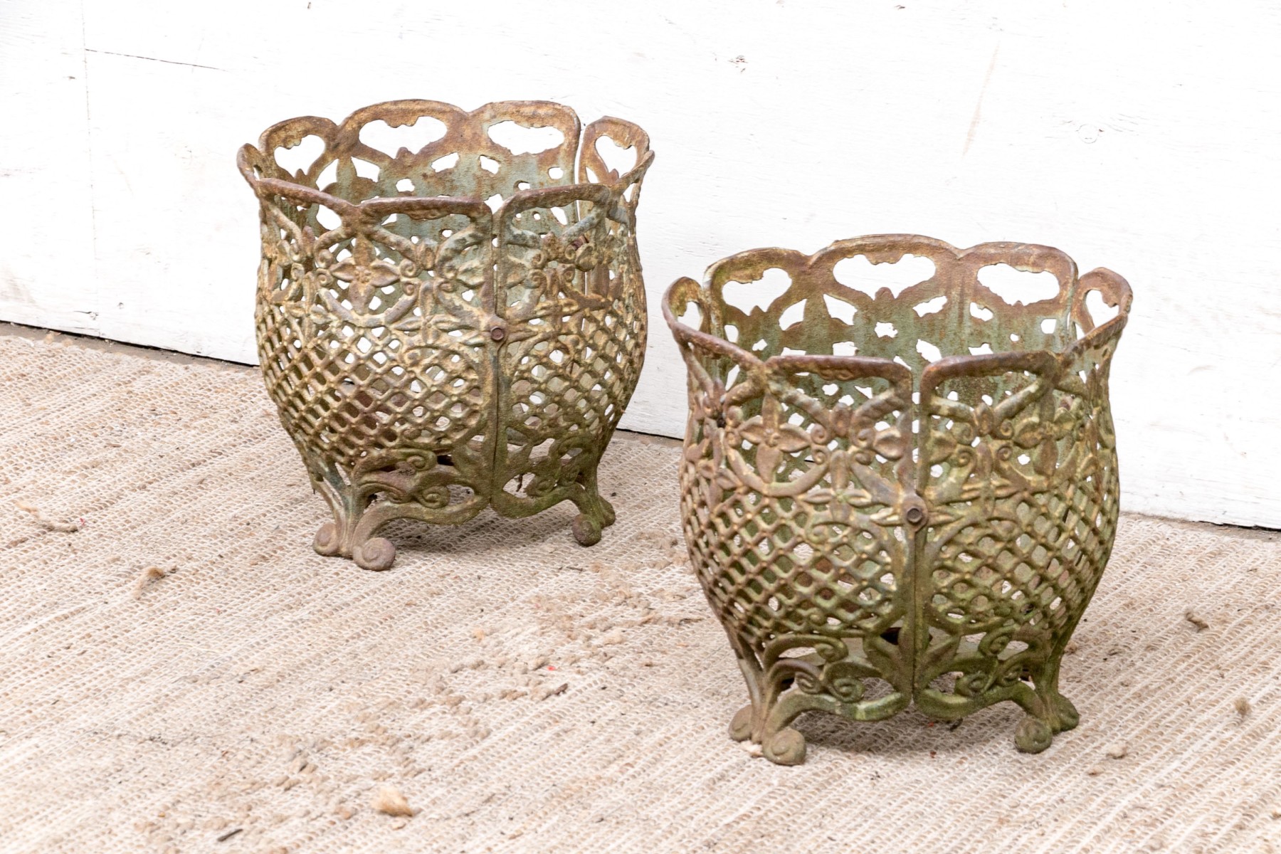 Pierced openwork and made in three parts. Green painted with hi lights of rust coming through in a very charming way. Potted plants are meant to sit inside these decorative jardinieres.