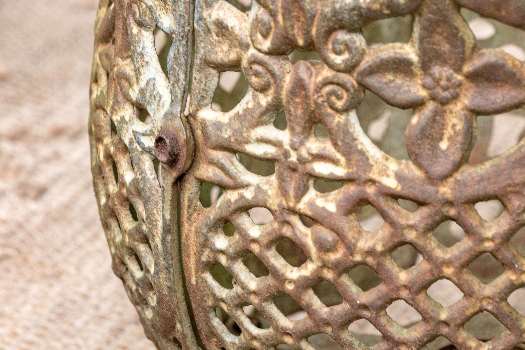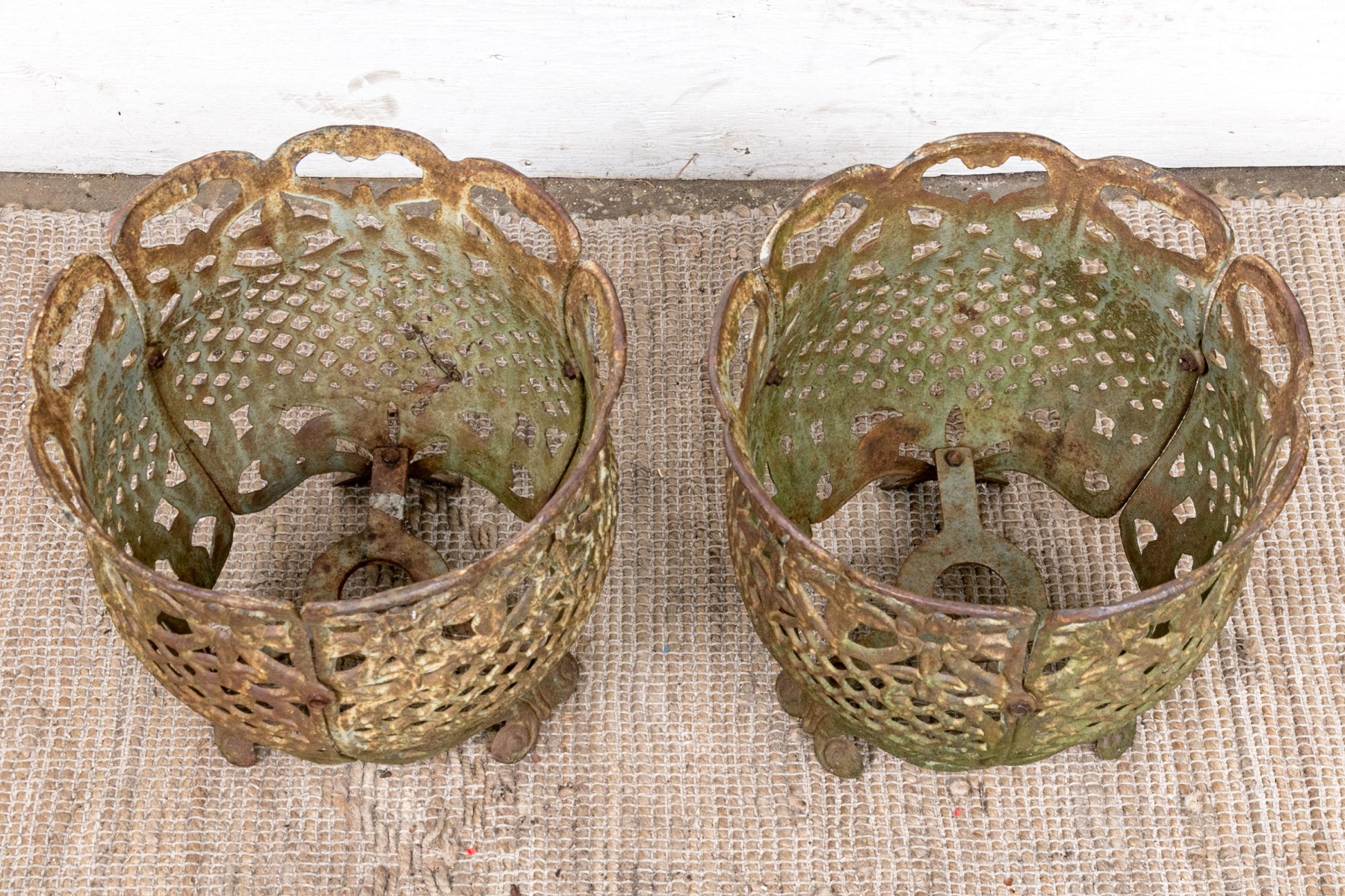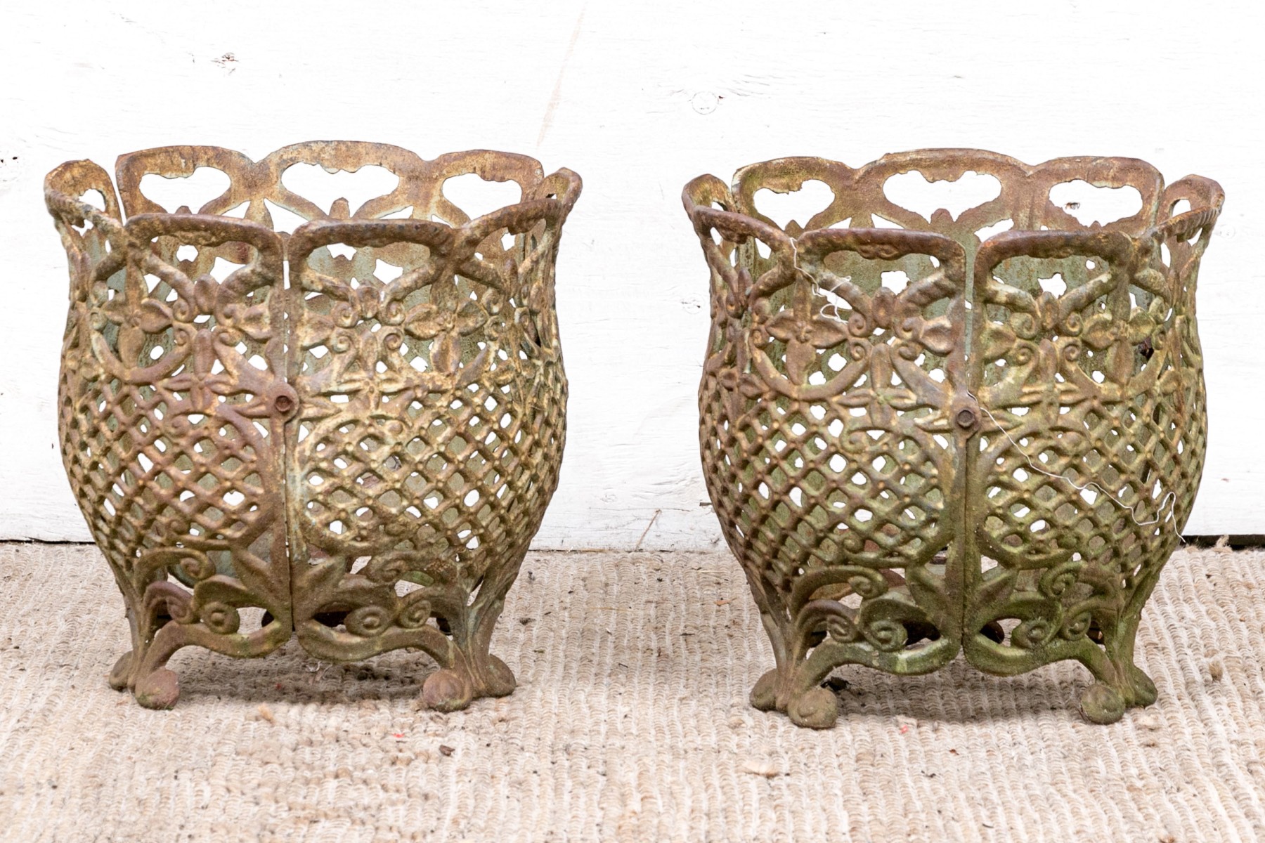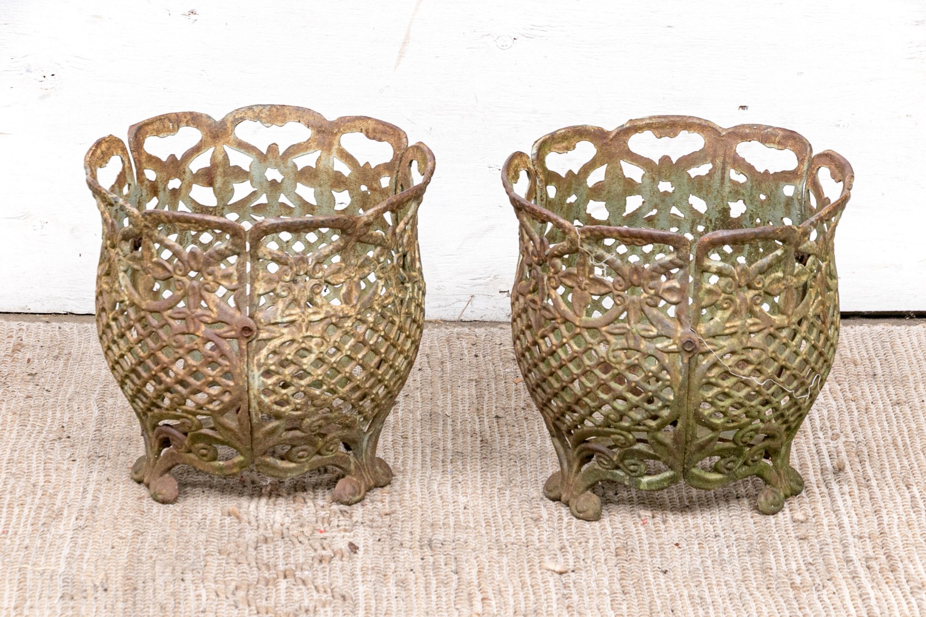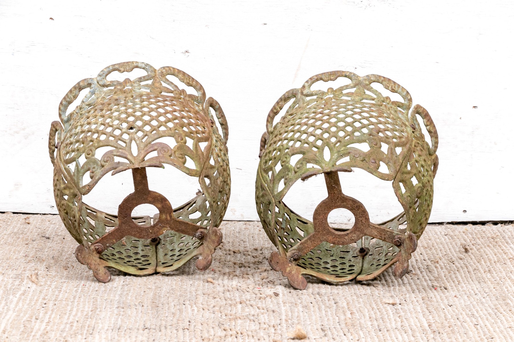 Pierced openwork and made in three parts. Green painted with hi lights of rust coming through in a very charming way. Potted plants are meant to sit inside these decorative jardinieres.