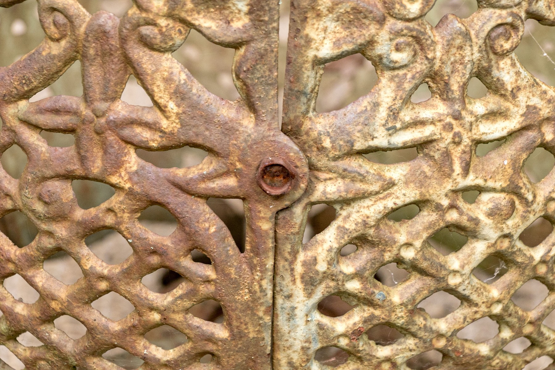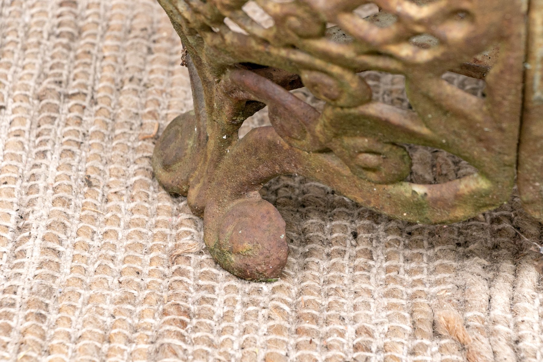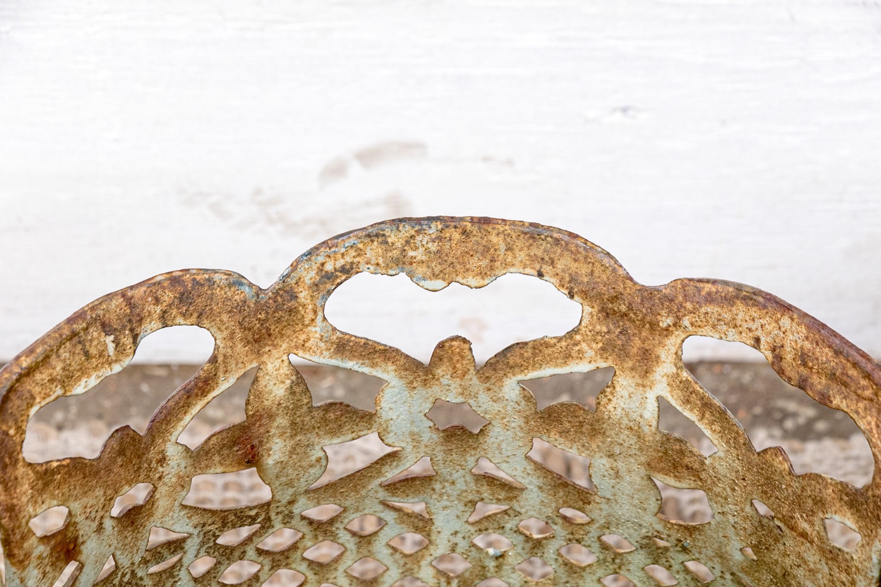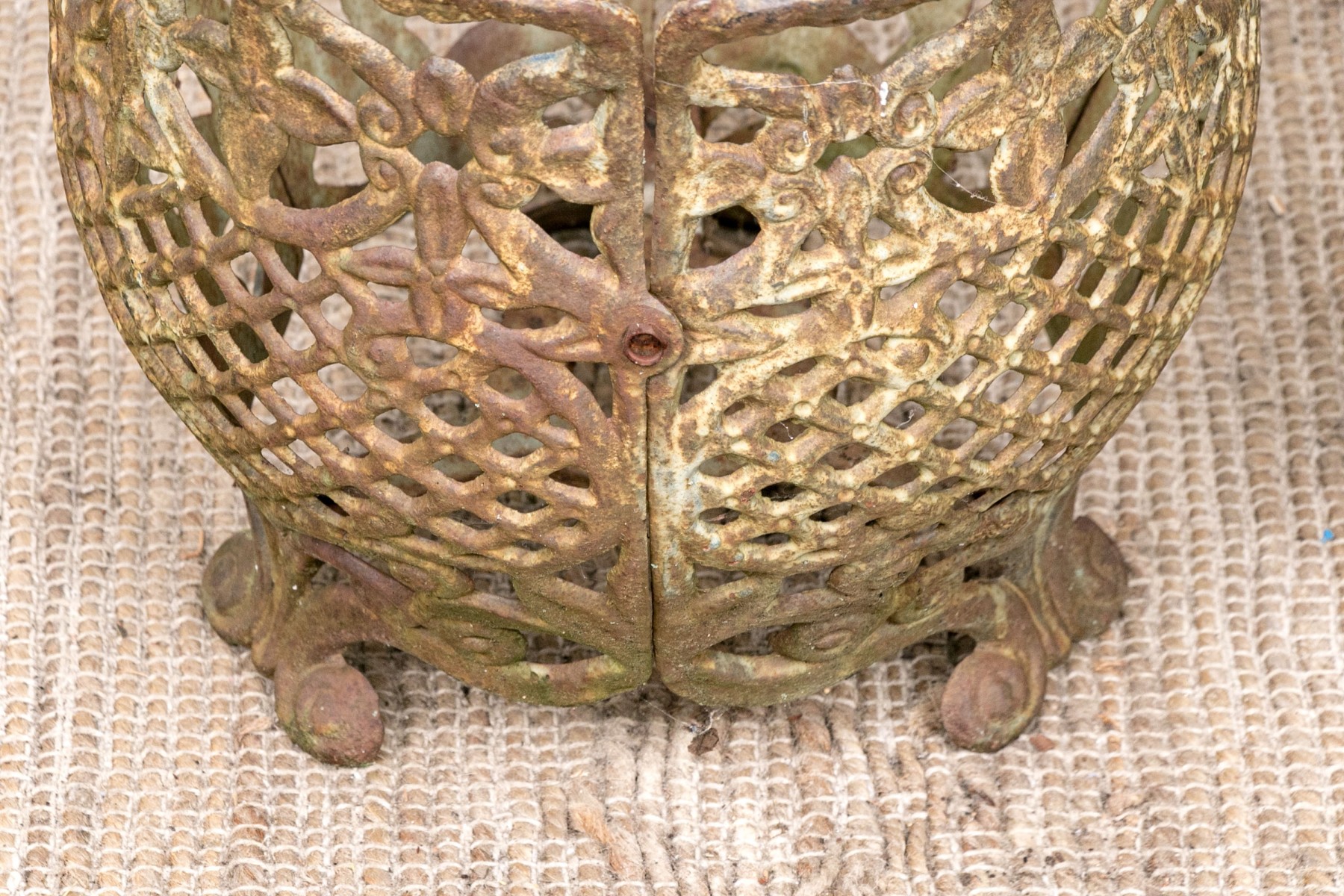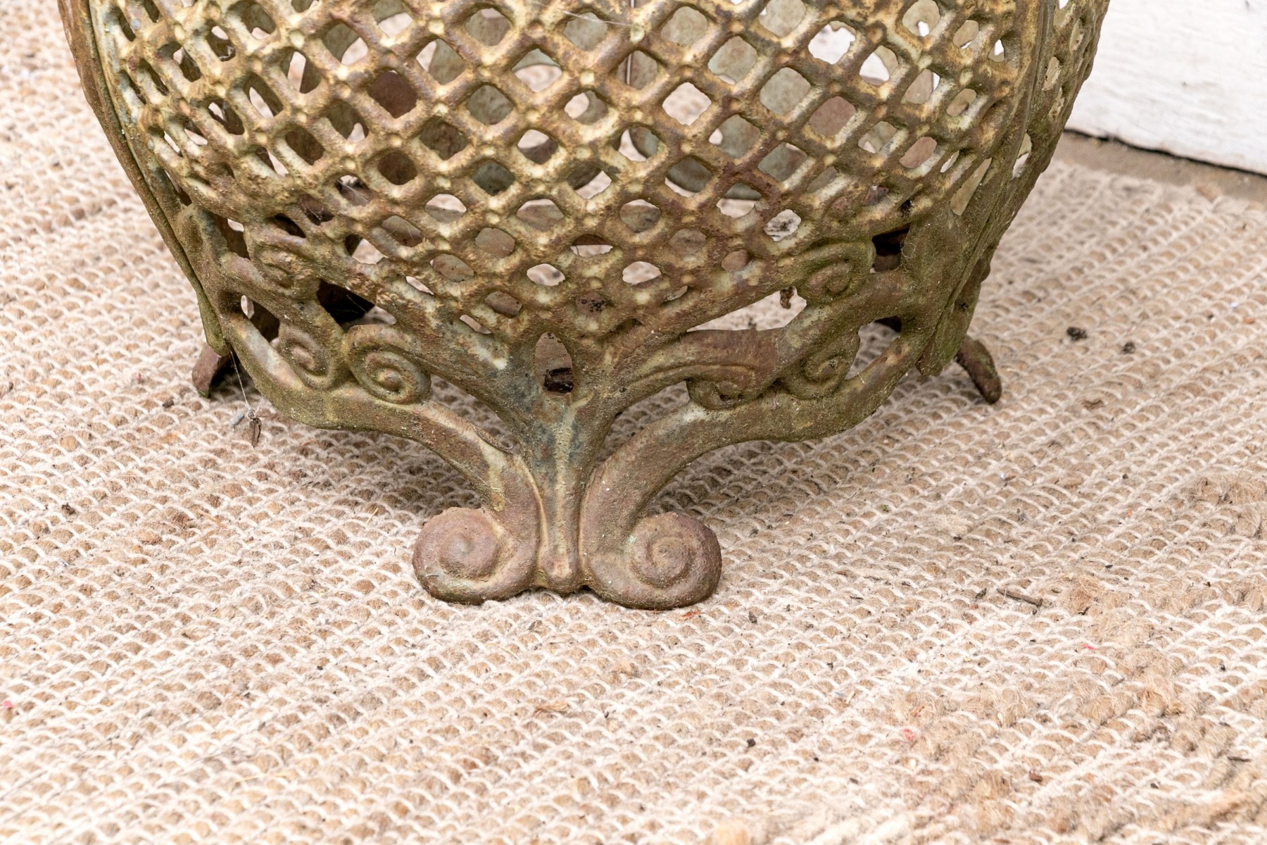 Pierced openwork and made in three parts. Green painted with hi lights of rust coming through in a very charming way. Potted plants are meant to sit inside these decorative jardinieres.