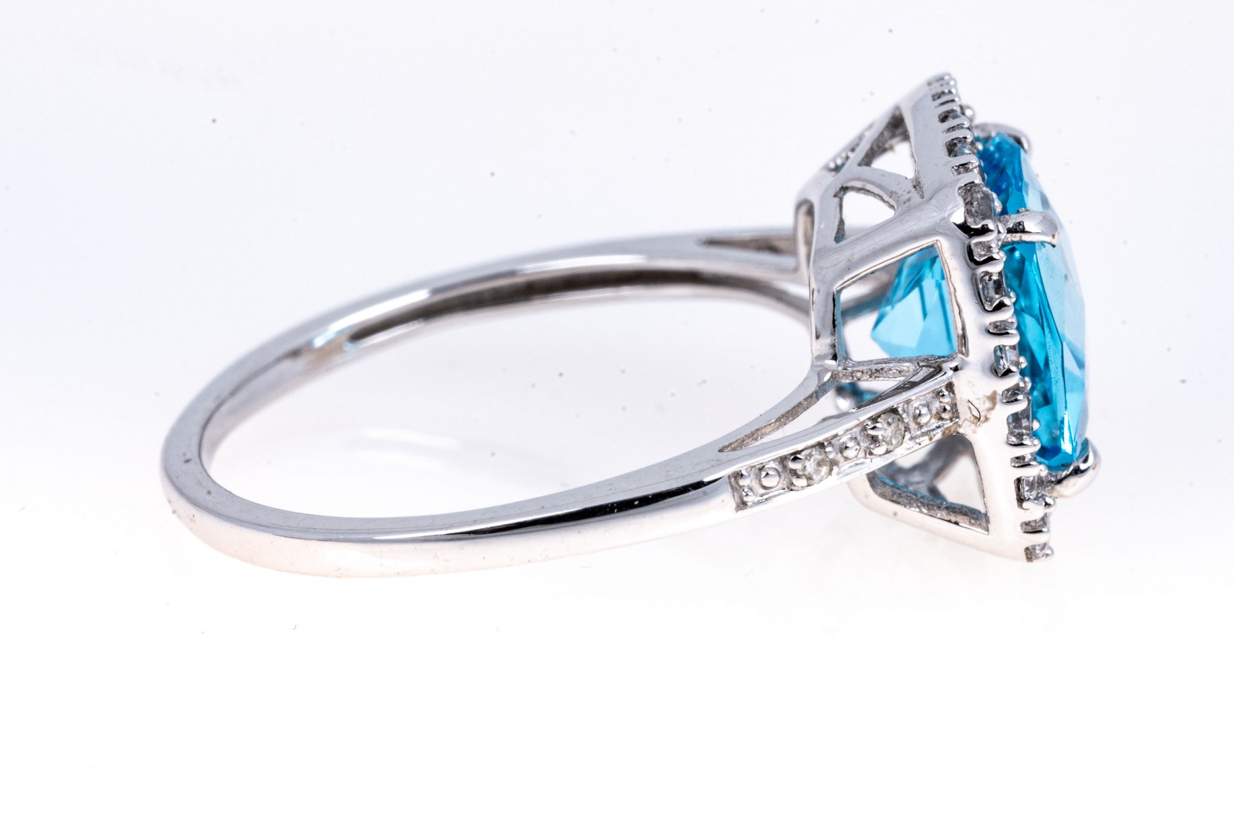 10K white gold ring set with a large cushion cut blue topaz. This vibrant blue topaz, approximately 3.45 CTS, is set within a halo of round cut white topaz, and extending down the shanks for added brilliance are two round faceted accent diamonds, approximately 0.01 TCW.