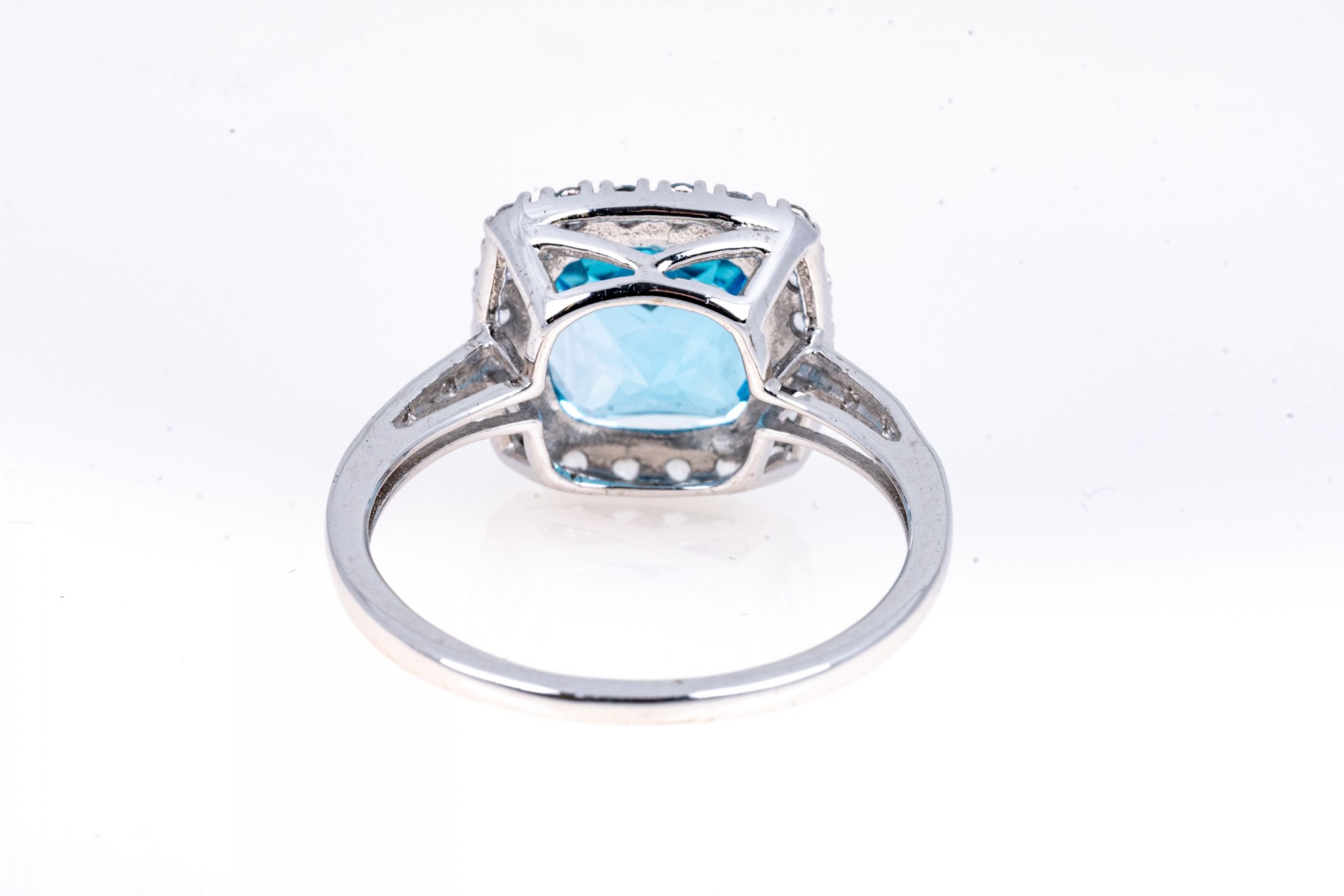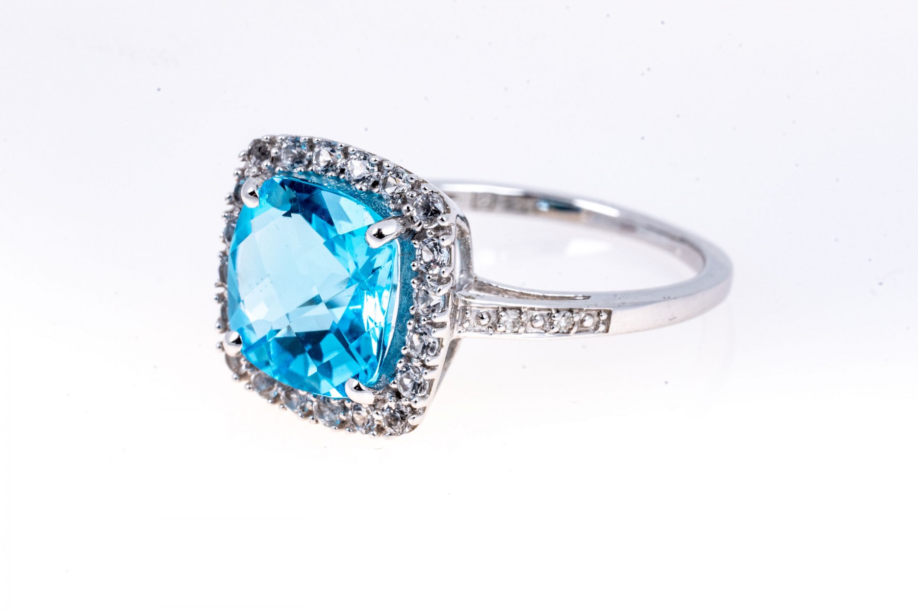 10K white gold ring set with a large cushion cut blue topaz. This vibrant blue topaz, approximately 3.45 CTS, is set within a halo of round cut white topaz, and extending down the shanks for added brilliance are two round faceted accent diamonds, approximately 0.01 TCW.