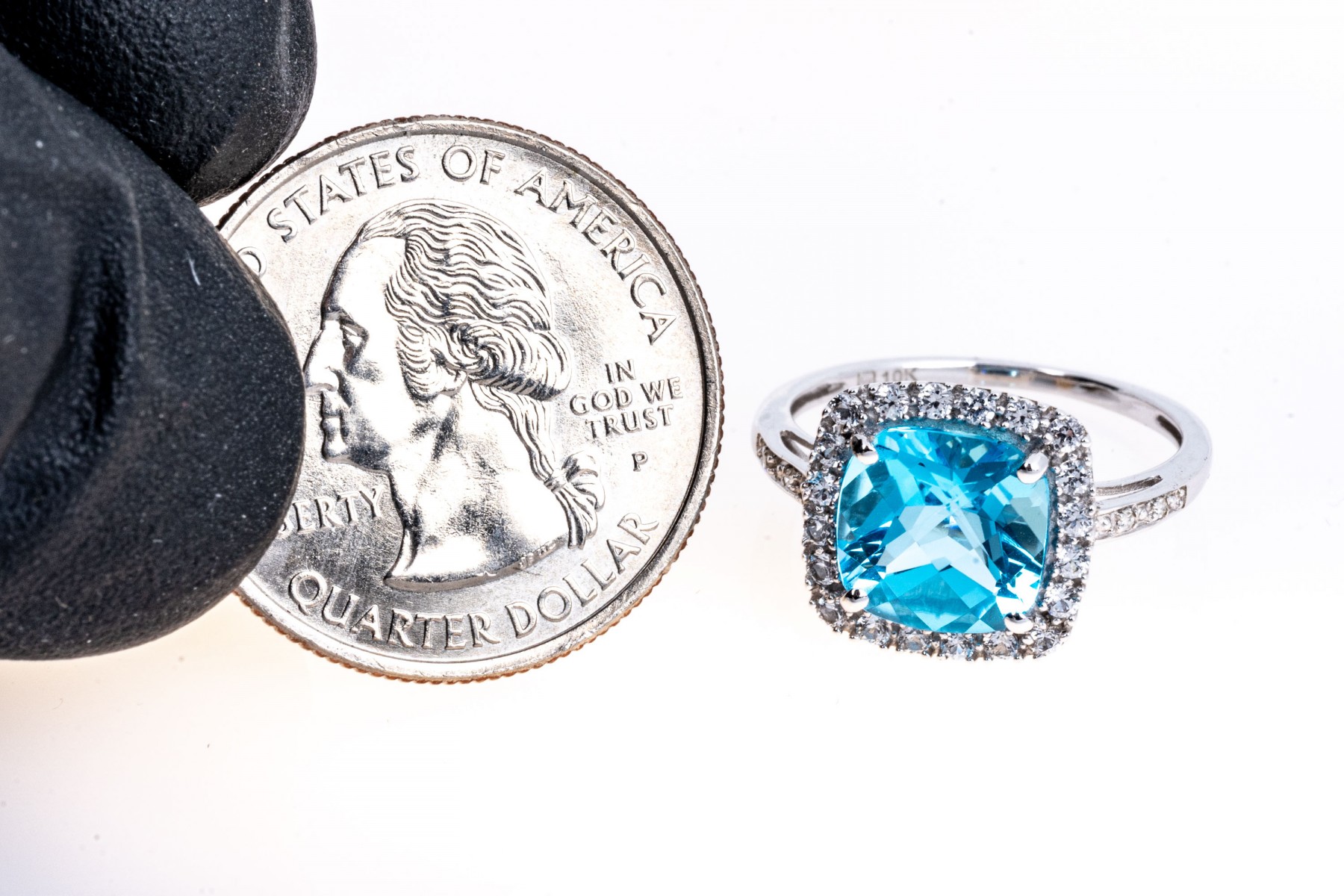 10K white gold ring set with a large cushion cut blue topaz. This vibrant blue topaz, approximately 3.45 CTS, is set within a halo of round cut white topaz, and extending down the shanks for added brilliance are two round faceted accent diamonds, approximately 0.01 TCW.
