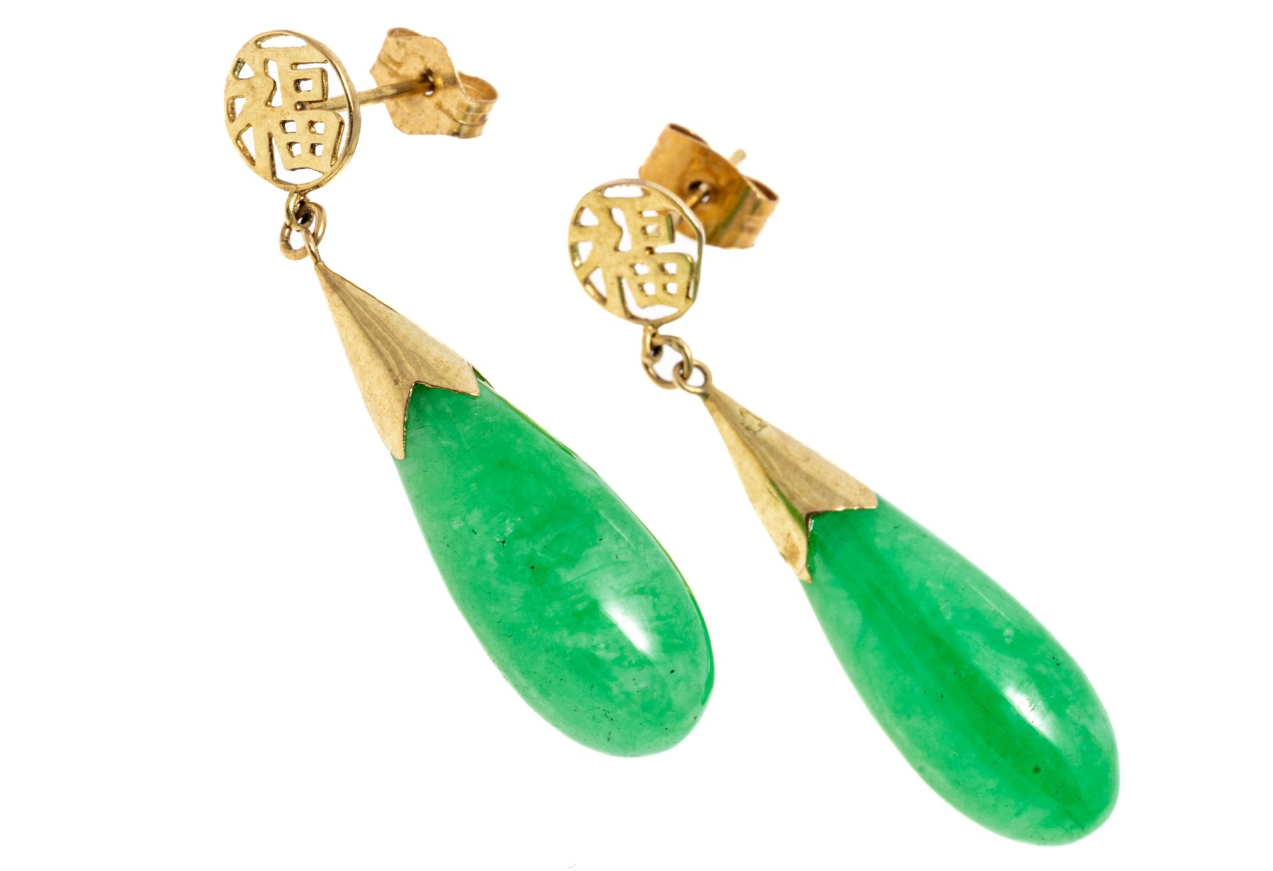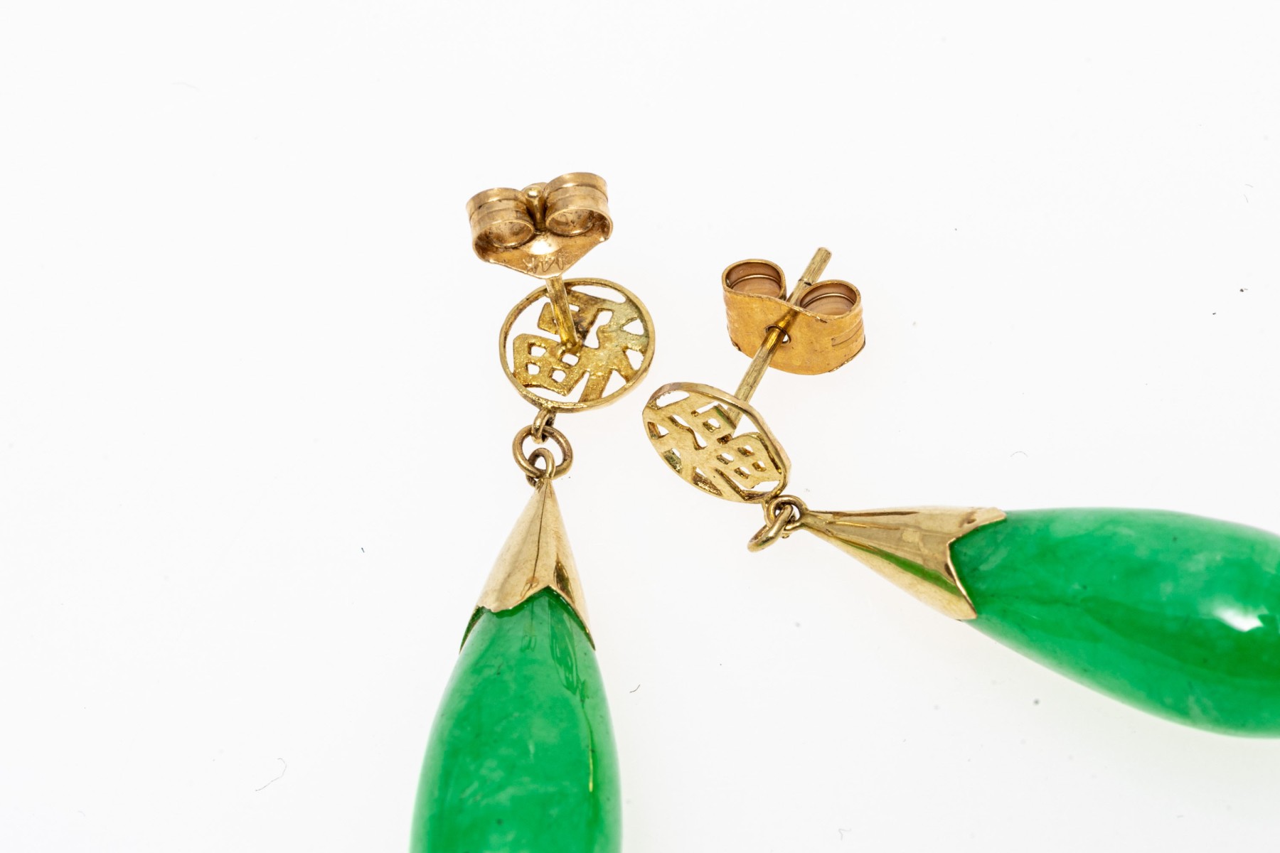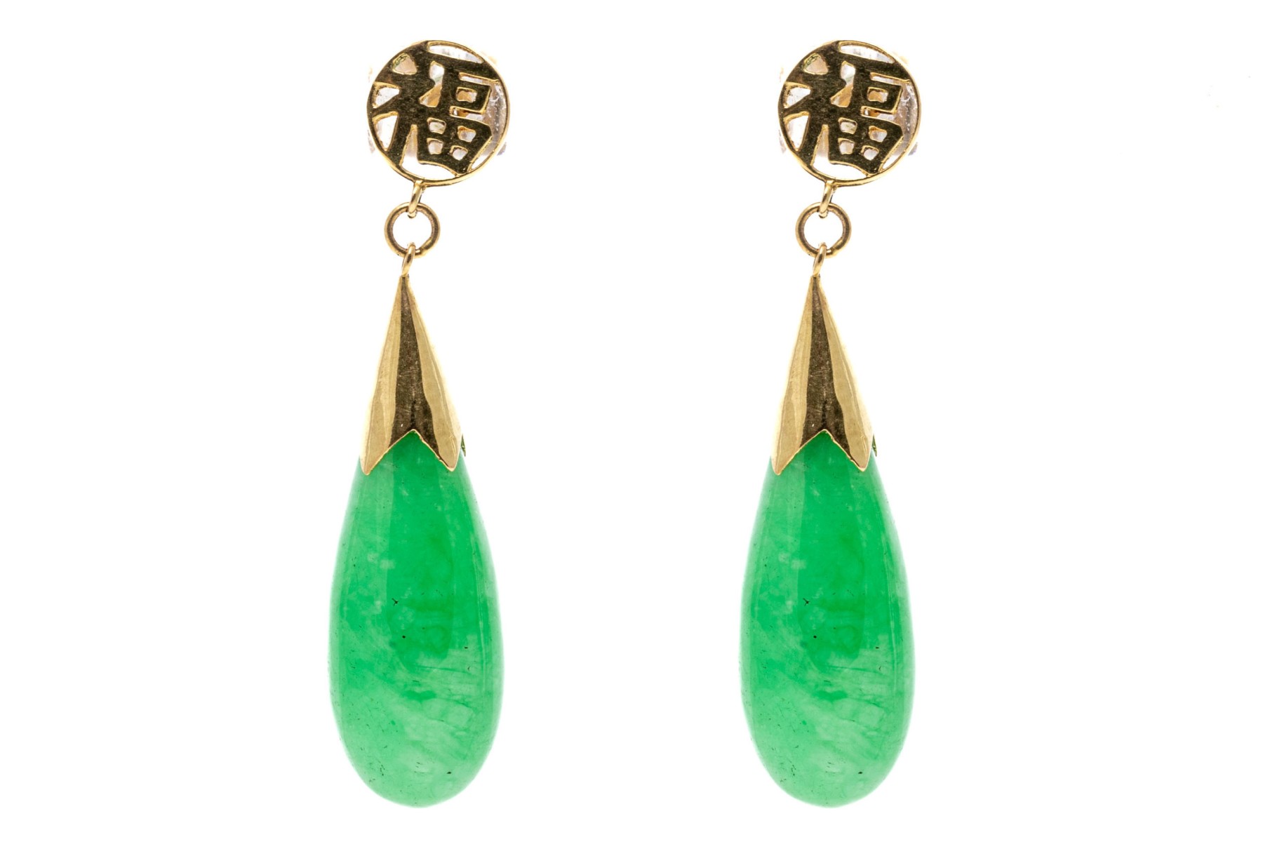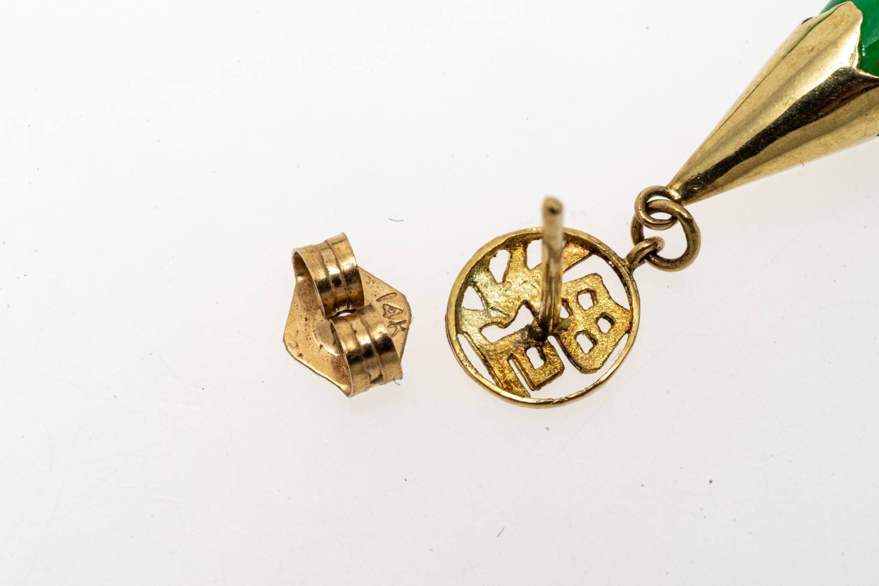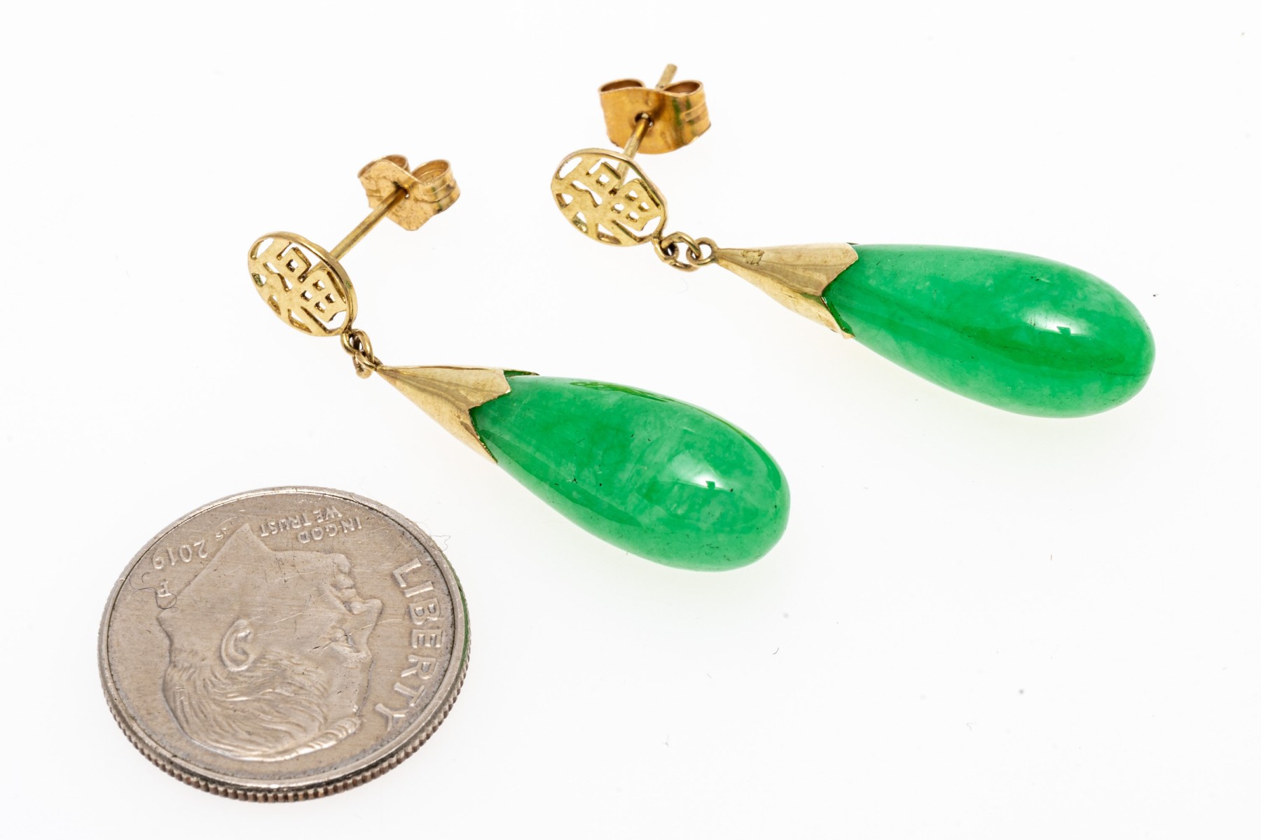 A pair of 14K yellow gold pendant style earrings. The earrings display polished stones of bright green jadeite, 7.8mm. Post and clutch backings.